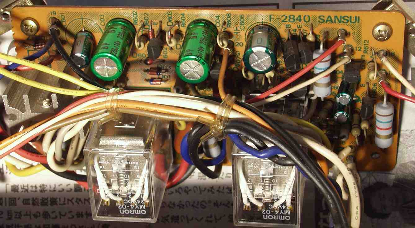 C−8B. 修理後 SP接続リレー・プロテクト基板 SP接続リレー2個、電解コンデンサー6個交換