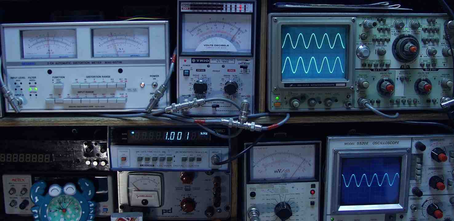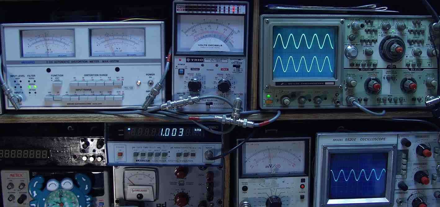 E−2A. 出力/歪み率測定・調整  出力=28V=98W 歪み率0.03% at=1000HZ AUX端子入力