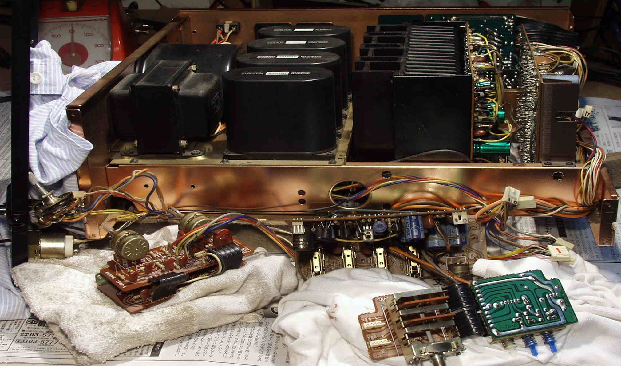 A−4. 修理中 メインAMPの入力コネクターも取り除かれ半田付けされている