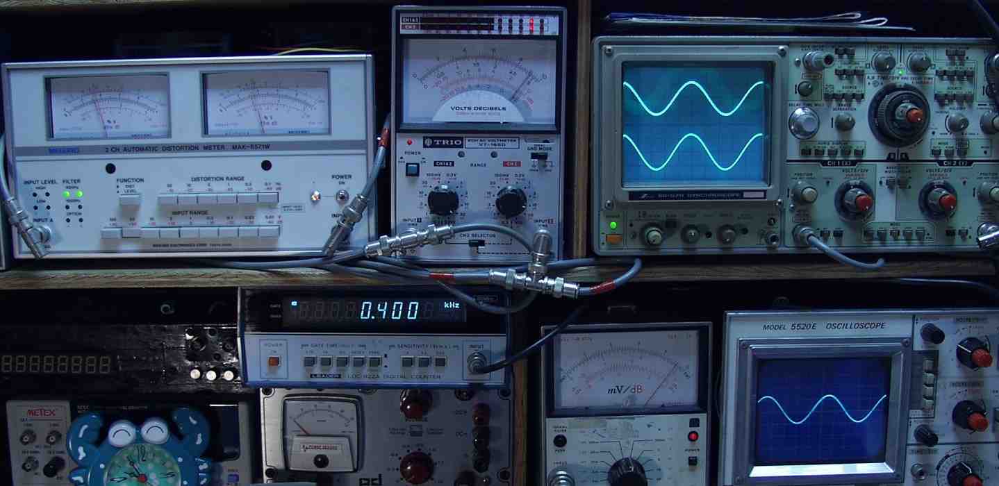E−4B. 出力/歪み率測定・調整  出力=28V=98W 歪み率0.05% at=400HZ MC端子入力