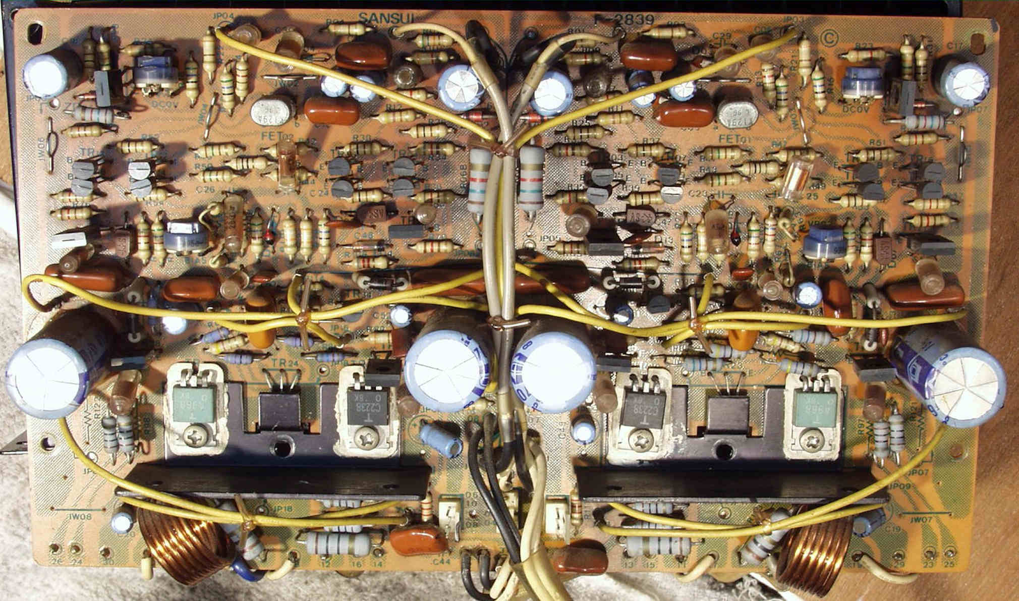 C−1B. 修理後 メイン・ドライブAMP基板 初段FET(電界効果トランジスター)2個、半固定VR4個、電解コンデンサー20個交換