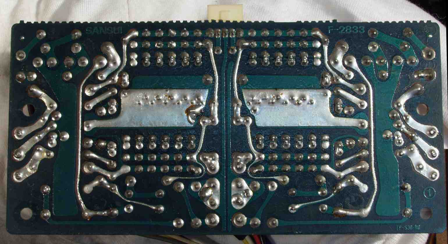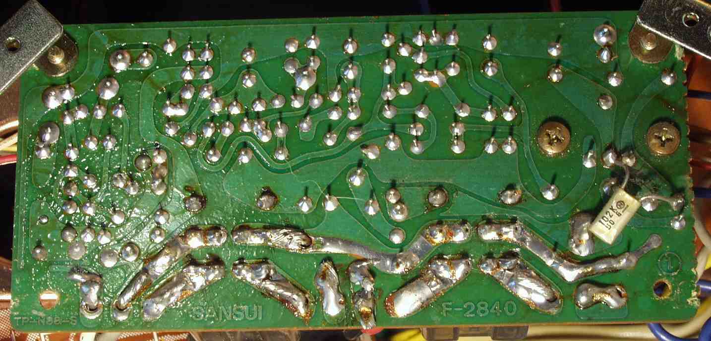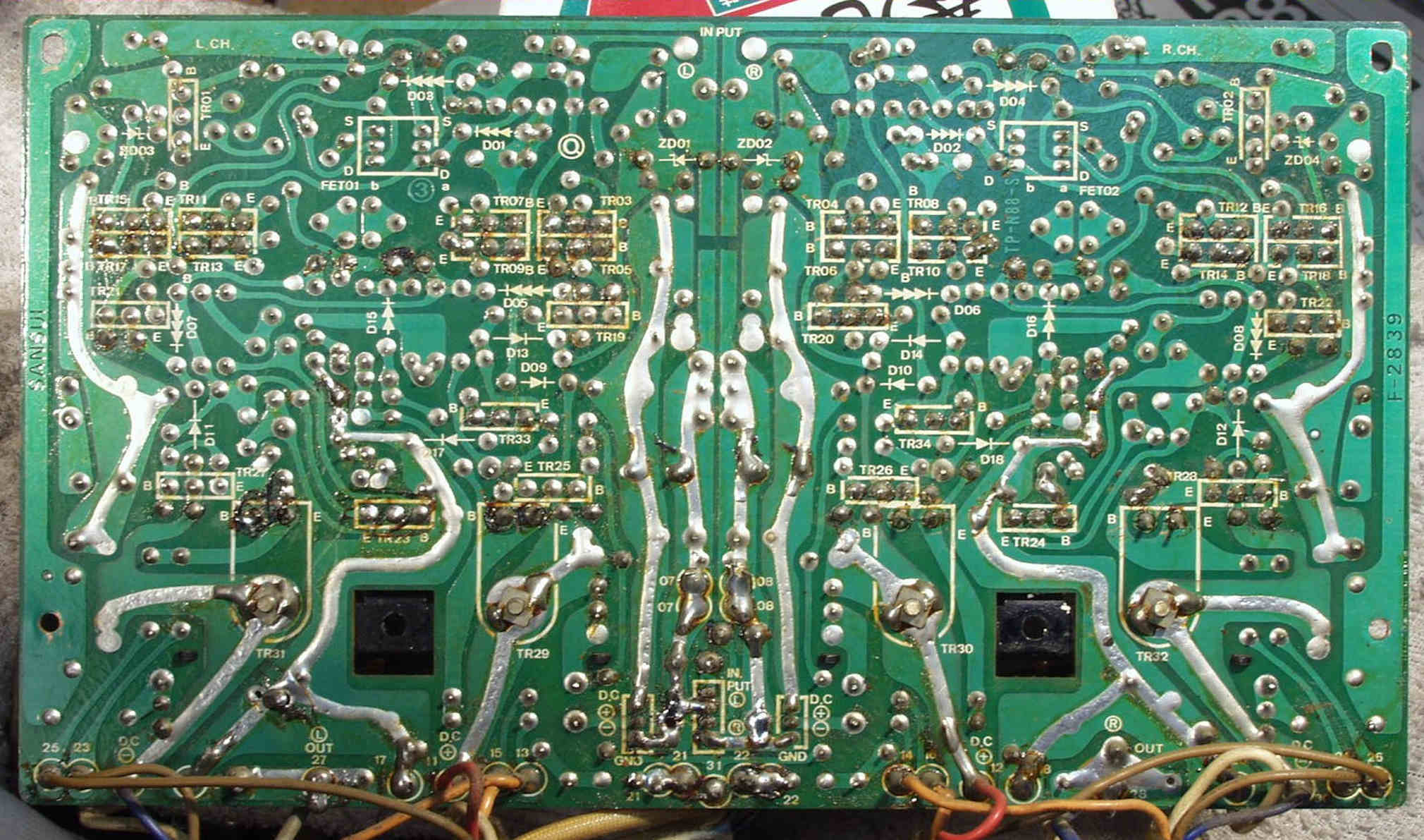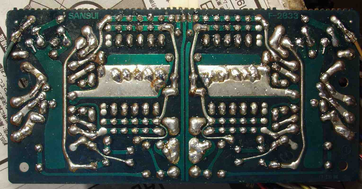 C−1C−2. 修理中 メイン・ドライブAMP基板裏 半田のりの悪いところ
