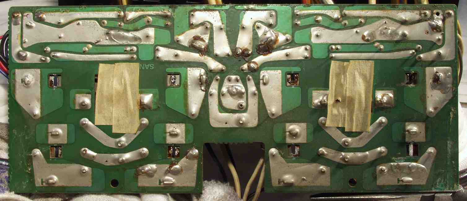 C−1C−1. 修理中 メイン・ドライブAMP基板裏 半田不良箇所
