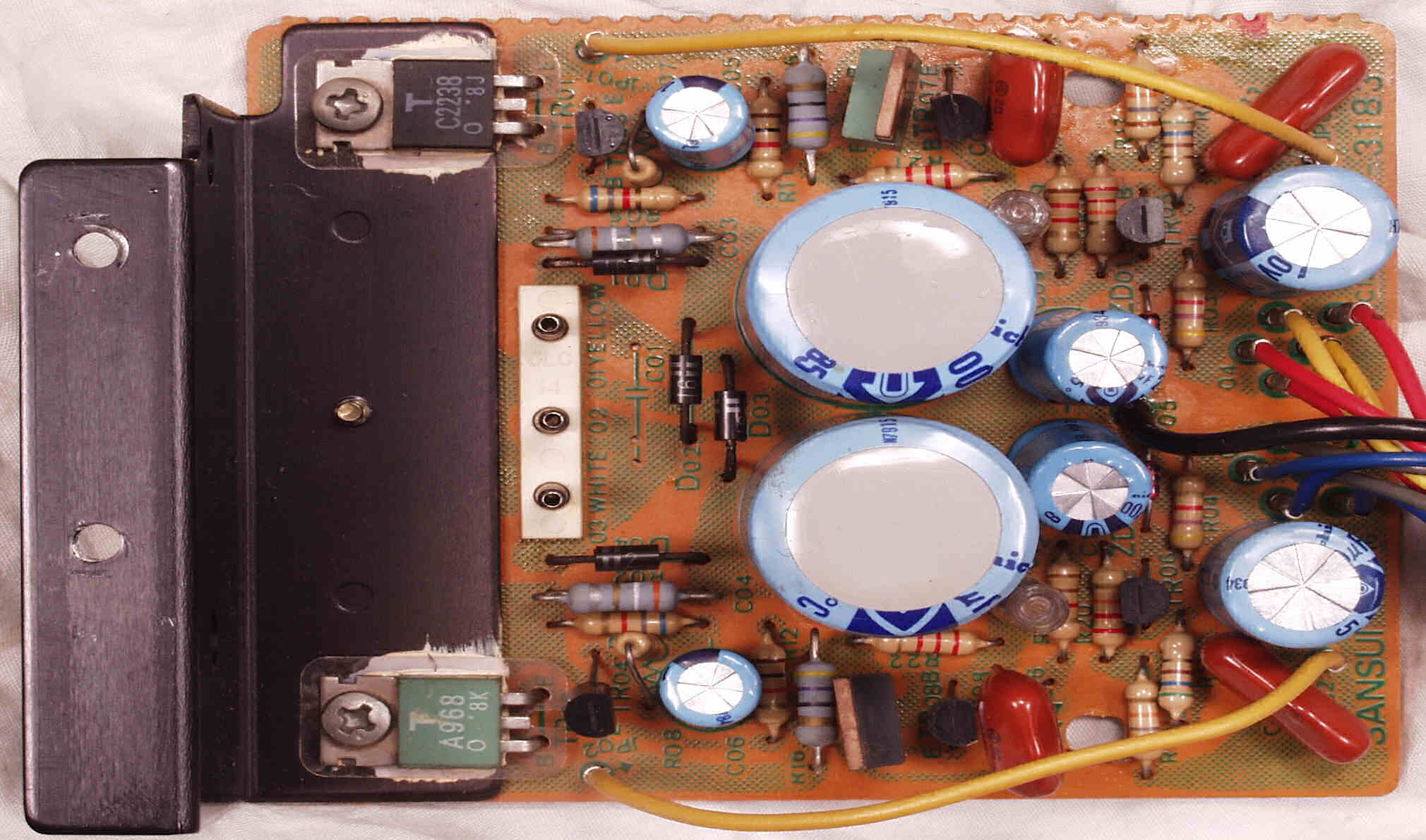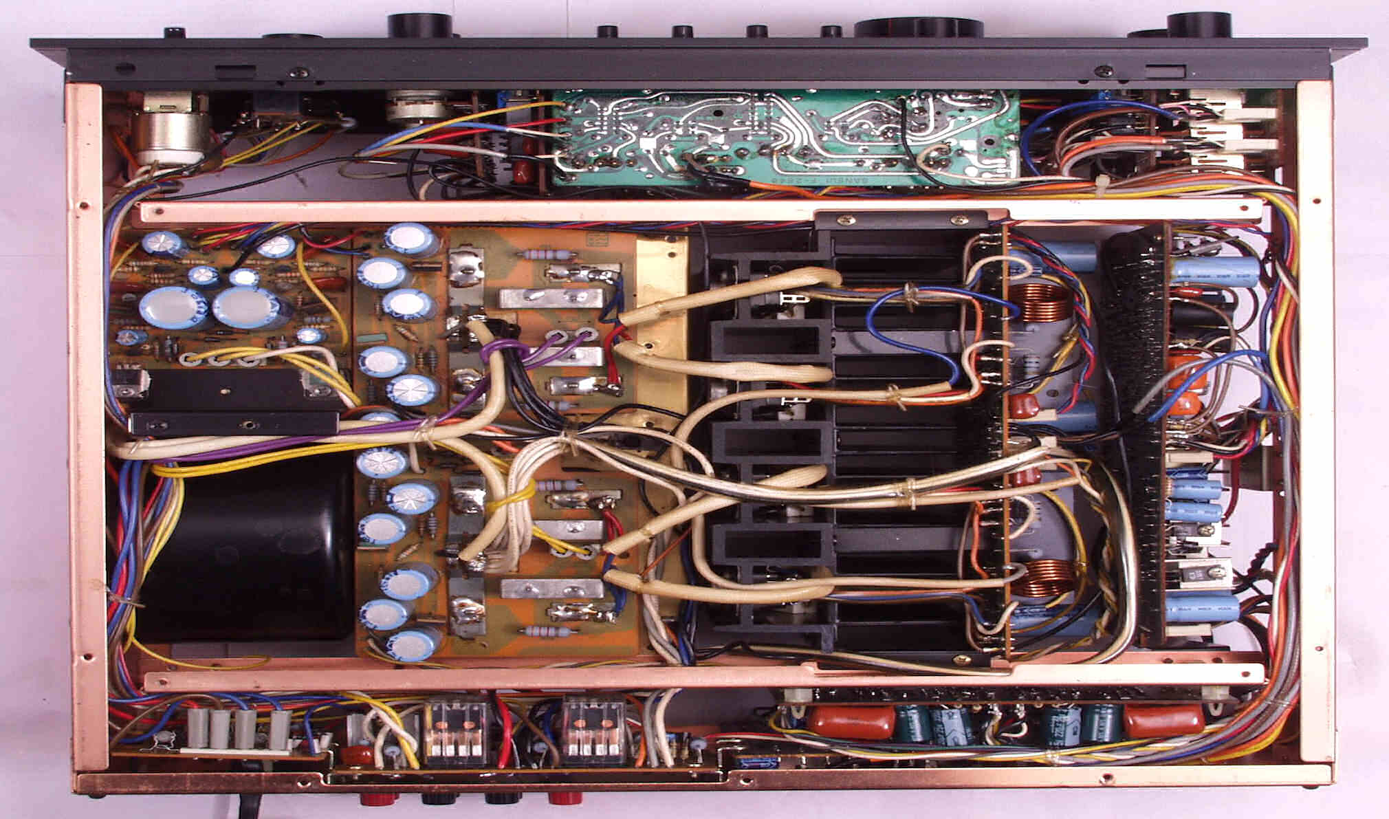 | C−2C. 修理後 FLAT−AMP基板 FET(電界効果トランジスター)2個、TR(トランジスター)4個、半固定VR2個、電解コンデンサー12個交換、フイルムコンデンサー2個追加 |