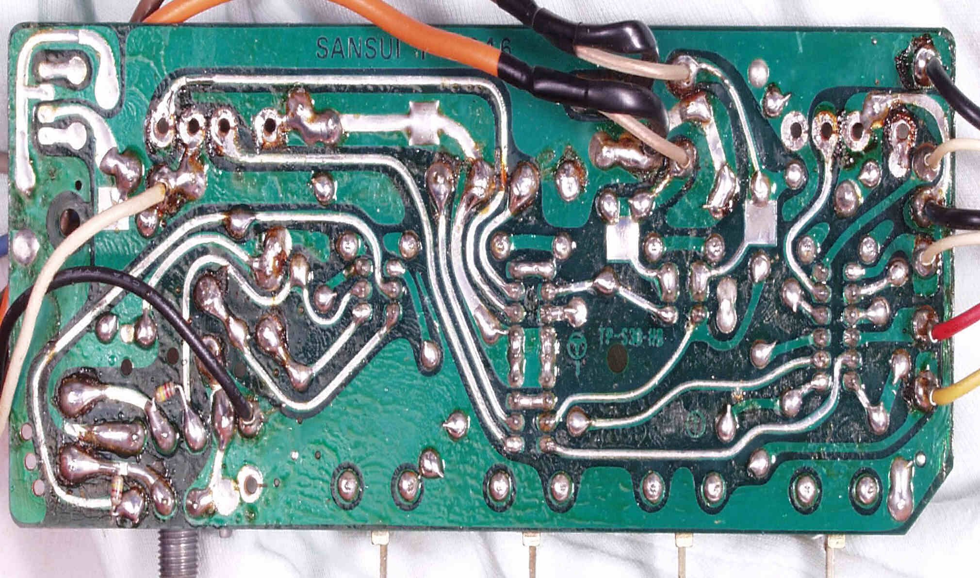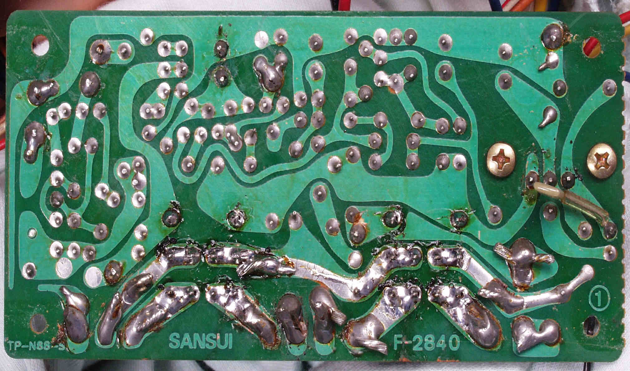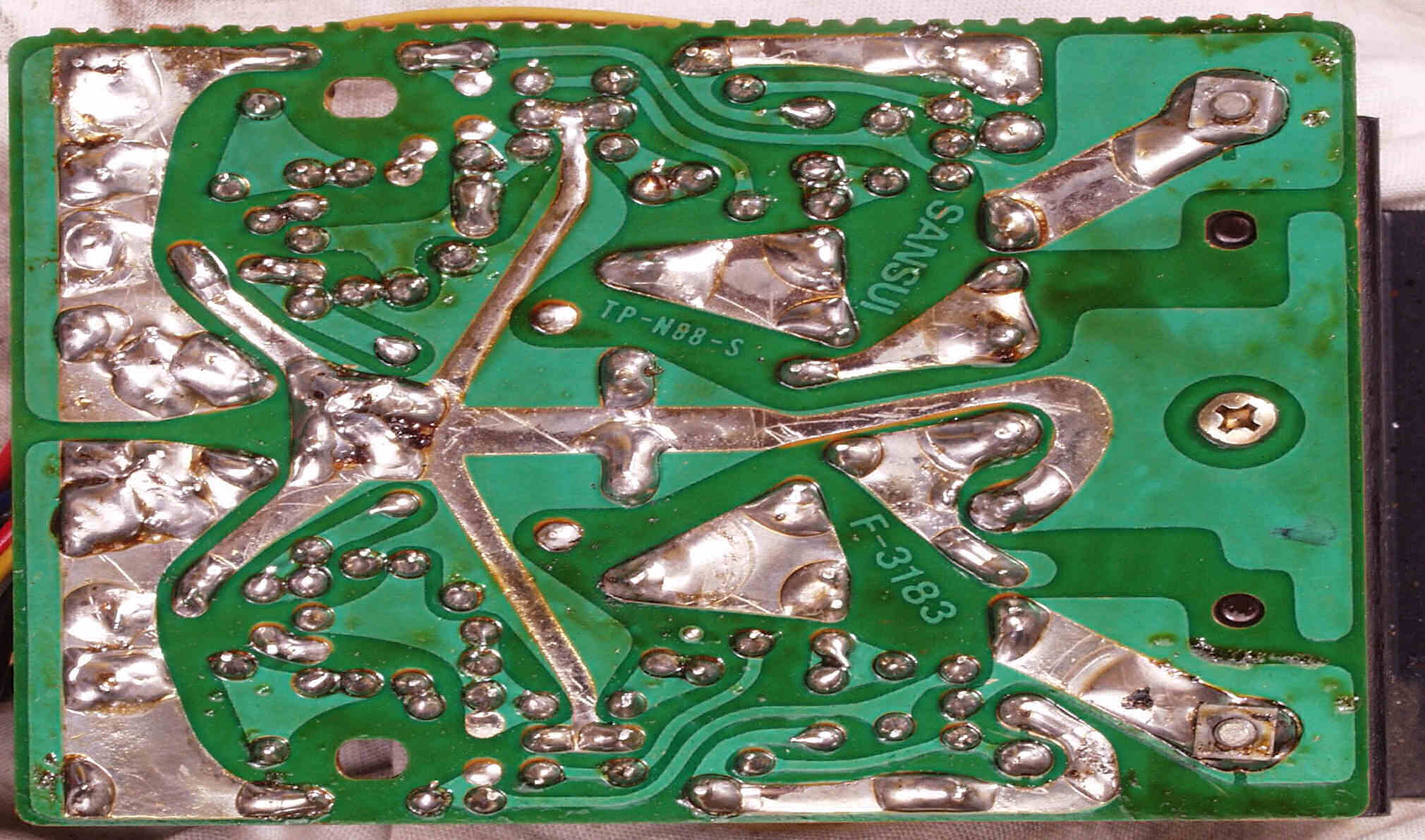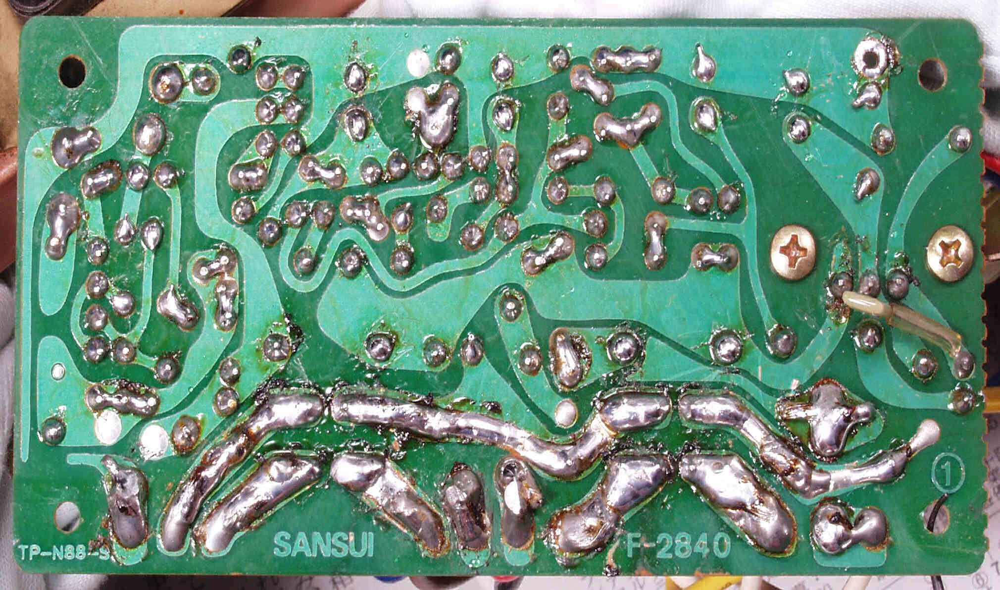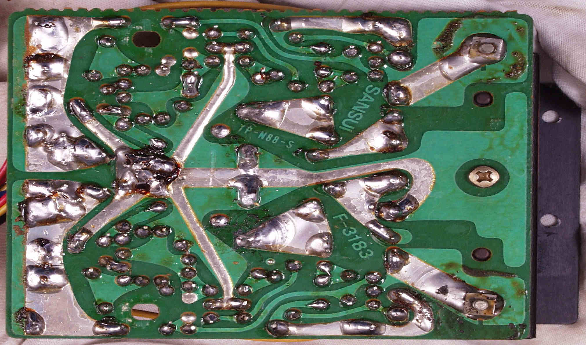 | C−3A−1. 修理前 電源整流基板 半田球が着いたまま、良く落ちなかったものです | ||||||||||||||||||||||||||||||||||||||||||||||||||||||||||||||||||||||||||||