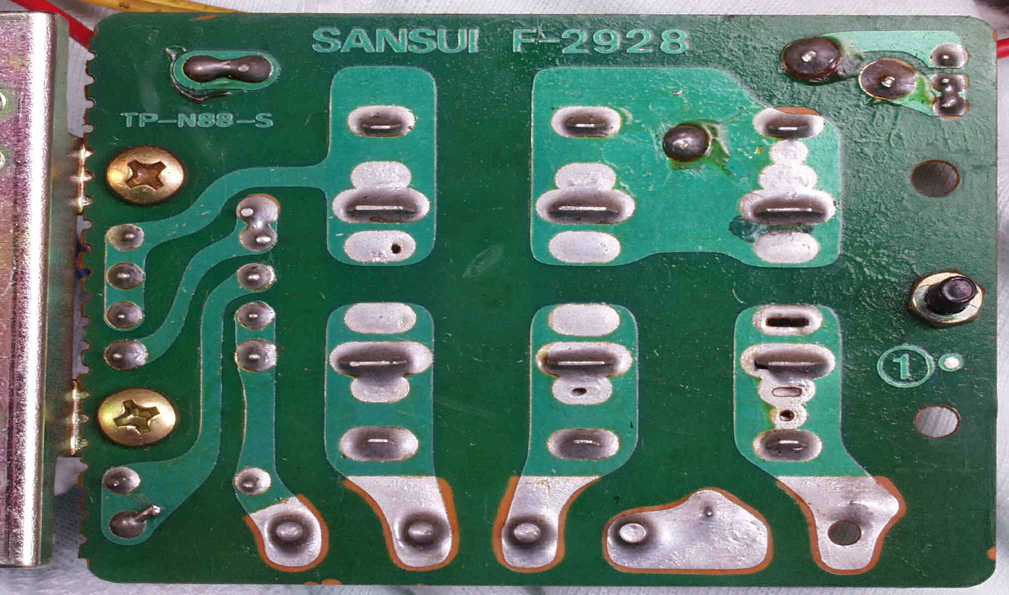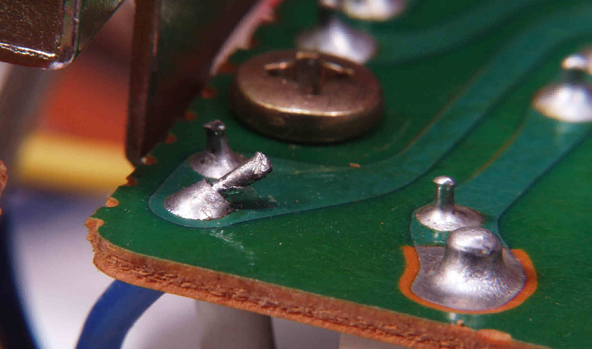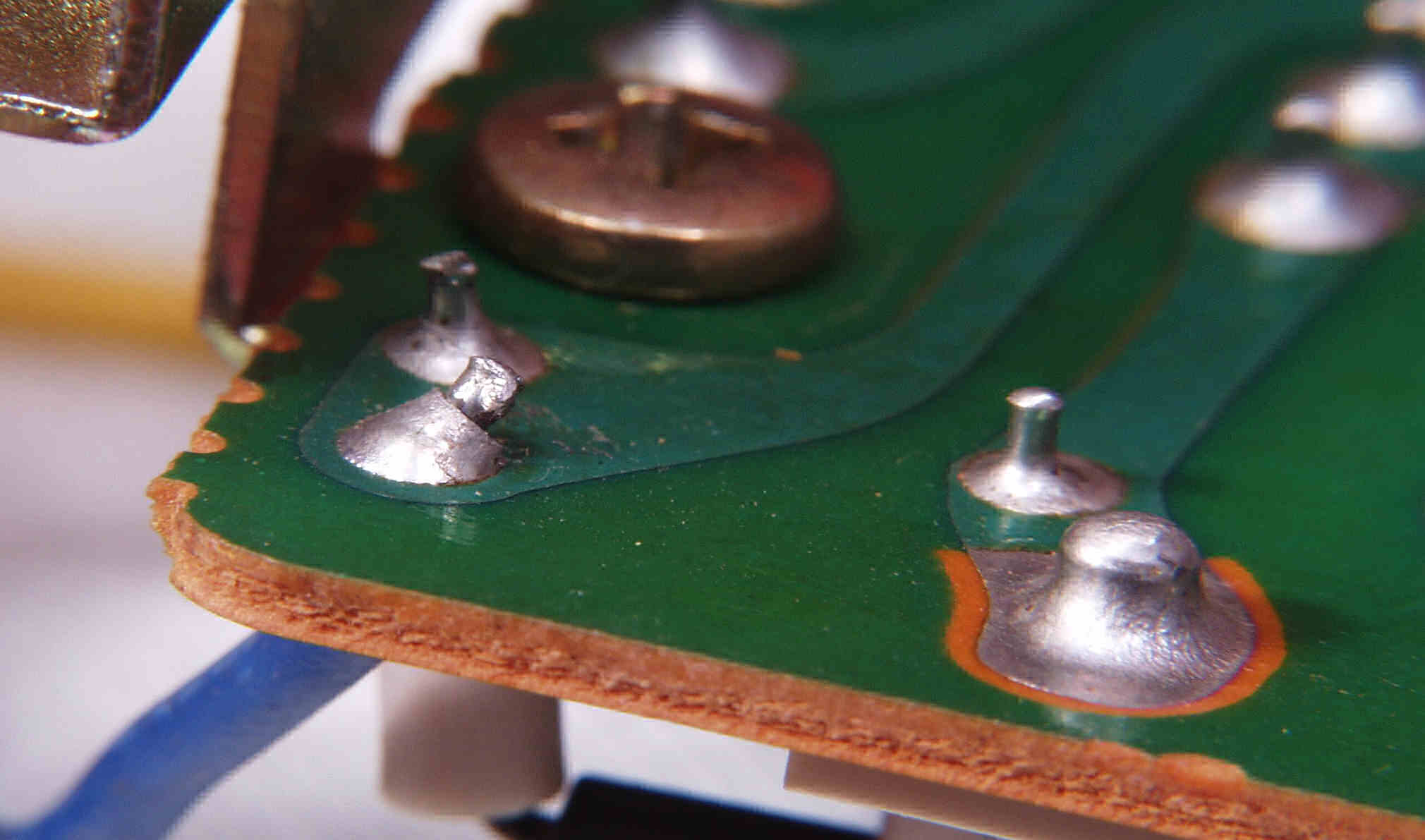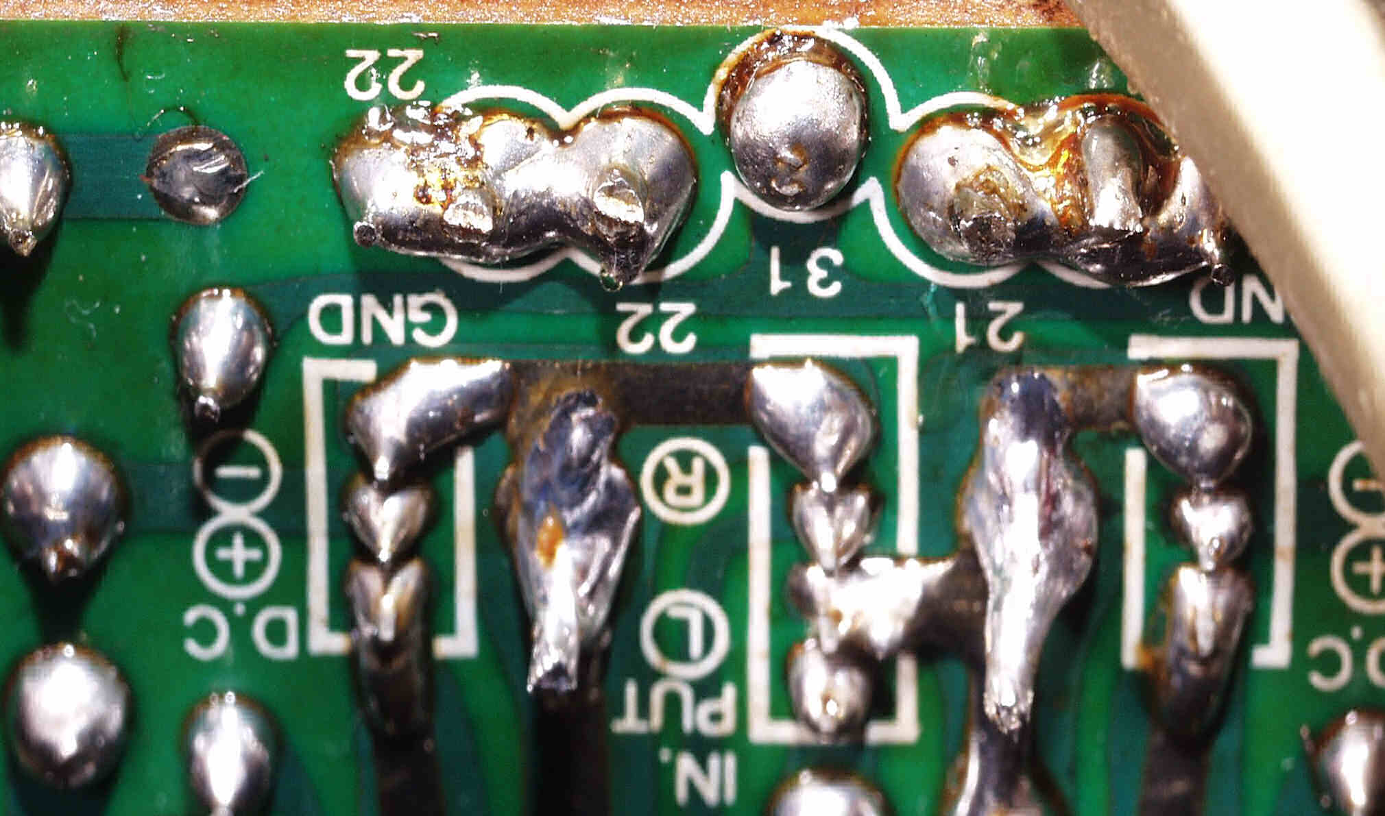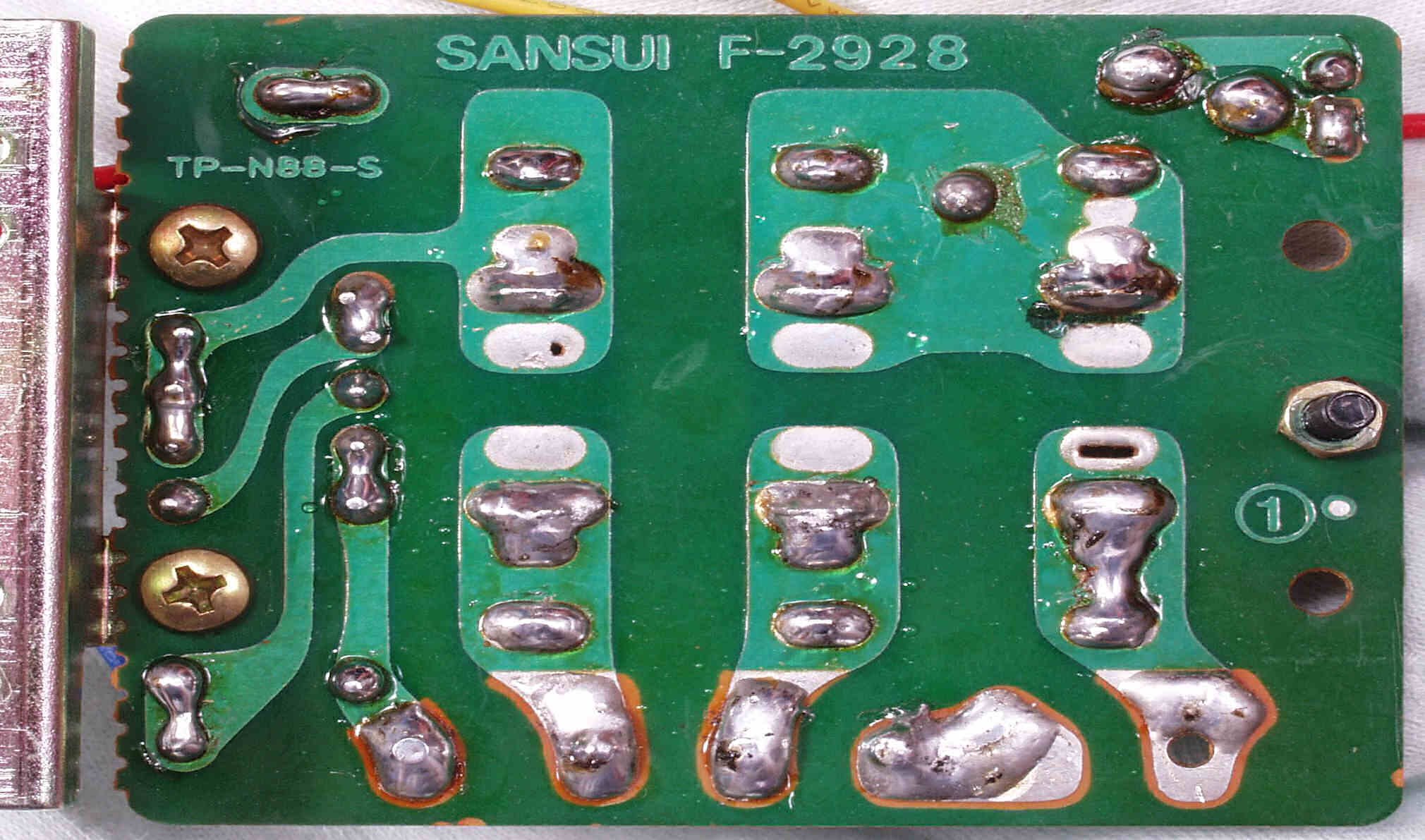 | C−5D. 修理(半田補正)後 プリメインRCA端子裏 太いケーブルを付けるのでRCA端子は十分に半田盛る | ||||||||||||||||||||||||||||||||||||||||||||||||||||||||||||||||||||||||||||