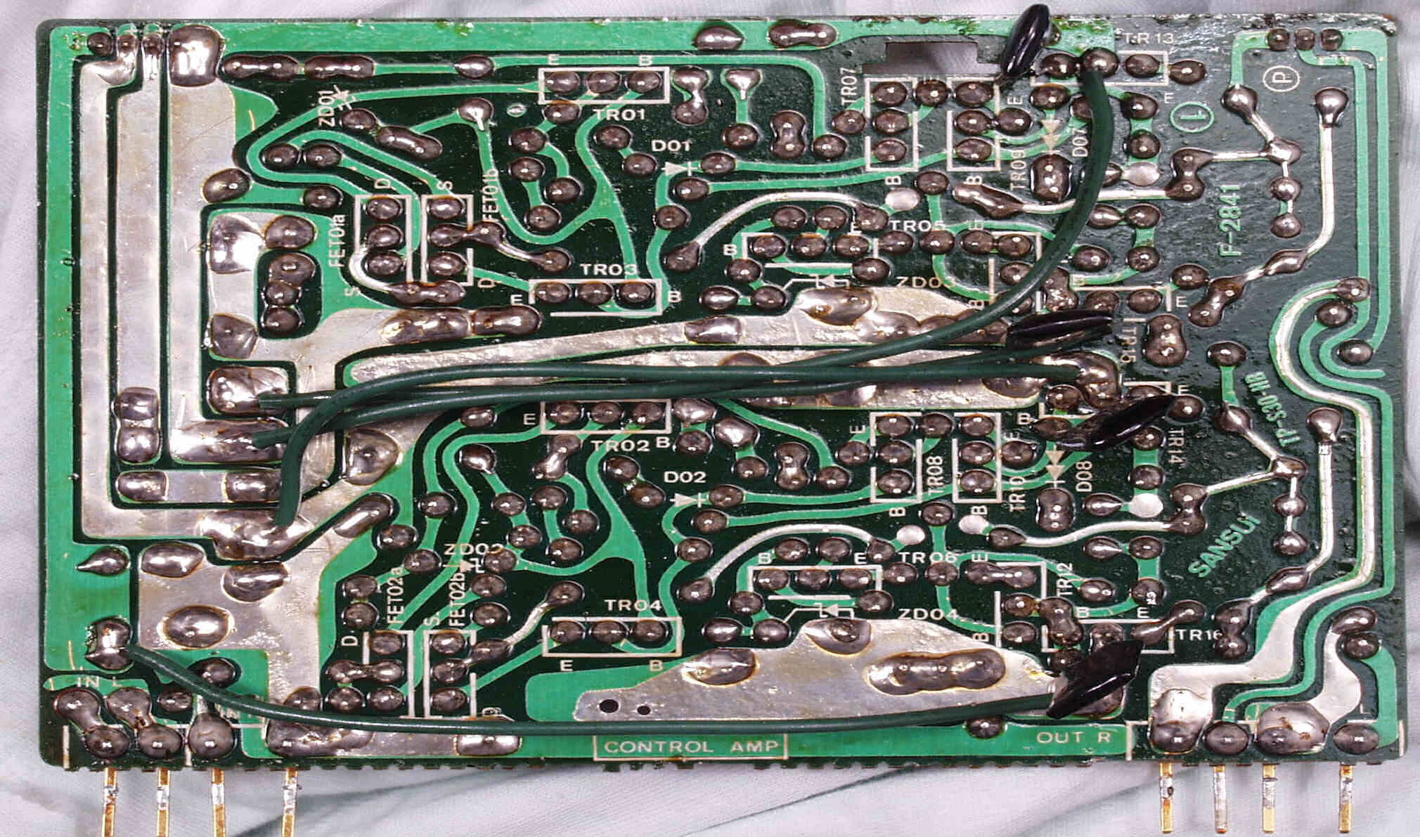 | C−1F. 修理中 メイン・ドライブAMP基板裏 アースラインの接続,、普通は基板の裏からだが、銅箔保護の為表から差し込む | ||||||||||||||||||||||||||||||||||||||||||||||||||||||||||||||||||||||||||||