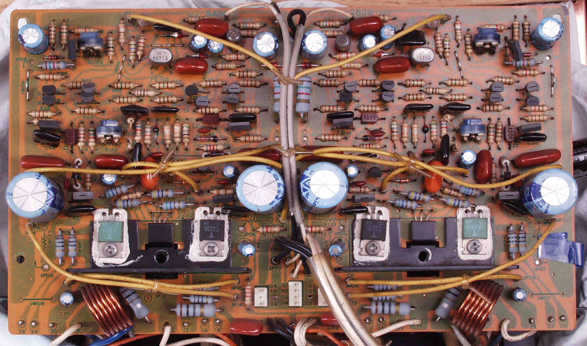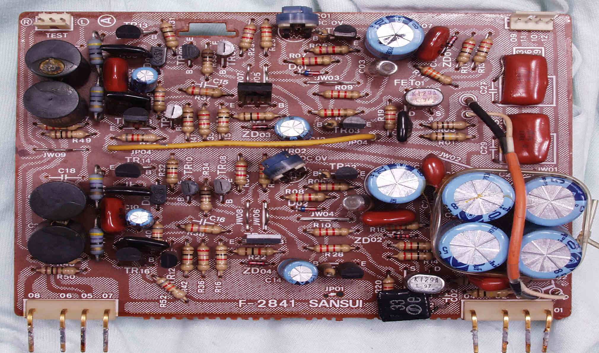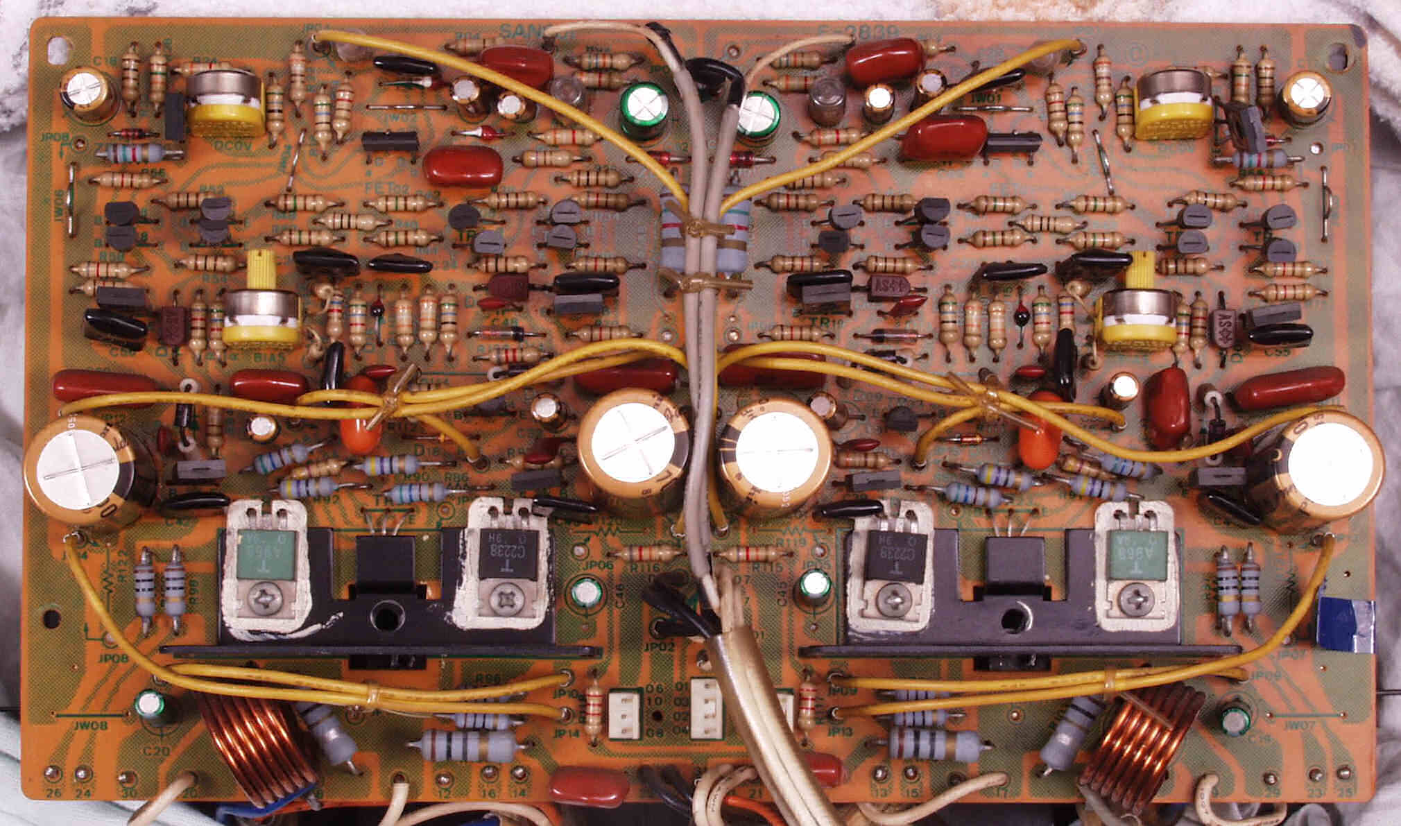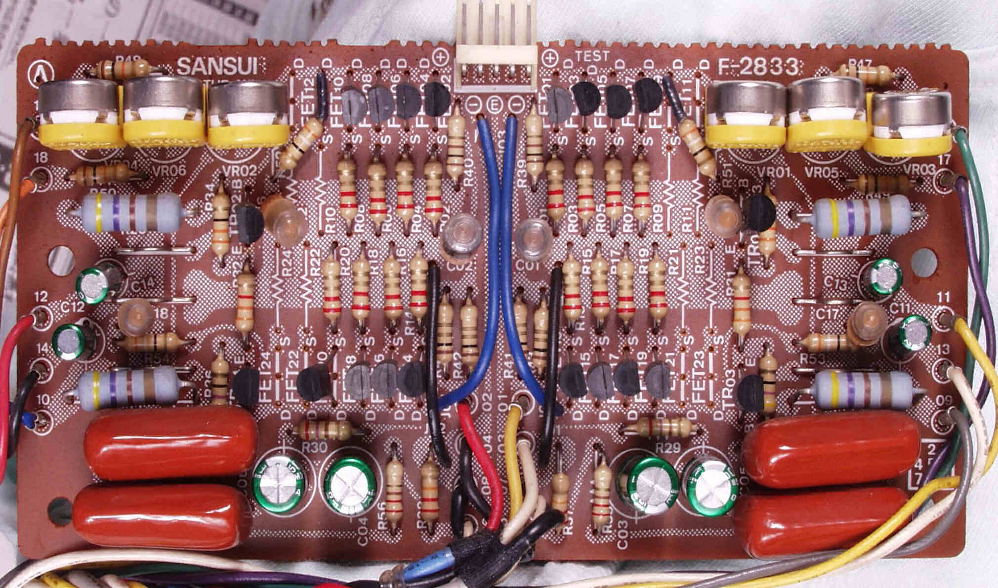 | C−1B. 修理後 メイン・ドライブAMP基板 初段FET(電界効果トランジスター)2個、半固定VR4個、電解コンデンサ−20個交換 | ||||||||||||||||||||||||||||||||||||||||||||||||||||||||||||||||||||||||||||