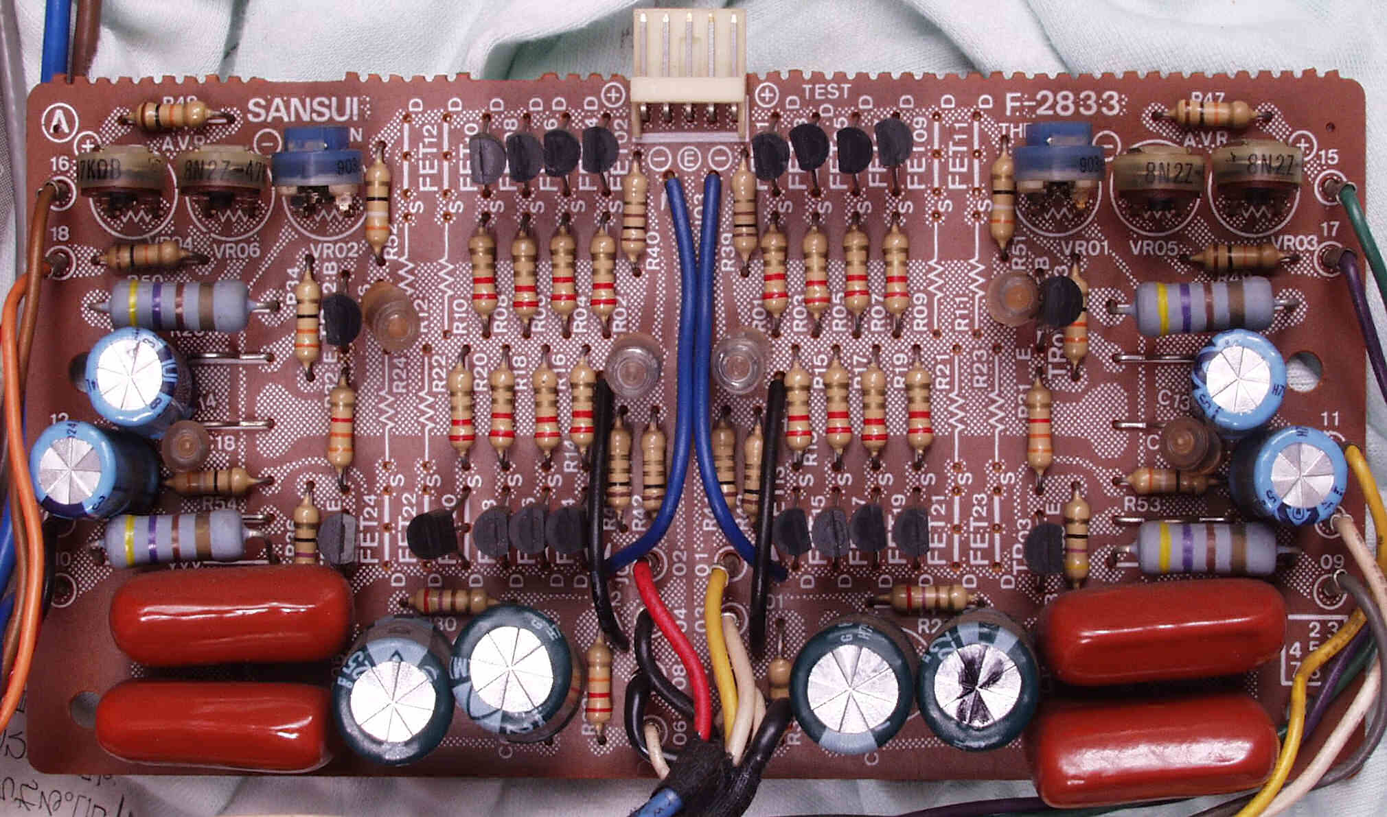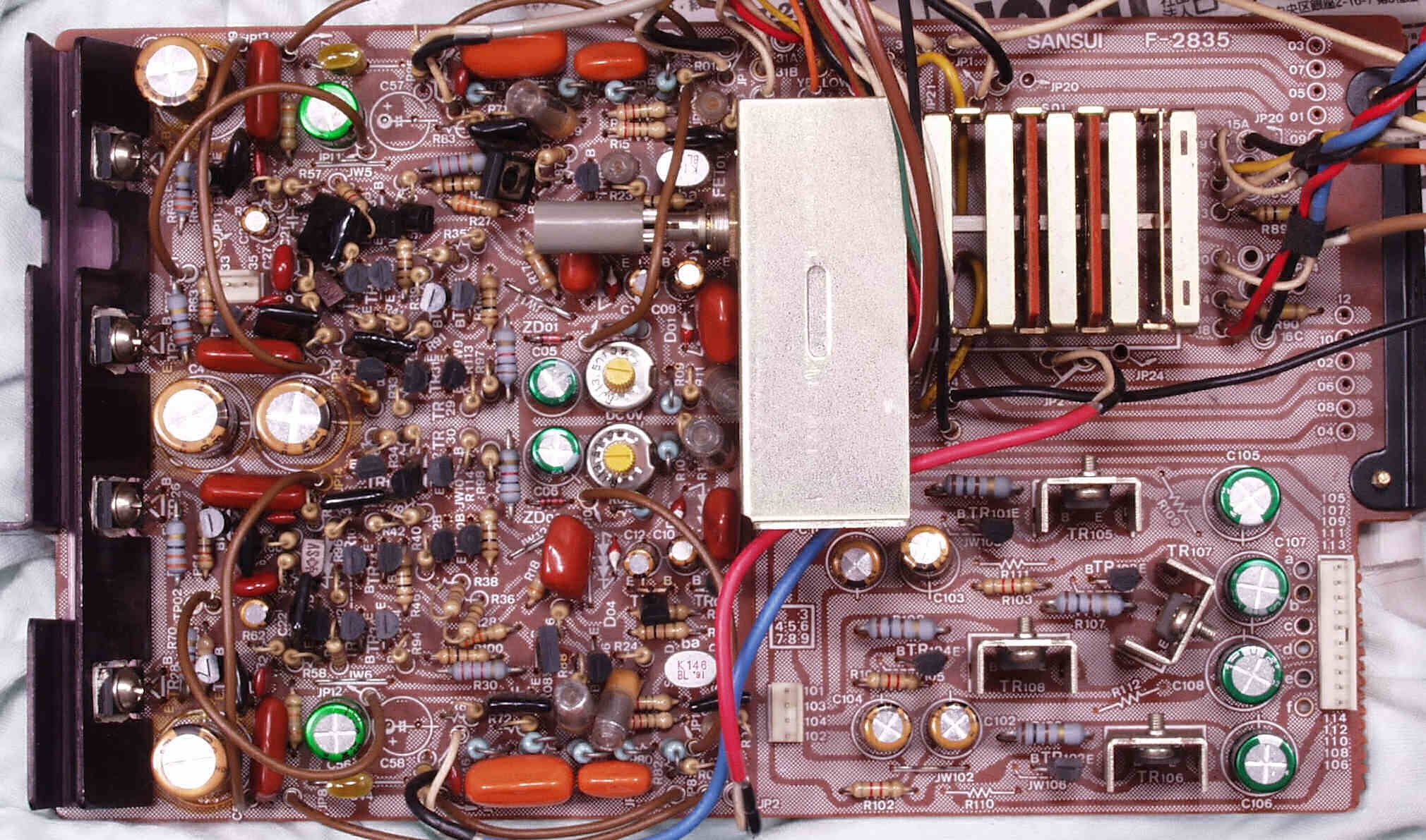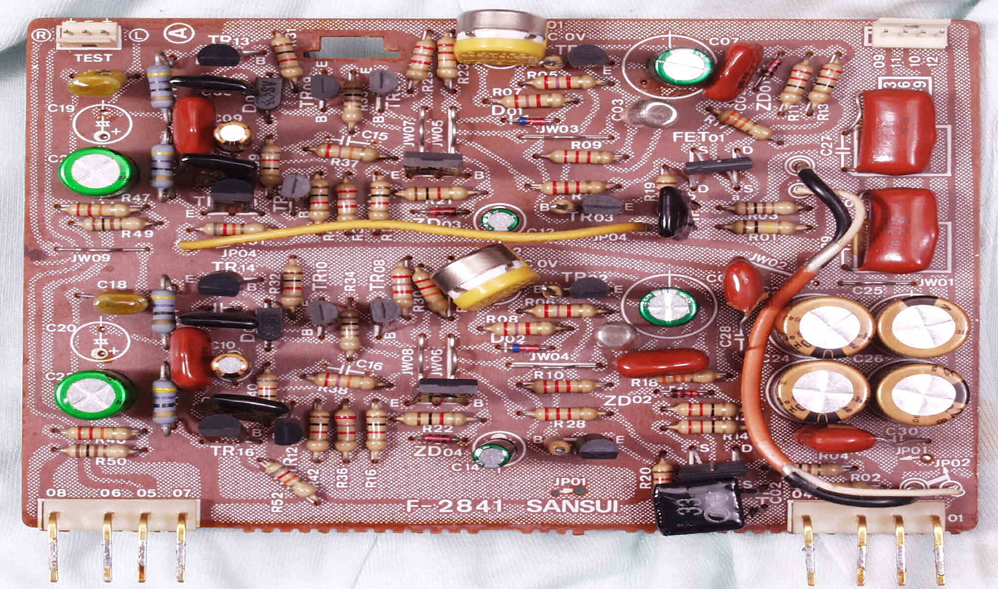 | C−1B. 修理後 メイン・ドライブAMP基板 初段FET(電界効果トランジスター)2個、半固定VR4個、電解コンデンサ−20個交換 | ||||||||||||||||||||||||||||||||||||||||||||||||||||||||||||||||||||||||||||