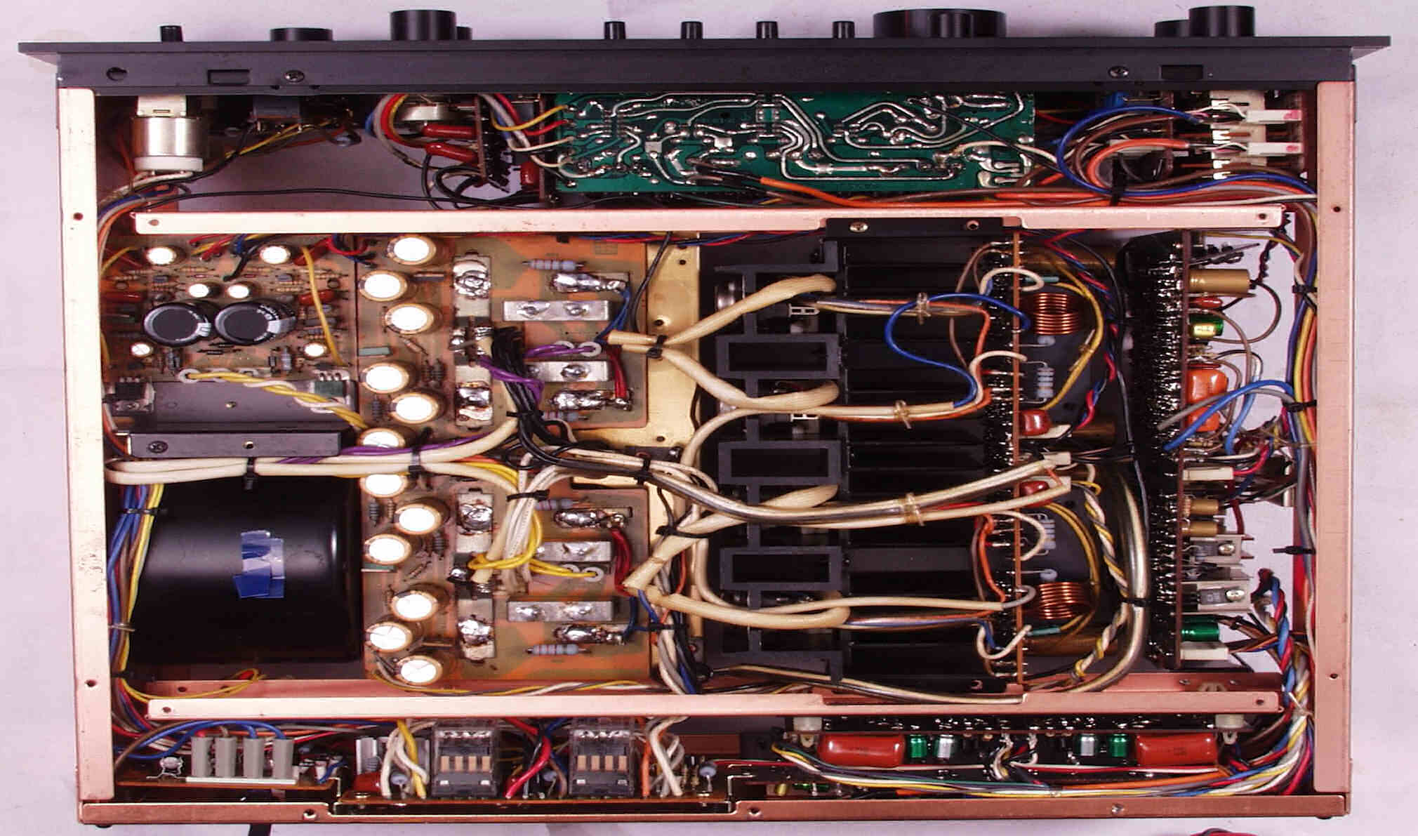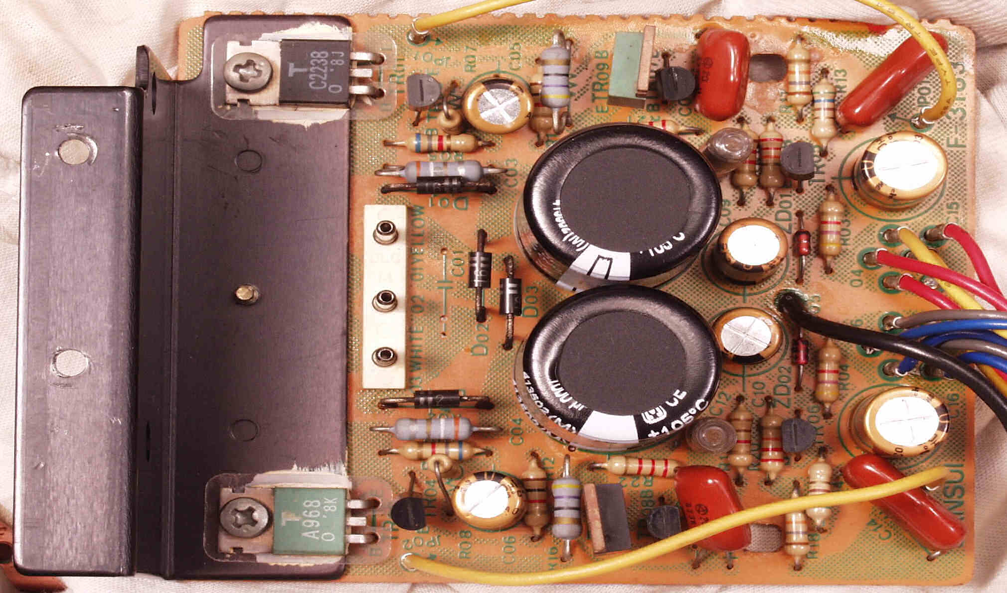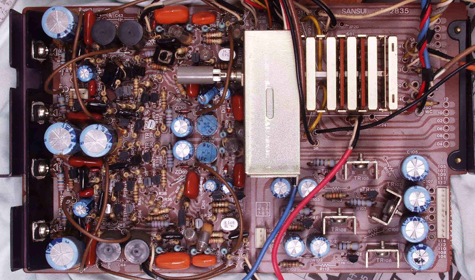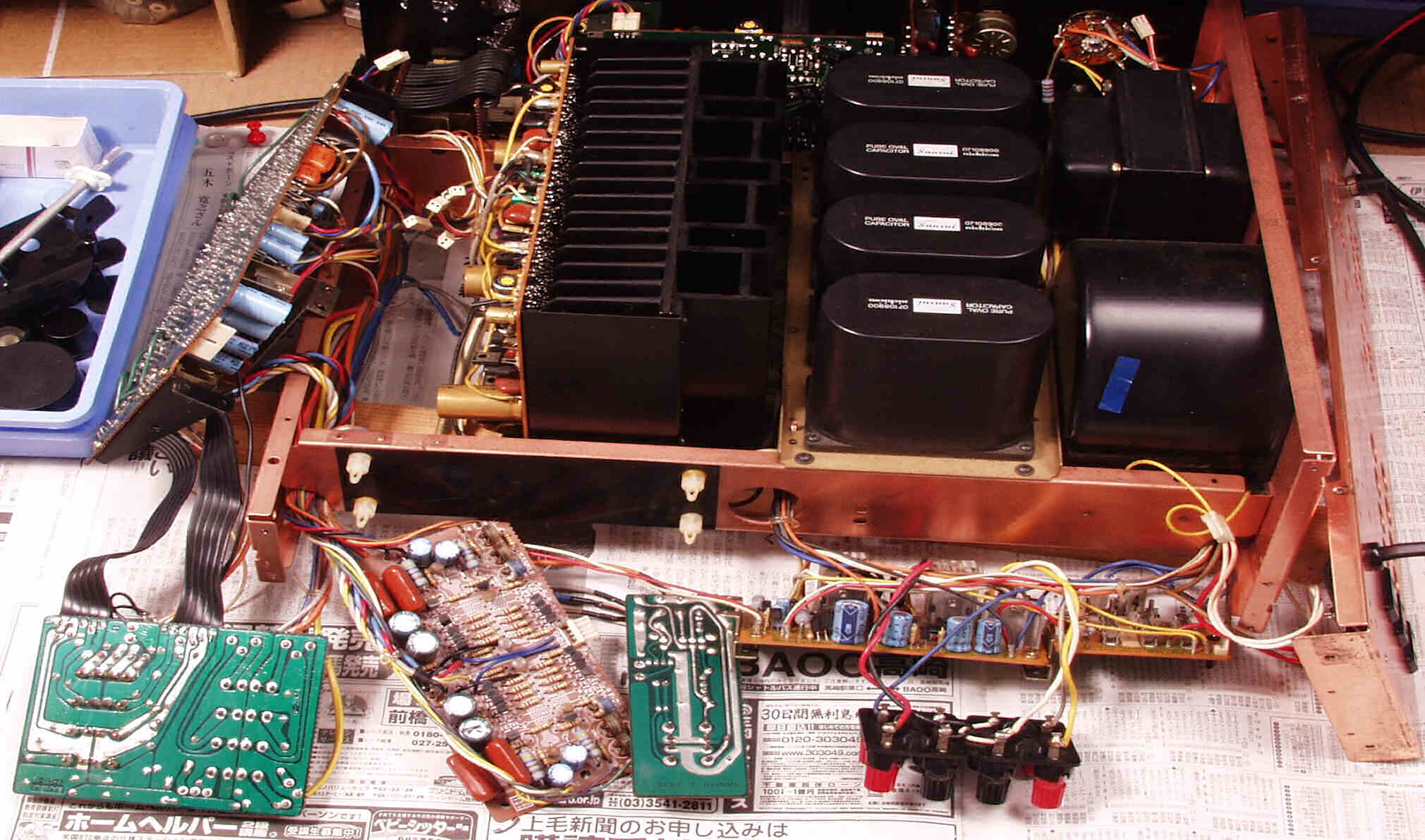 | C−1B. 修理後 メイン・ドライブAMP基板 初段FET(電界効果トランジスター)2個、半固定VR4個、電解コンデンサ−20個交換 | ||||||||||||||||||||||||||||||||||||||||||||||||||||||||||||||||||||||||||||
