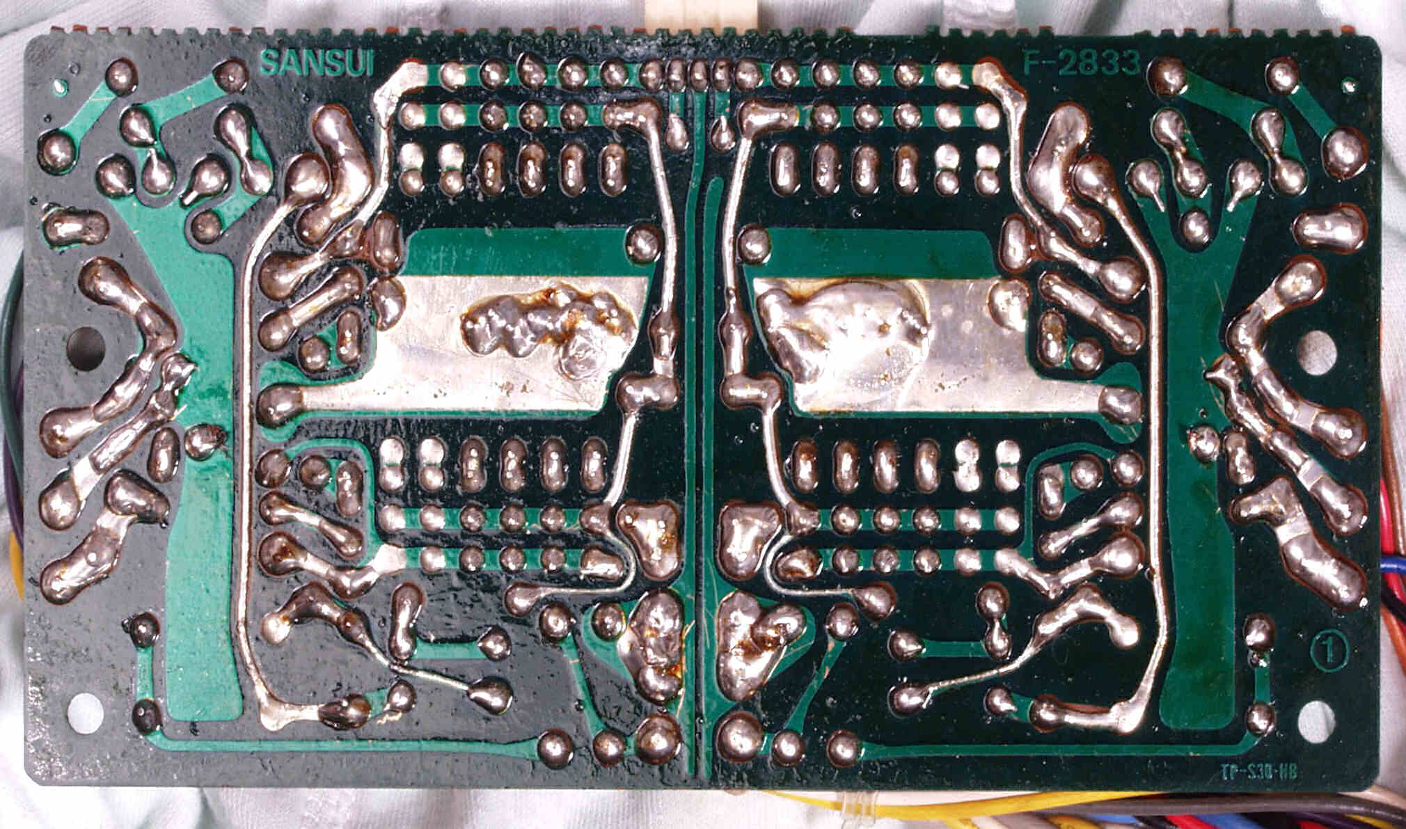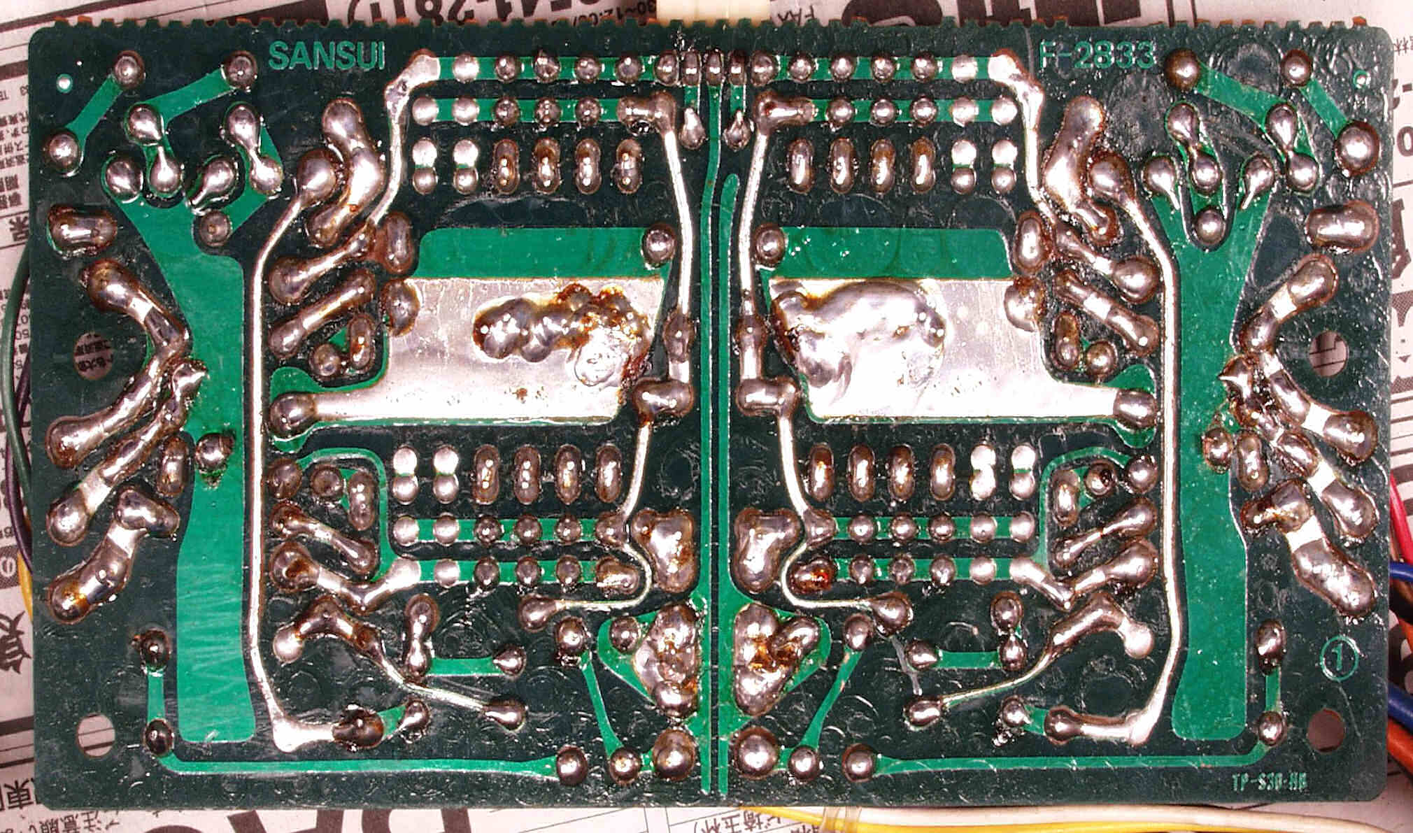 | C−1C−1. 修理中 メイン・ドライブAMP基板裏 半田不良箇所 | ||||||||||||||||||||||||||||||||||||||||||||||||||||||||||||||||||||||||||||