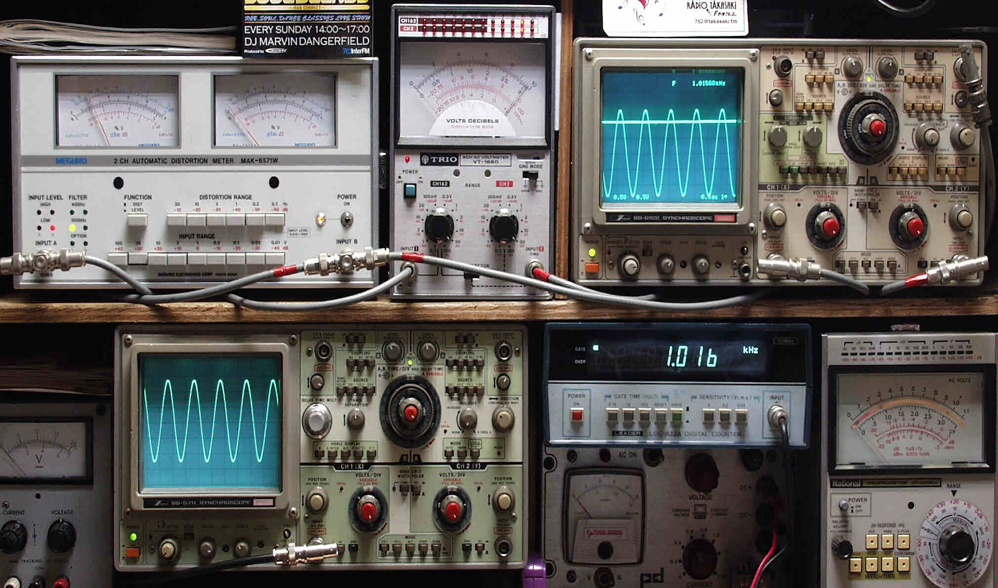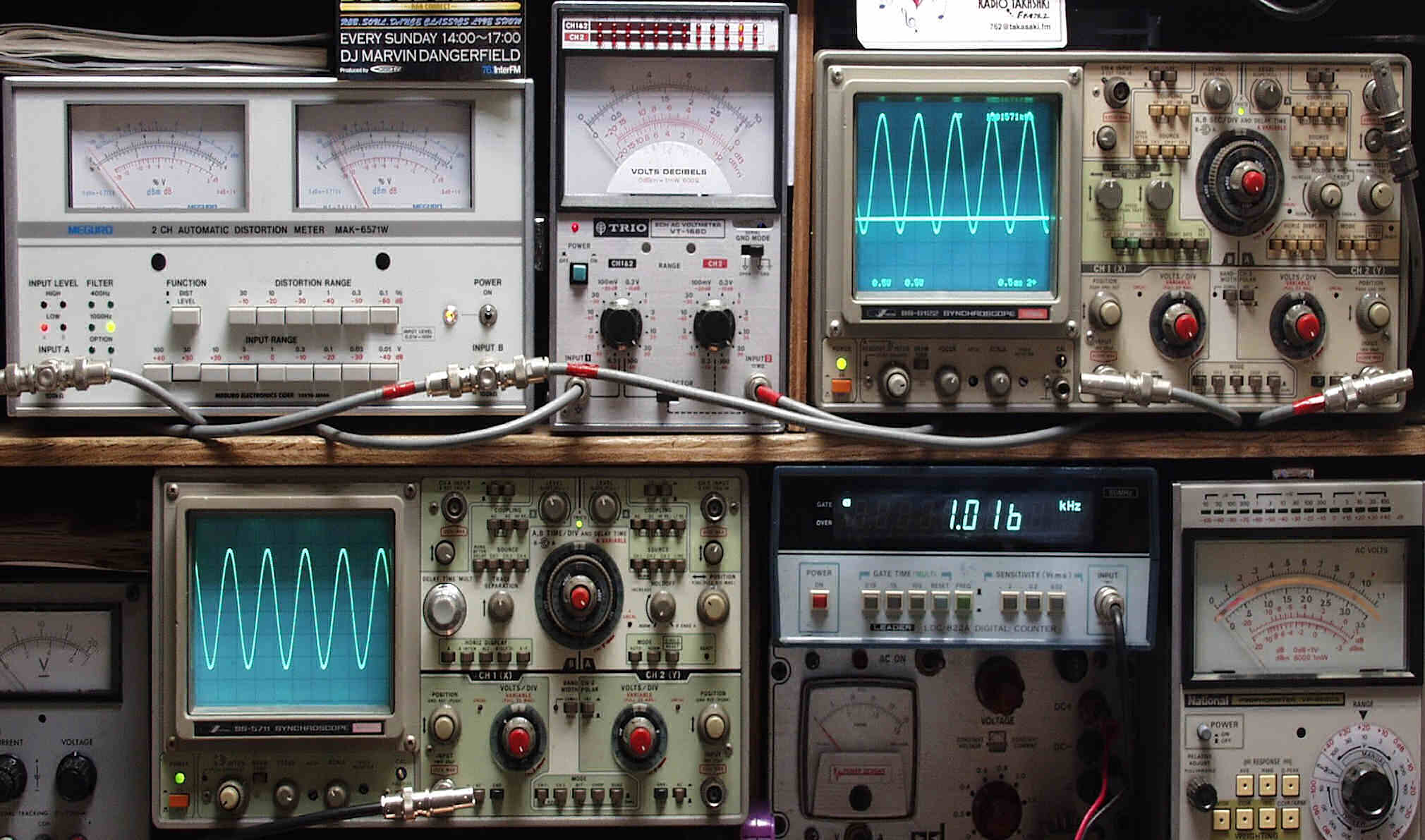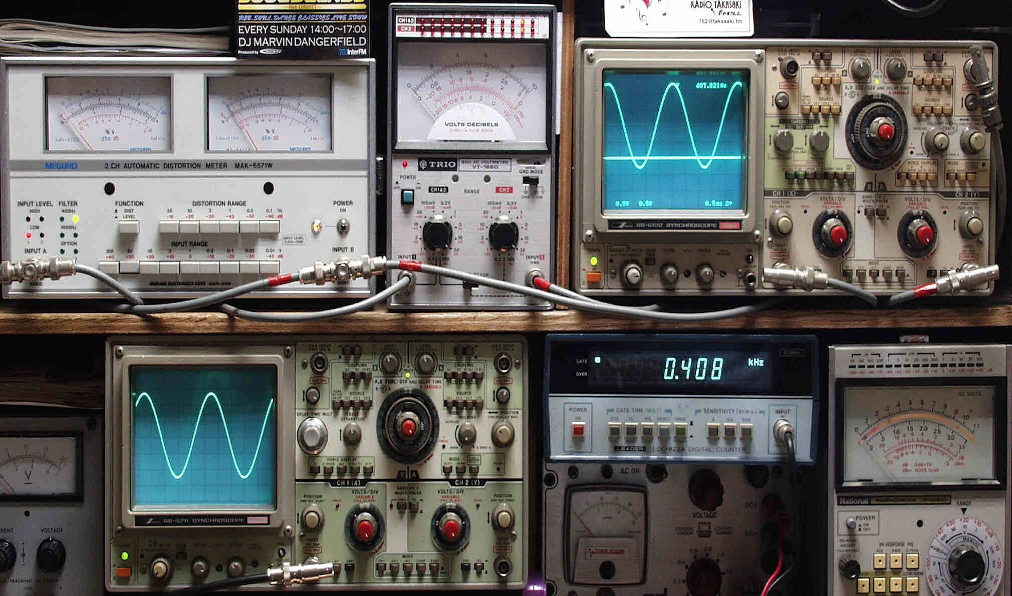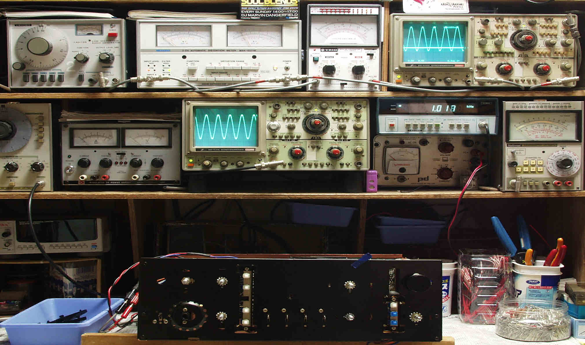 | E. 測定・調整 E−1. 出力/歪み率測定・調整 <見方> 上左オーディオ発振器より400HZ・1KHZの信号を出す(歪み率=約0.003%) 下中=入力波形(オーディオ発振器のTTLレベル) 下右=周波数計 上左=SP出力の歪み率測定 左メ−タ−=L出力、右メ−タ−=R出力 上中=SP出力電圧測定器、赤針=R出力、黒針=L出力 上右=SP出力波形オシロ 上=R出力、下=L出力(出力電圧測定器の出力) |