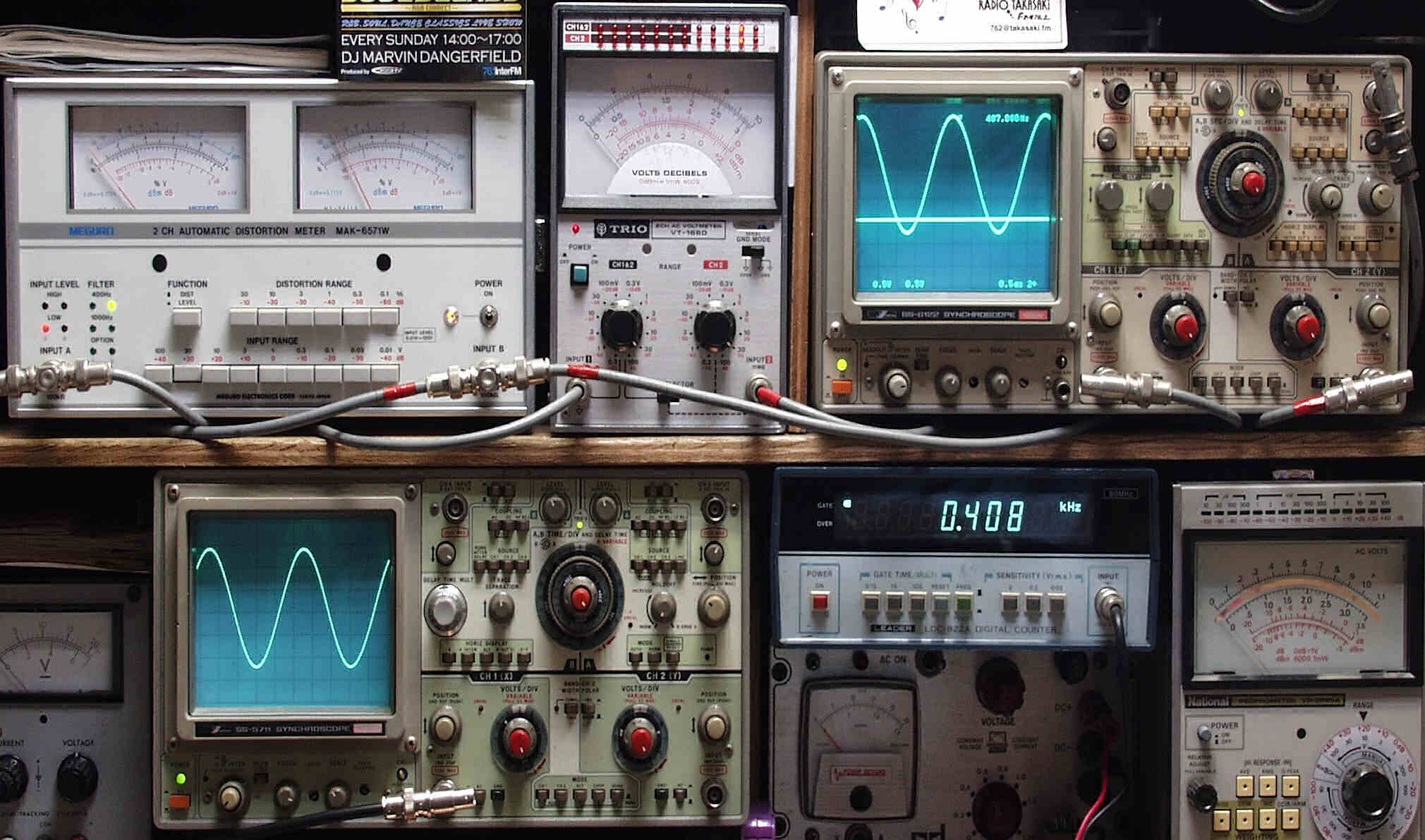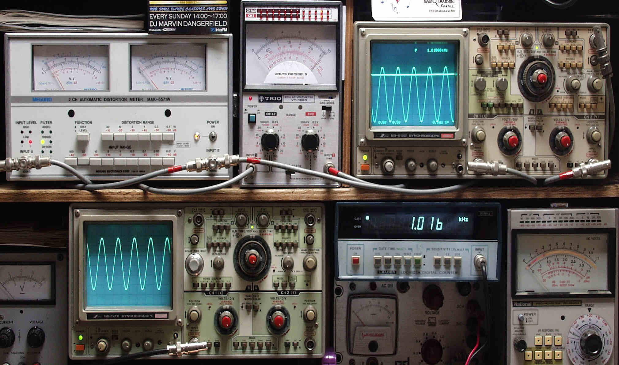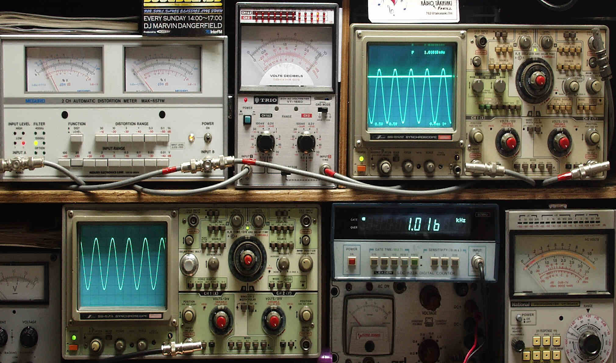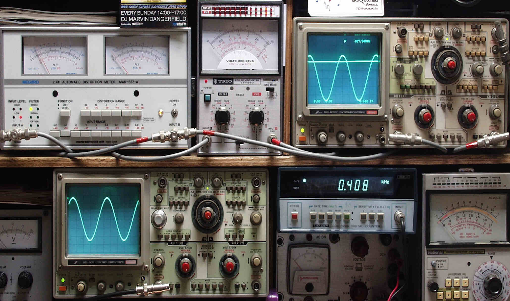 | E. 測定・調整 E−1. 出力/歪み率測定・調整 <見方> 上左オーディオ発振器より400HZ・1KHZの信号を出す(歪み率=約0.003%) 下中=入力波形(オーディオ発振器のTTLレベル) 下右=周波数計 上左=SP出力の歪み率測定 左メ−タ−=L出力、右メ−タ−=R出力 上中=SP出力電圧測定器、赤針=R出力、黒針=L出力 上右=SP出力波形オシロ 上=R出力、下=L出力(出力電圧測定器の出力) |