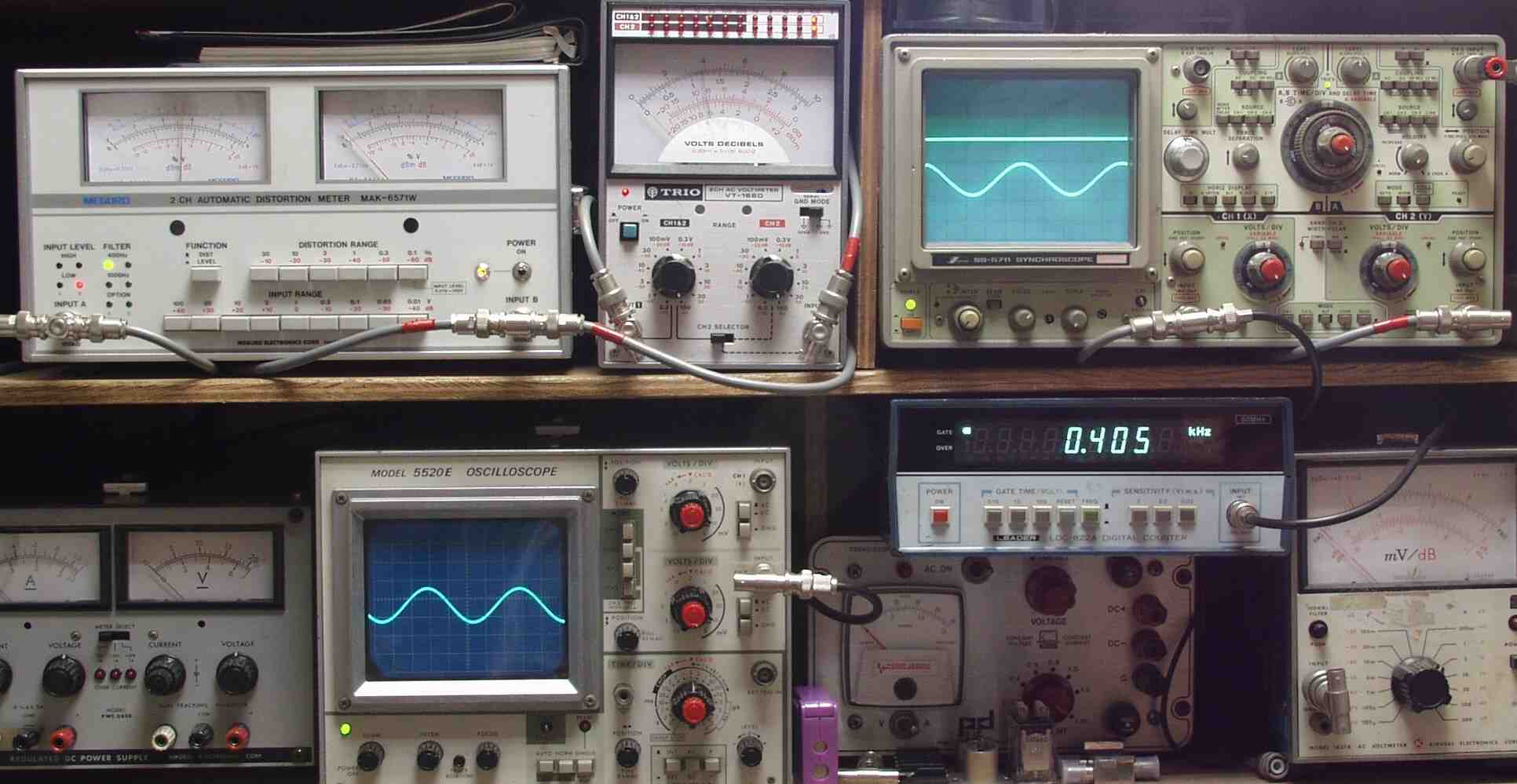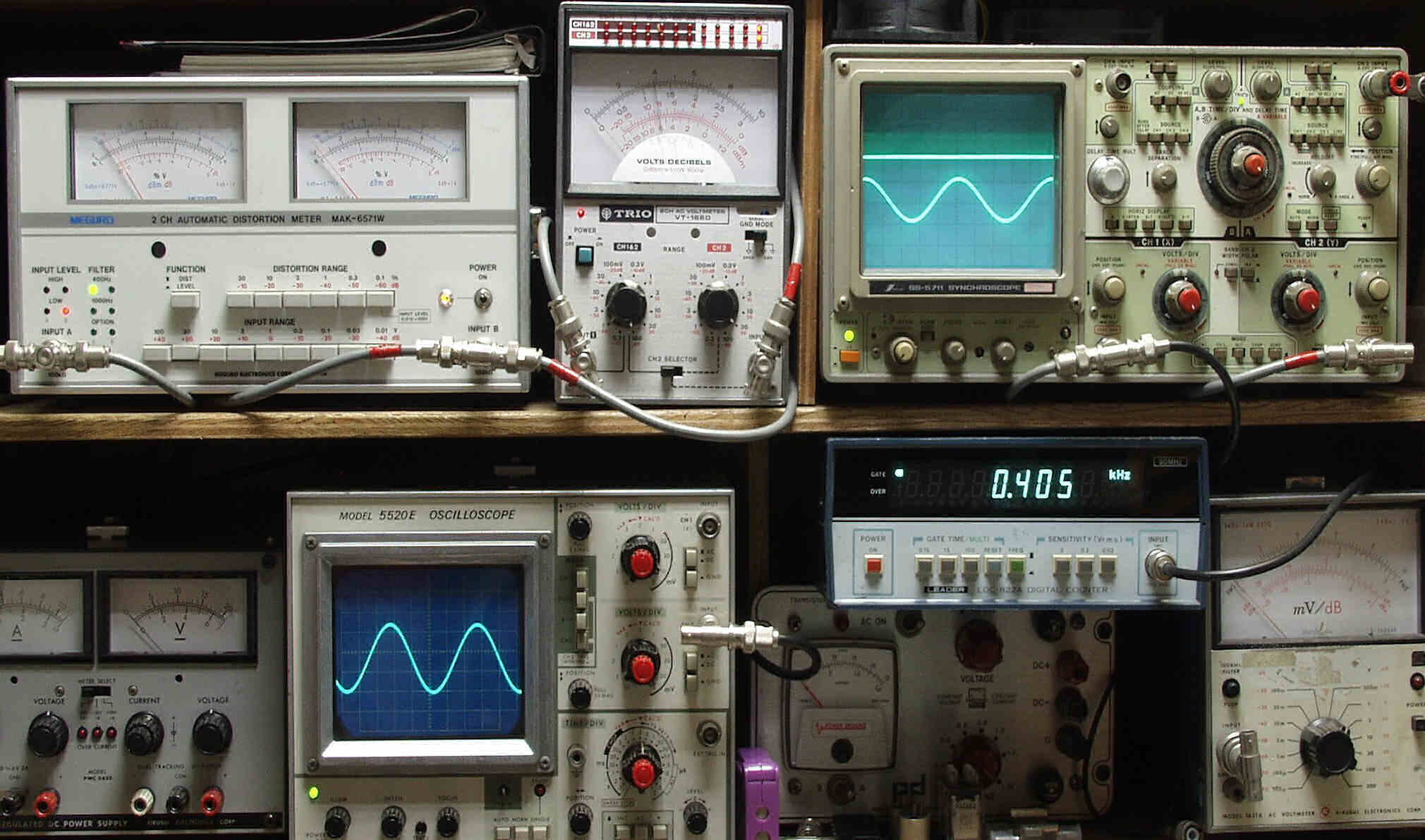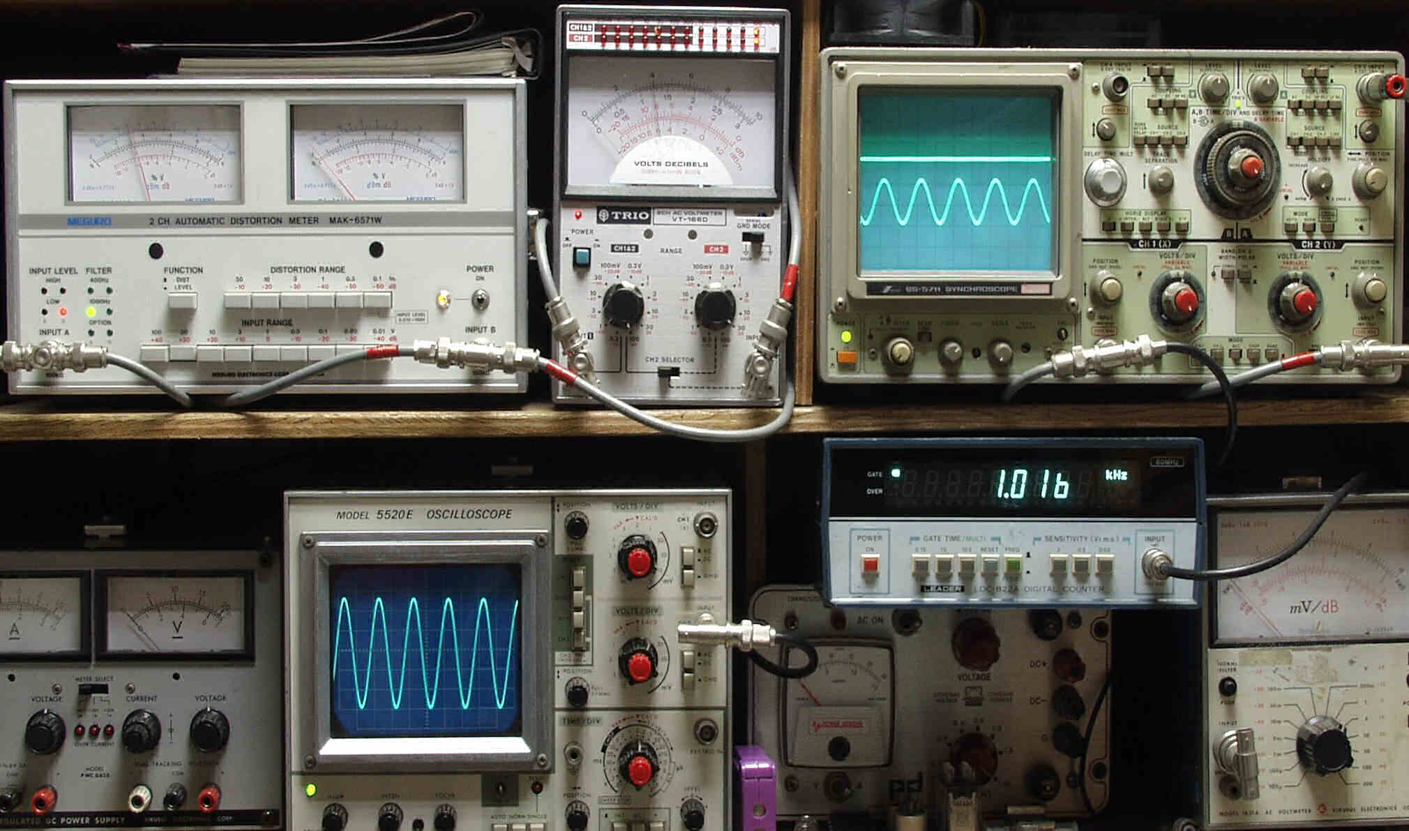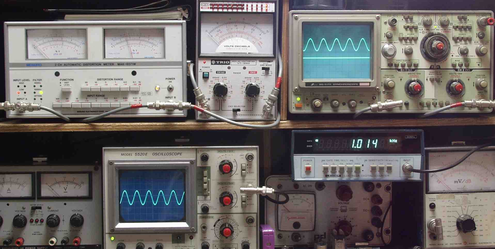 | E. 調整・測定。 画像をクリックすると、大きく(横幅2050ドット)表示されます。 E1. 出力/歪み率確認・調整 MC/MMの歪みが多いのは入出切り替えSW(C9A.SW基板の上の物)が多量の接点復活材の為 <見方> 上左オーディオ発振器より400HZ・1KHZの信号を出す(歪み率=約0.005%) 下中=入力波形(オーディオ発振器のTTLレベル) 下右=周波数計 上左=SP出力の歪み率測定 左メータ=L出力、右メータ=R出力 上中=SP出力電圧測定器、赤針=R出力、黒針=L出力 上右=SP出力波形オシロ 上=R出力、下=L出力(出力電圧測定器の出力) |