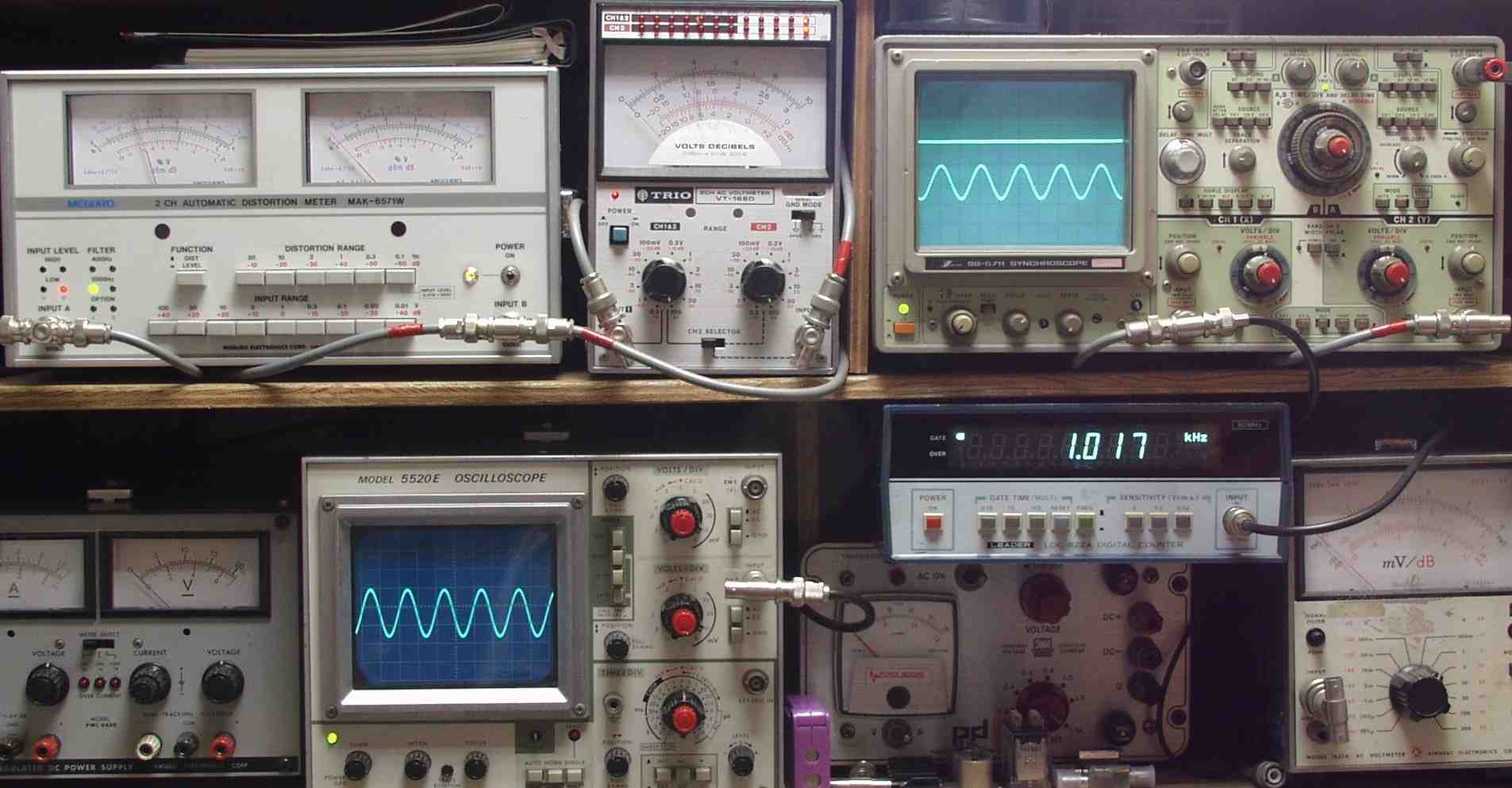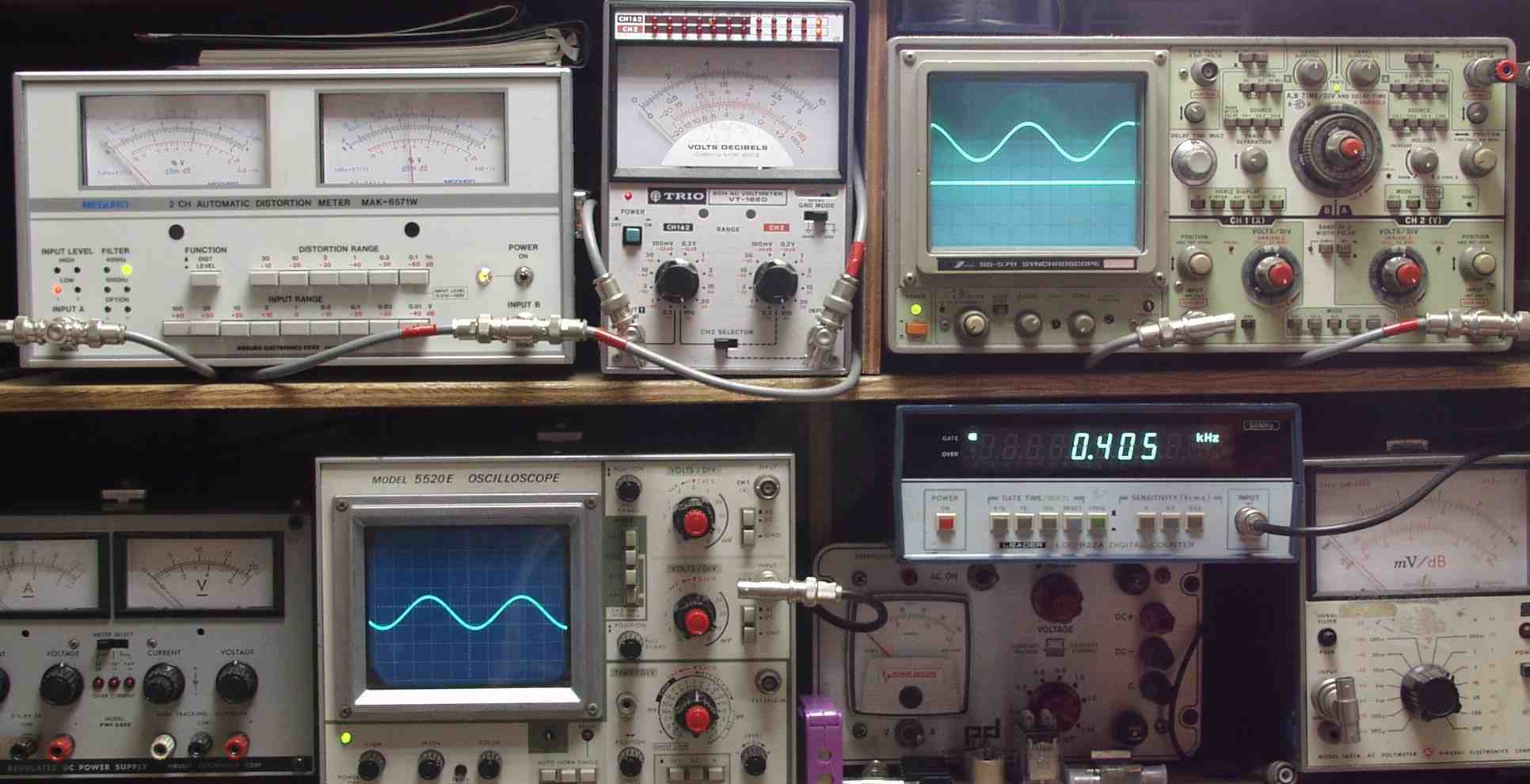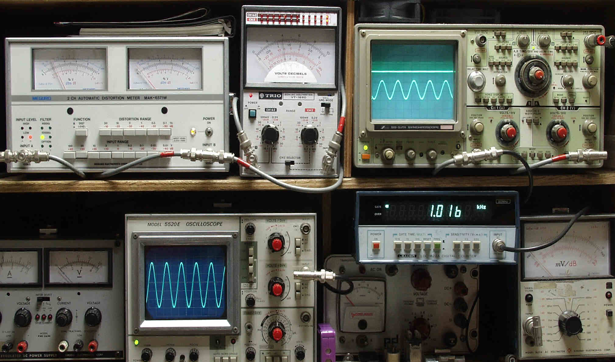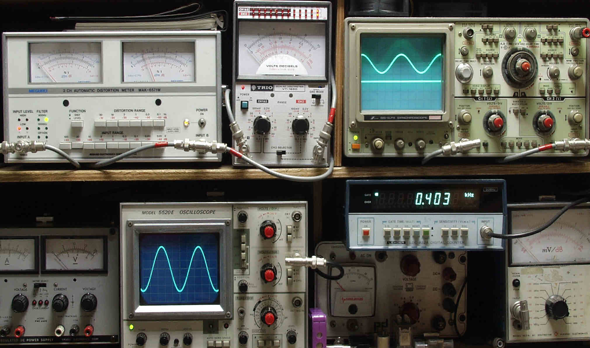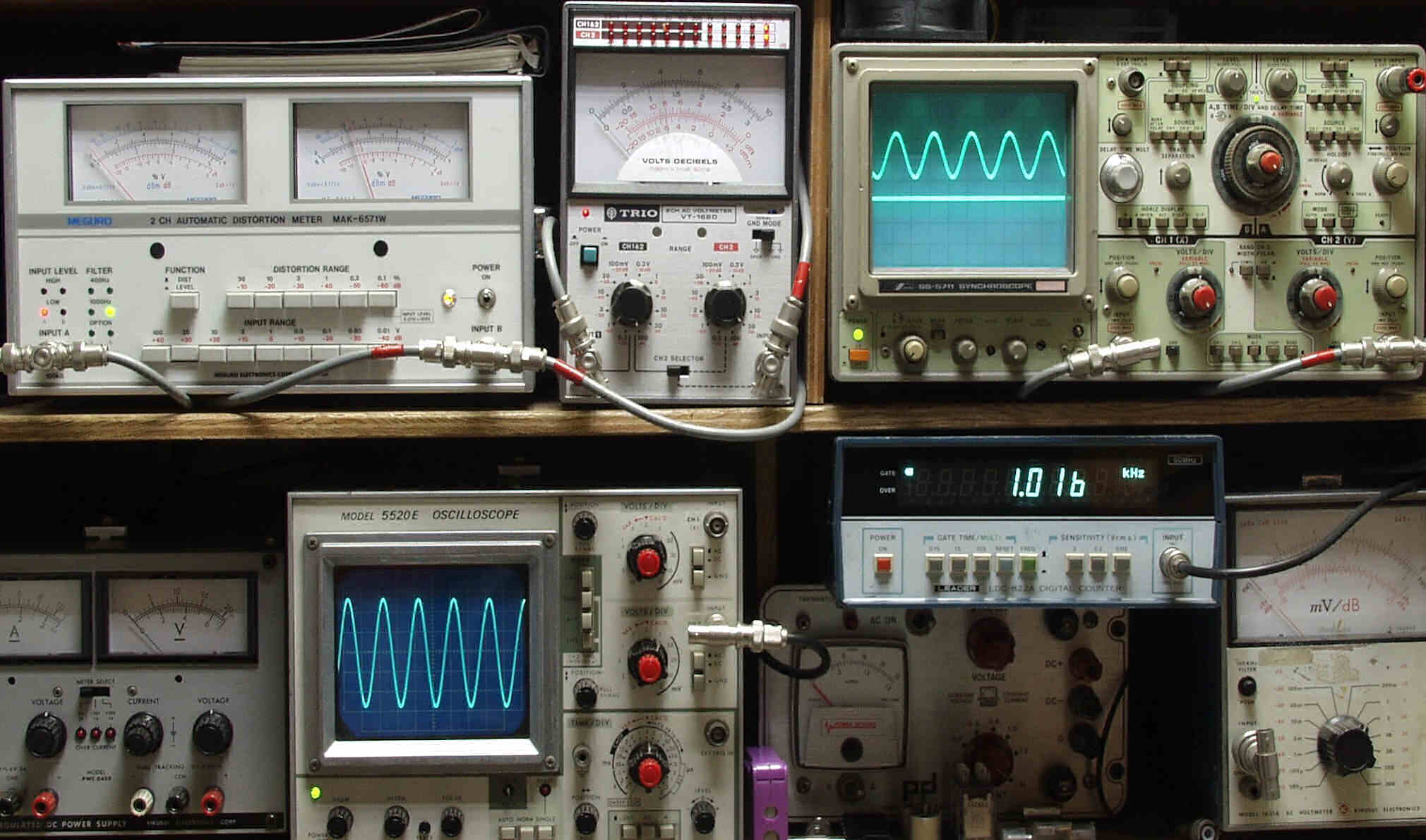 | E. 調整・測定。 画像をクリックすると、大きく(横幅2050ドット)表示されます。 E1. 出力/歪み率確認・調整 MC/MMの歪みが多いのは入出切り替えSW(C9A.SW基板の上の物)が多量の接点復活材の為 <見方> 上左オーディオ発振器より400HZ・1KHZの信号を出す(歪み率=約0.005%) 下中=入力波形(オーディオ発振器のTTLレベル) 下右=周波数計 上左=SP出力の歪み率測定 左メータ=L出力、右メータ=R出力 上中=SP出力電圧測定器、赤針=R出力、黒針=L出力 上右=SP出力波形オシロ 上=R出力、下=L出力(出力電圧測定器の出力) |