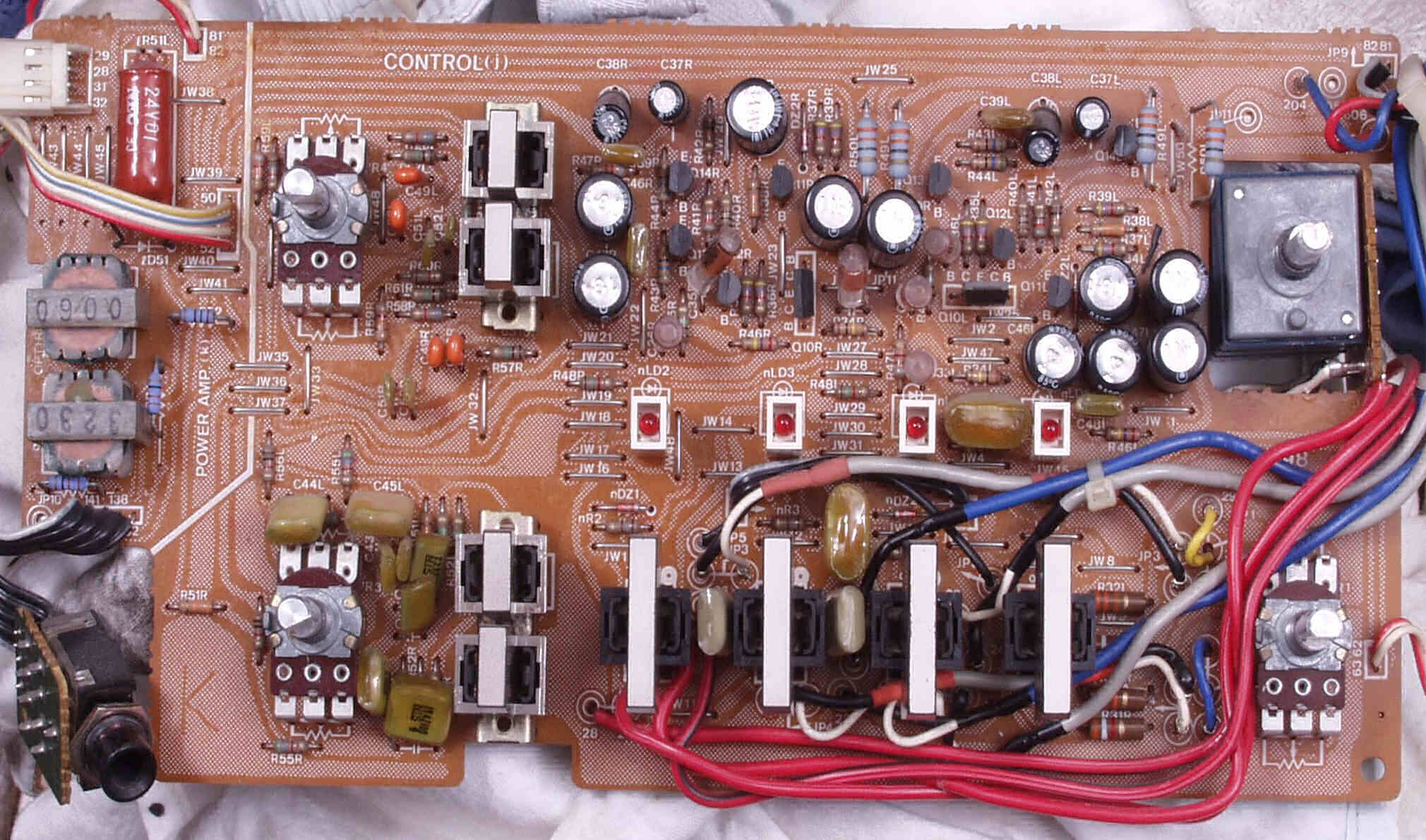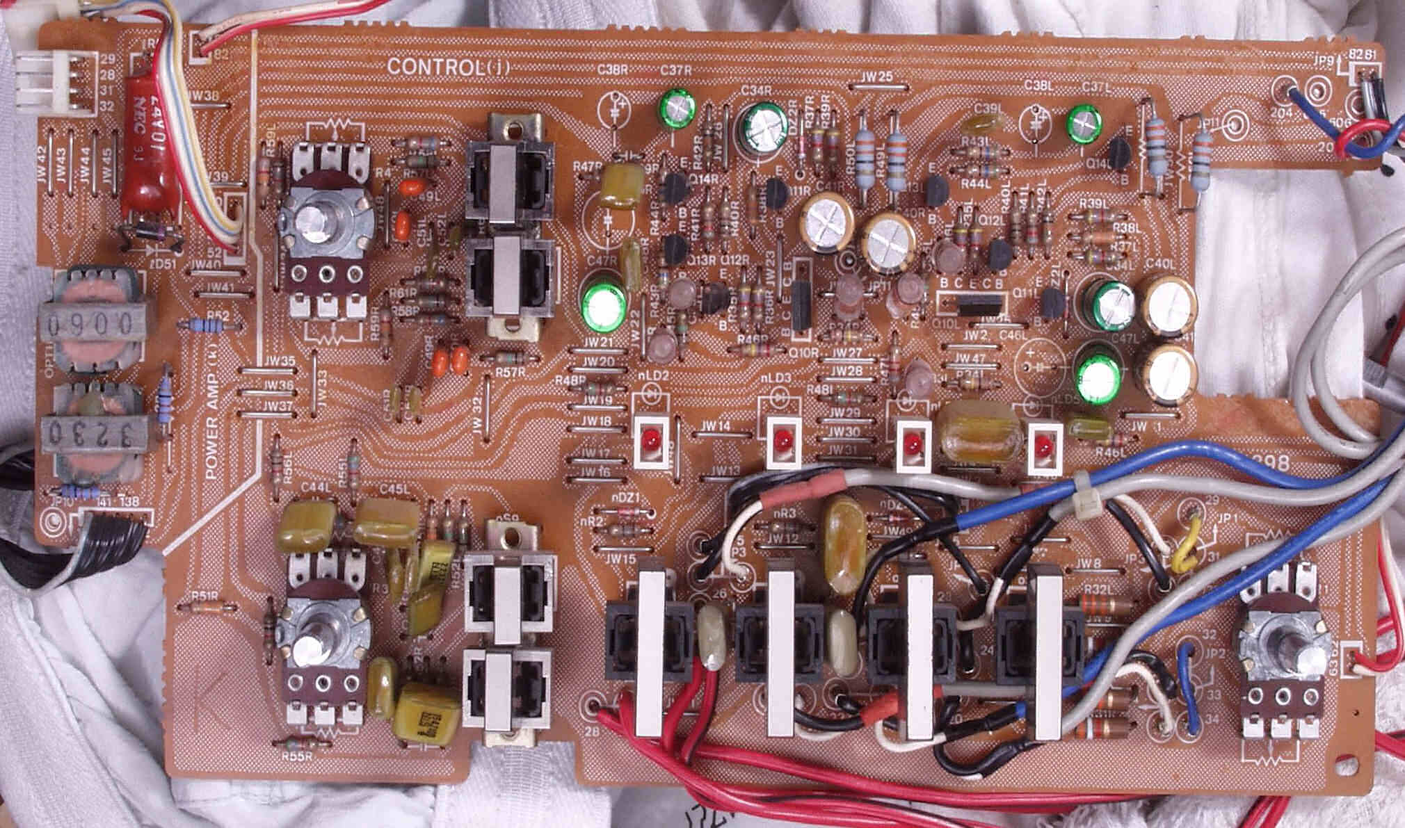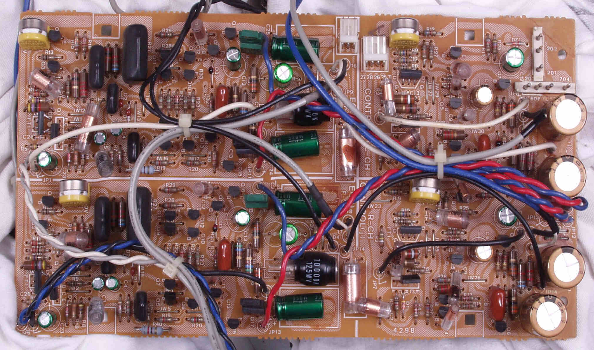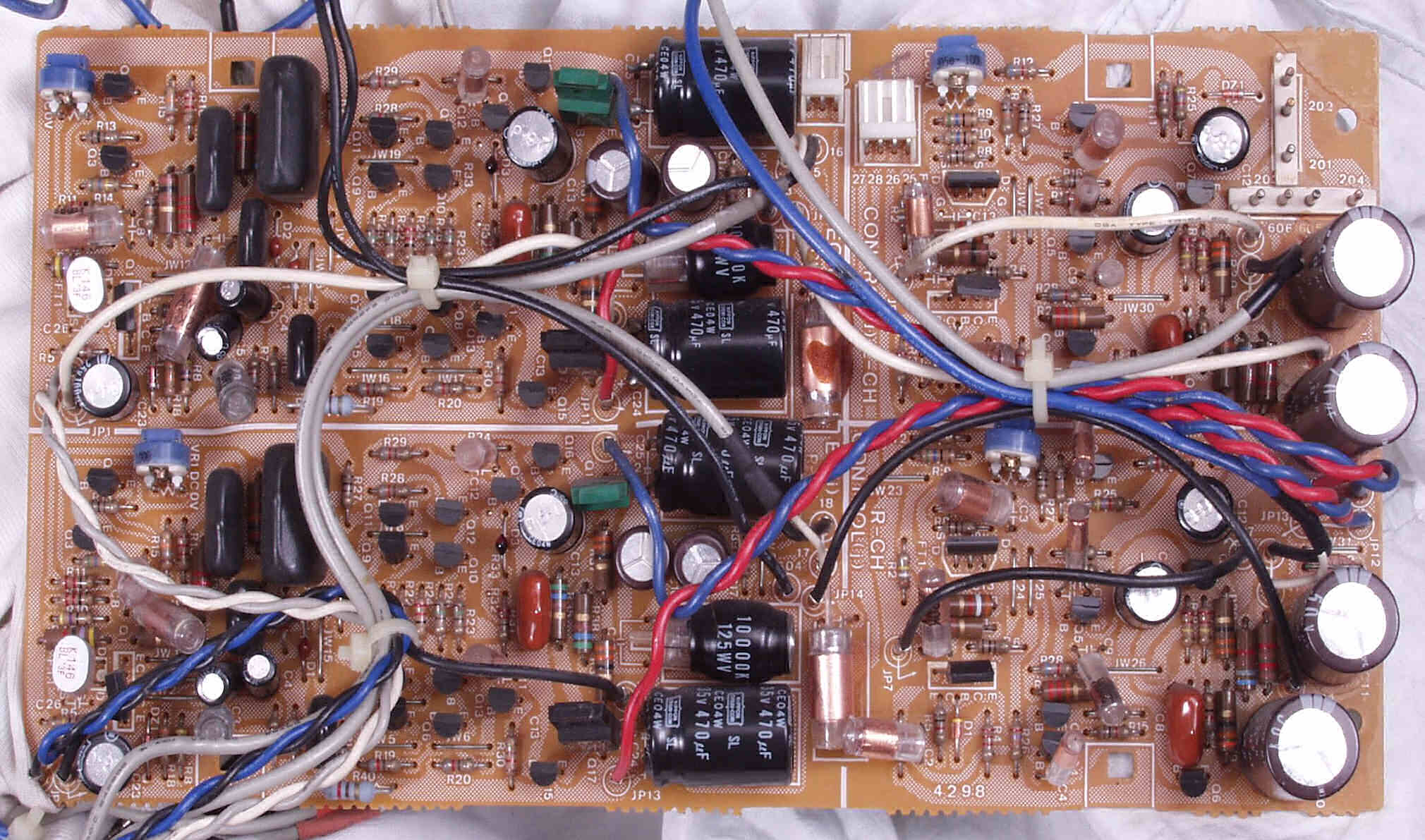 | C4B. 修理後 メイン・ドライブAMP基板 半固定VR4個、電解コンデンサー10個交換 | ||||||||||||||||||||||||||||||||||||||||||||||||||||||
