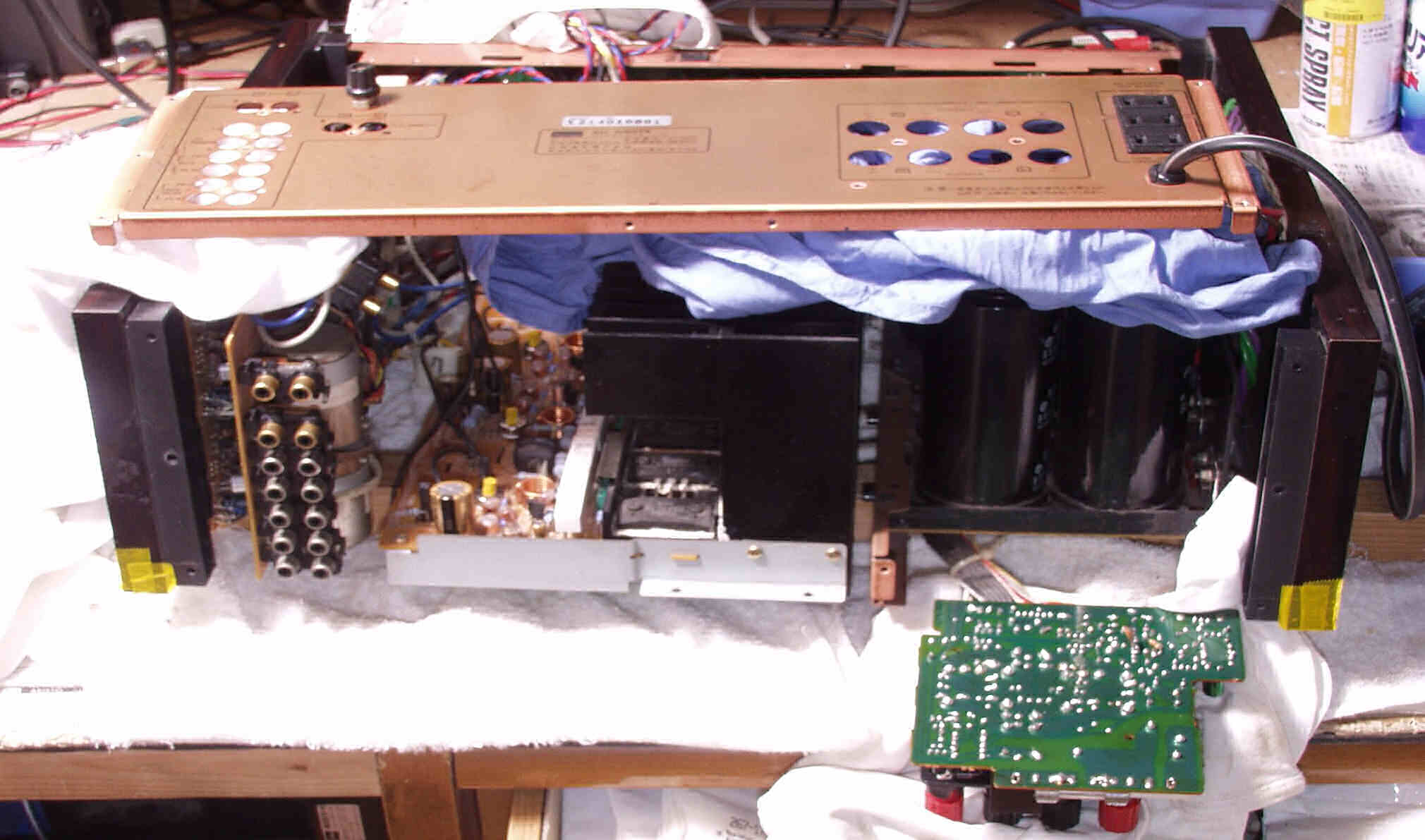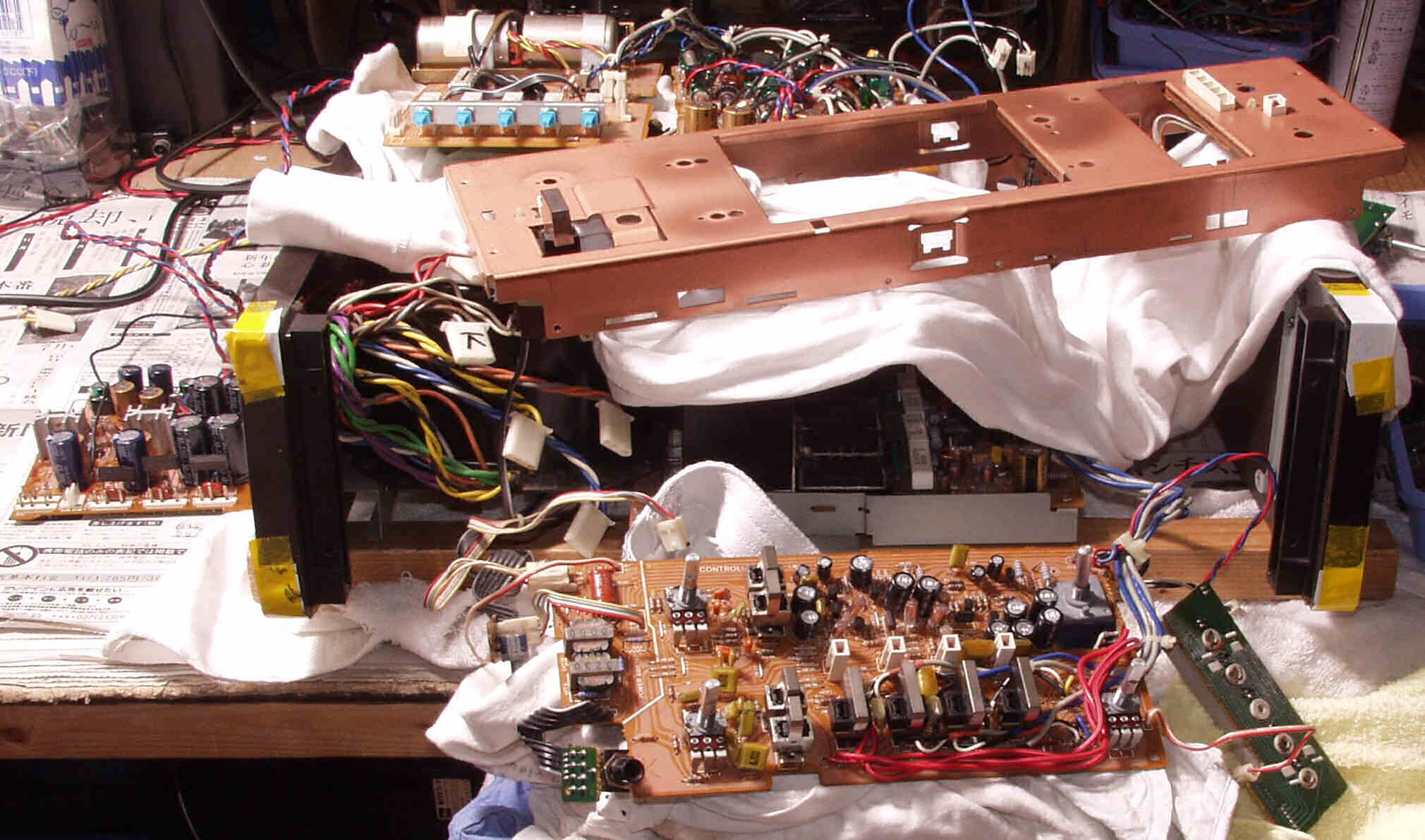 | C. 修理状況。 画像をクリックすると、大きく(横幅2050ドット)表示されます。 C1. 後パネルを外し、修理中 |