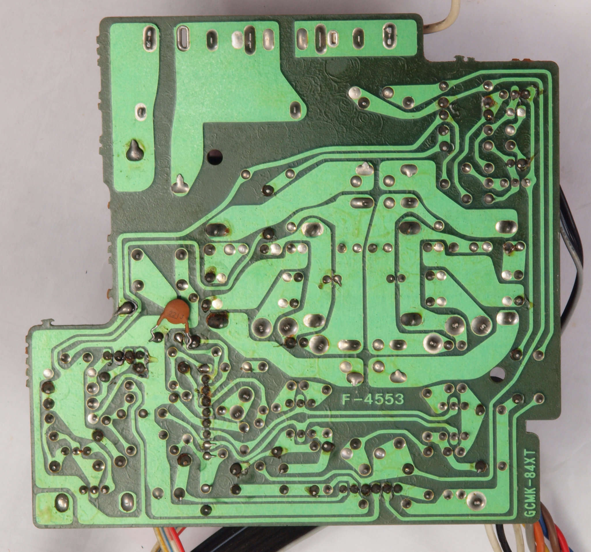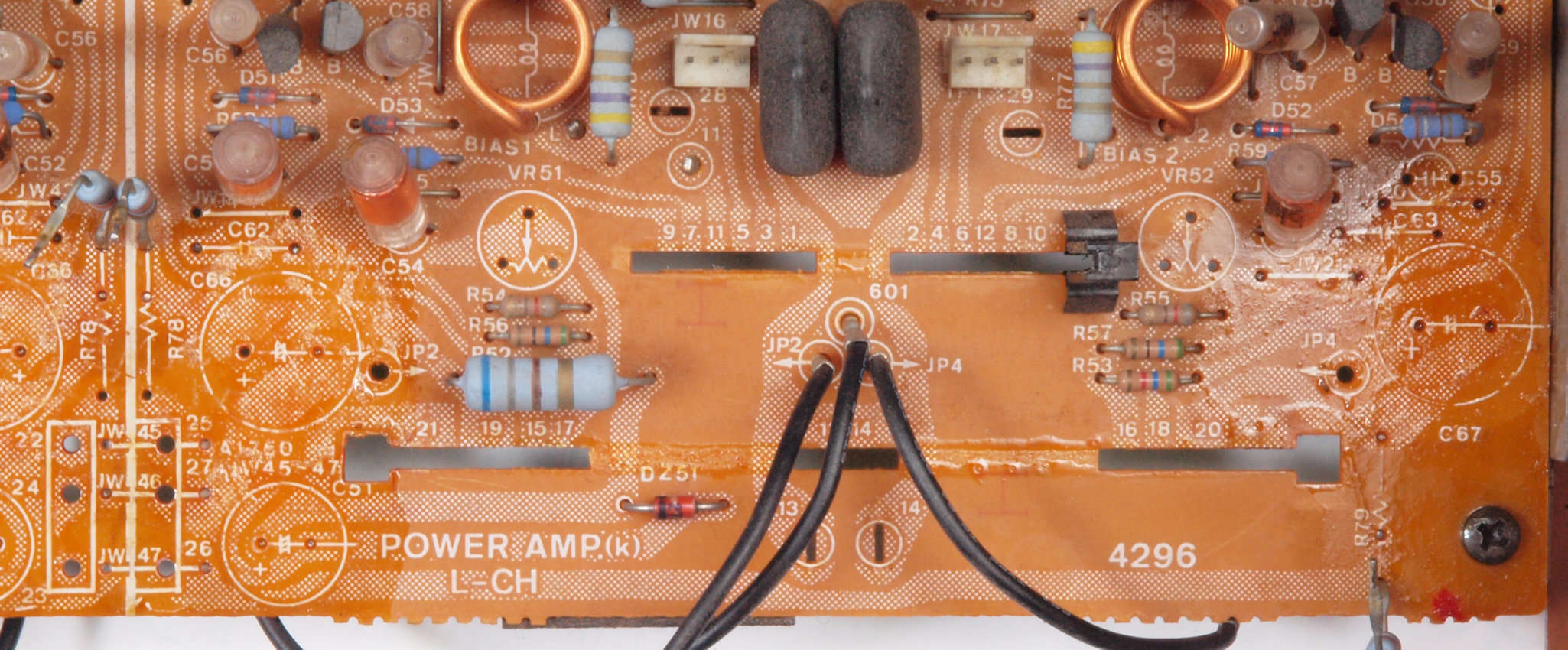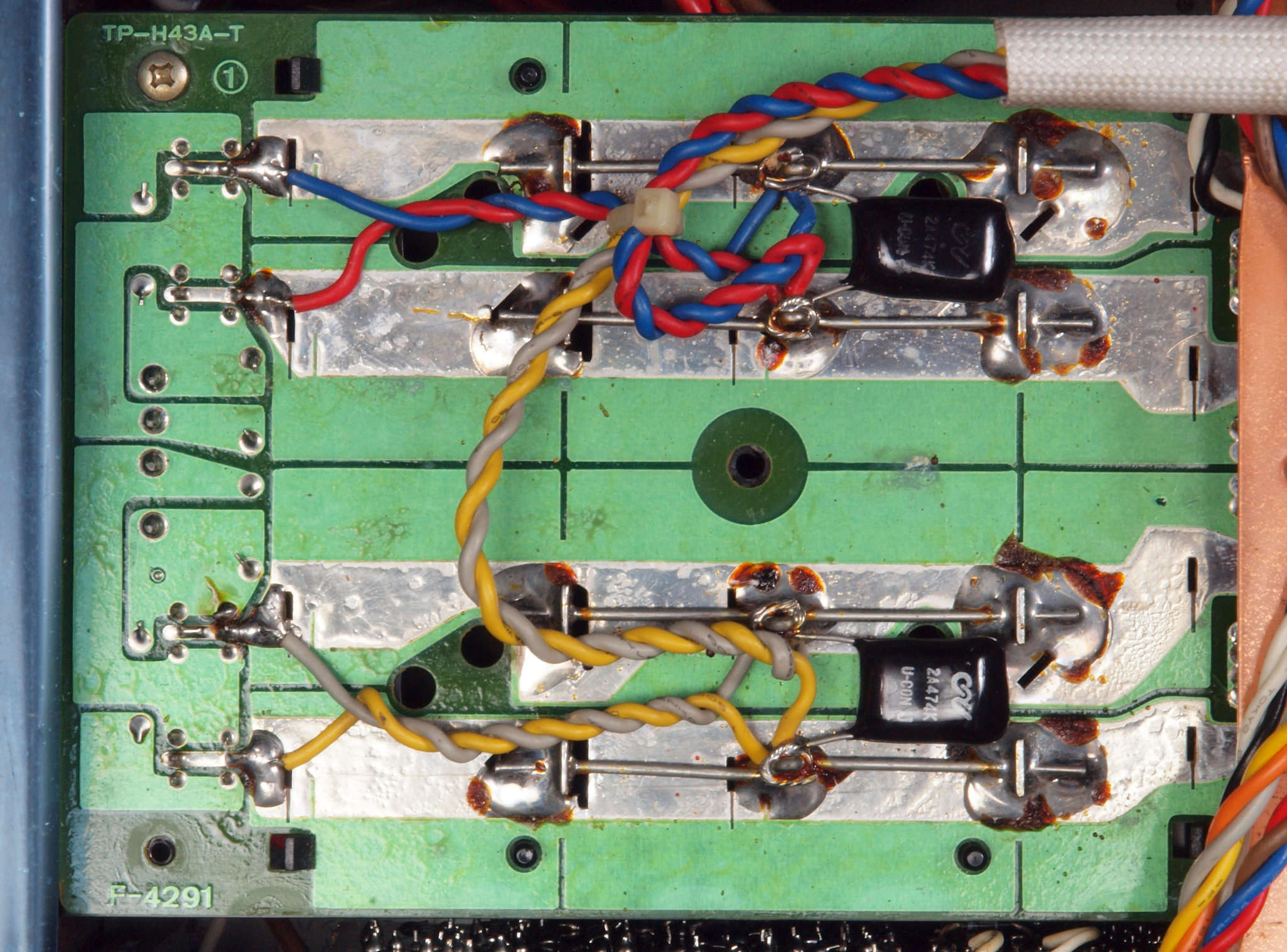 C423. 修理中 右メイン・ドライブAMP基板。 電解コンデンサー固定トルエン溶媒の接着剤がジャンパー線を腐食。