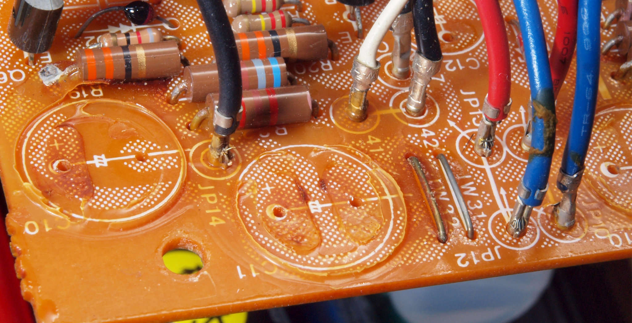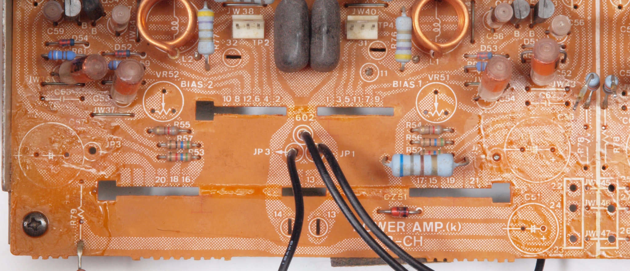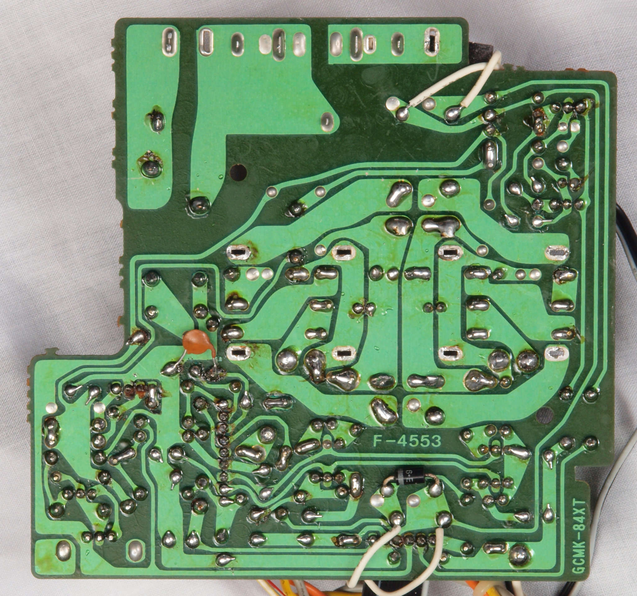 C423. 修理中 右メイン・ドライブAMP基板。 電解コンデンサー固定トルエン溶媒の接着剤がジャンパー線を腐食。