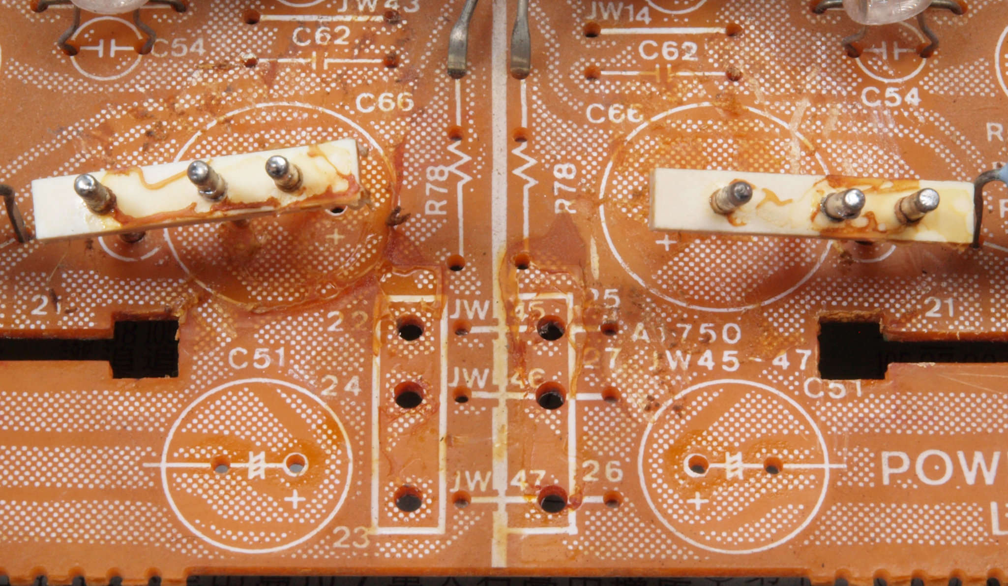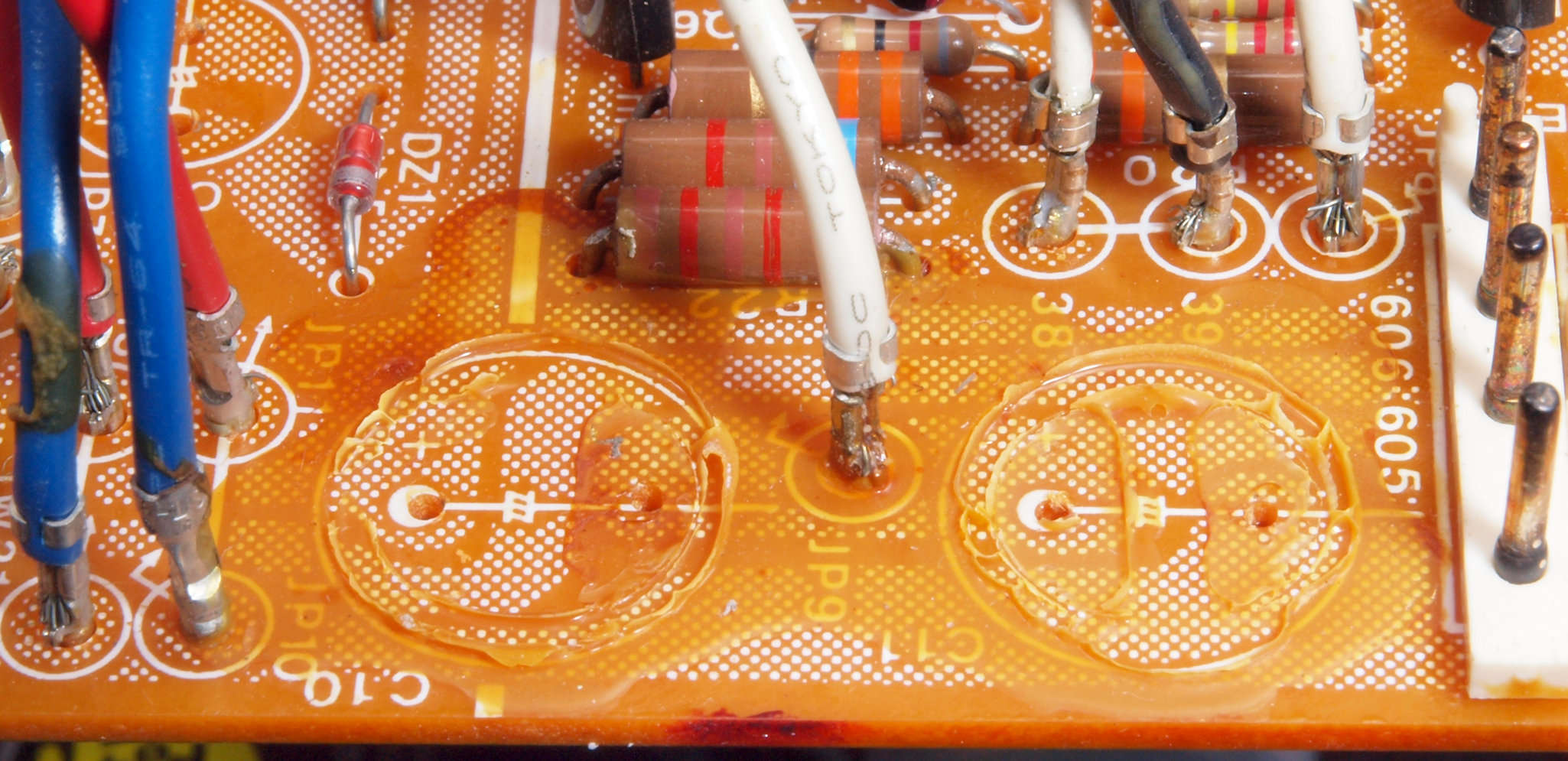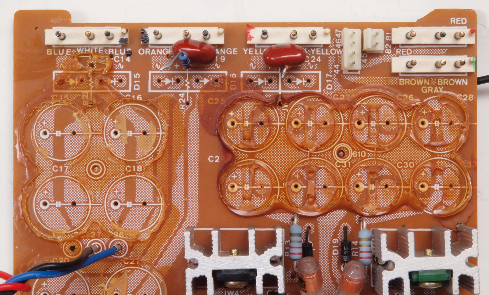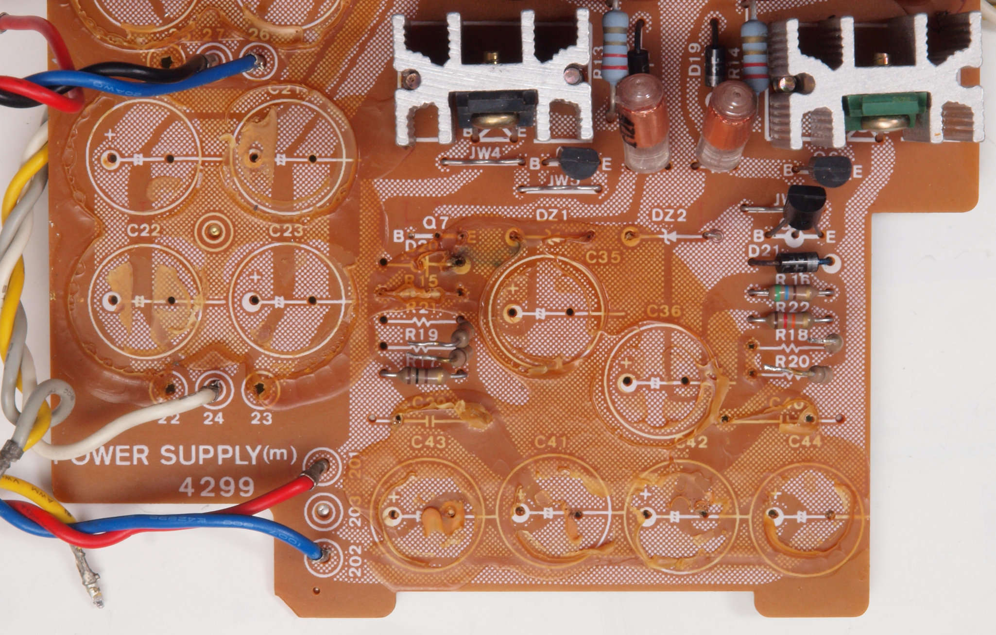C428. 修理中 右メイン・ドライブAMP基板。 電解コンデンサー固定トルエン溶媒の接着剤が電源端子を腐食。