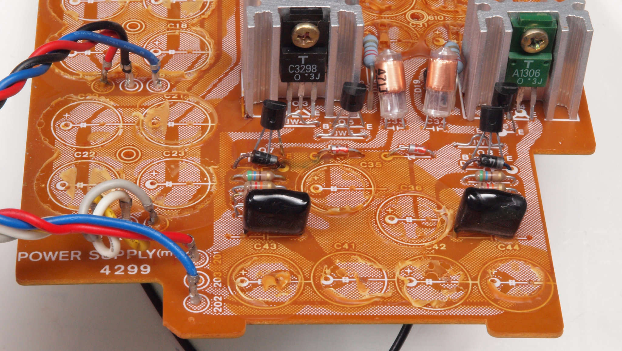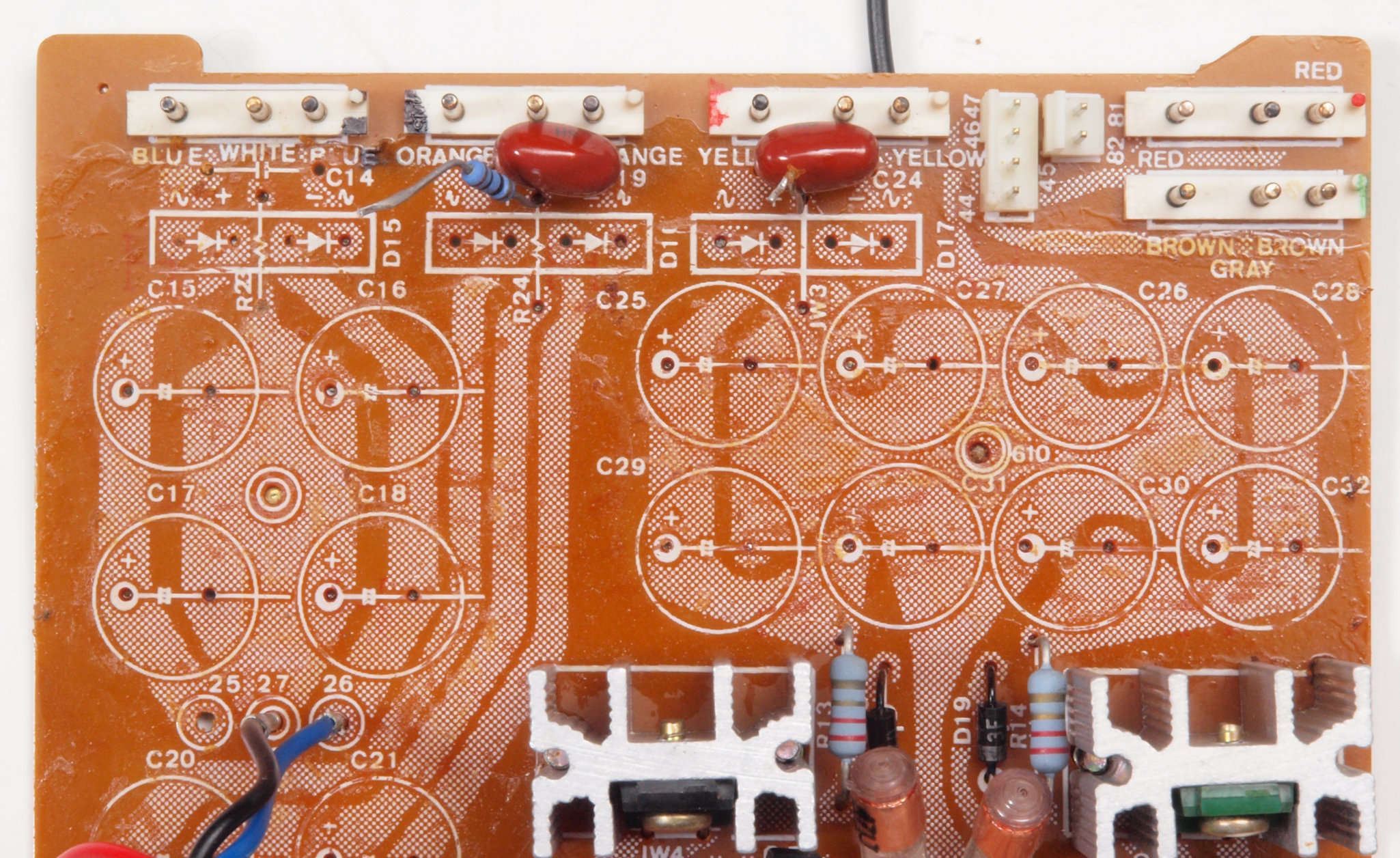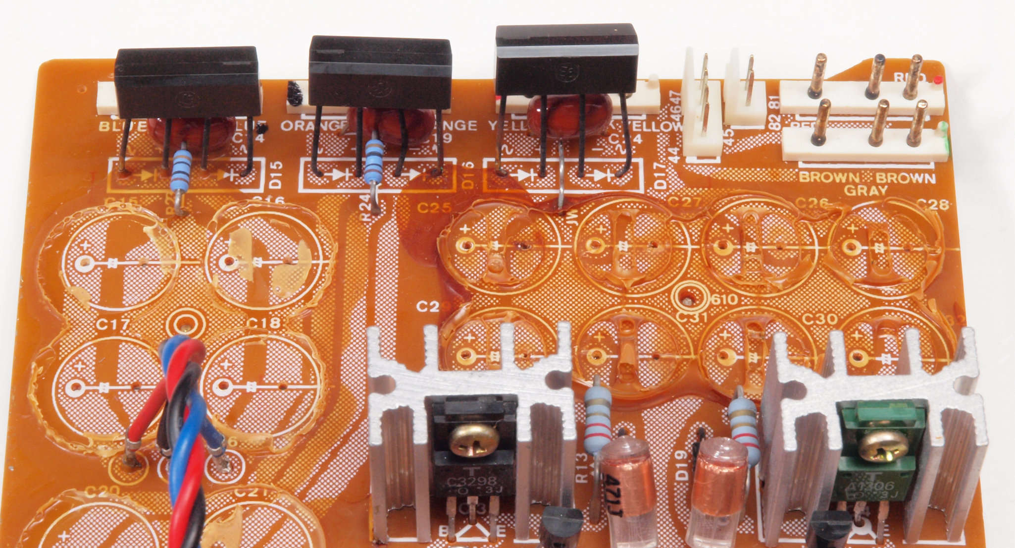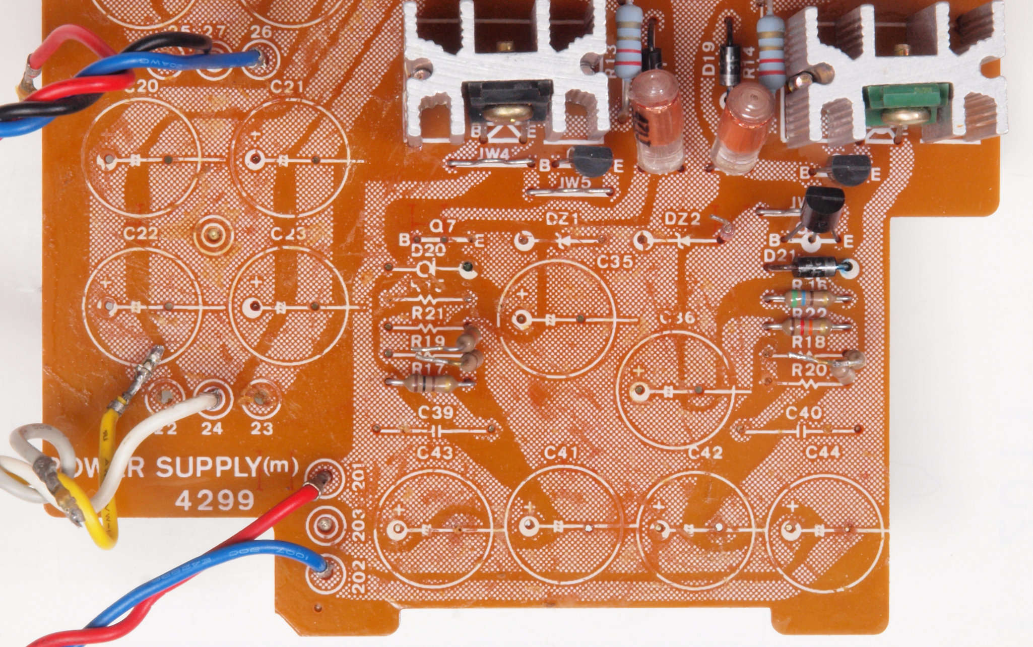 C428. 修理中 右メイン・ドライブAMP基板。 電解コンデンサー固定トルエン溶媒の接着剤が電源端子を腐食。