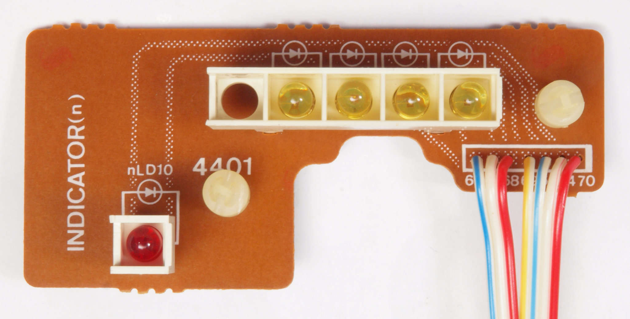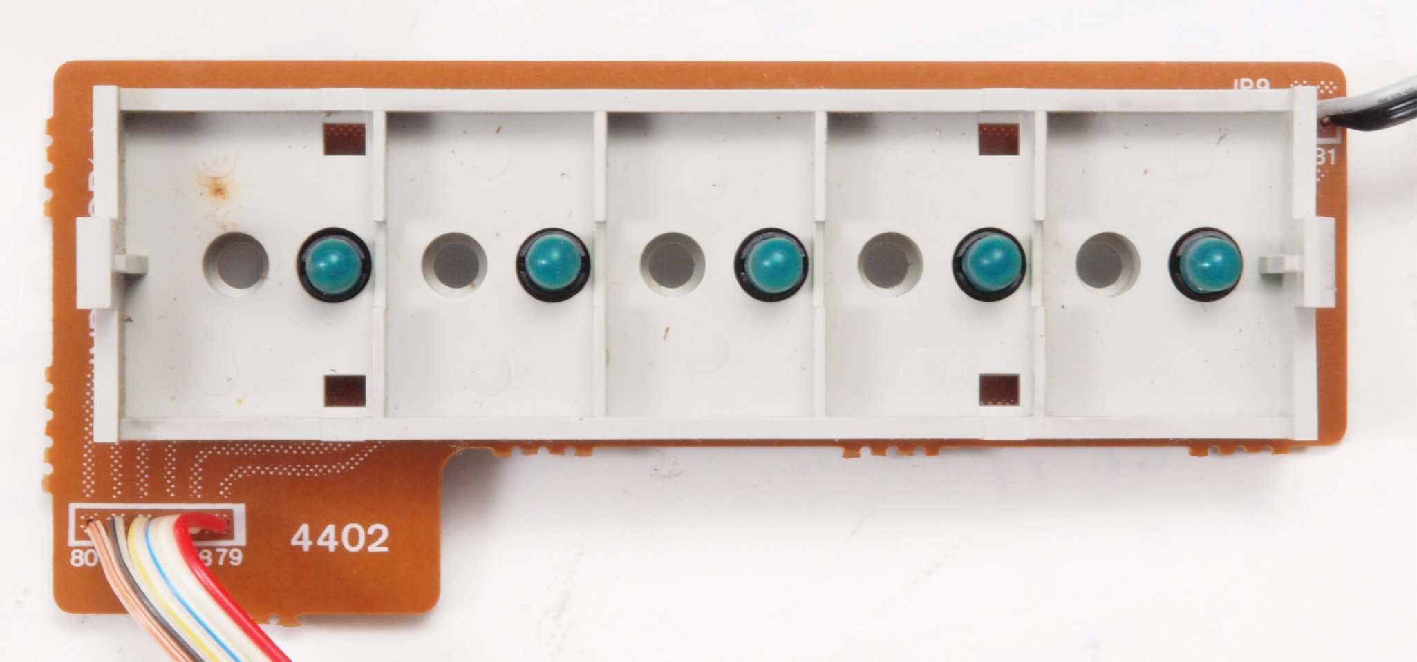 表示LED、 左端=メモリーNo、 中左=周波数測定、 中右=出力電圧測定、 右端=歪み率測定。