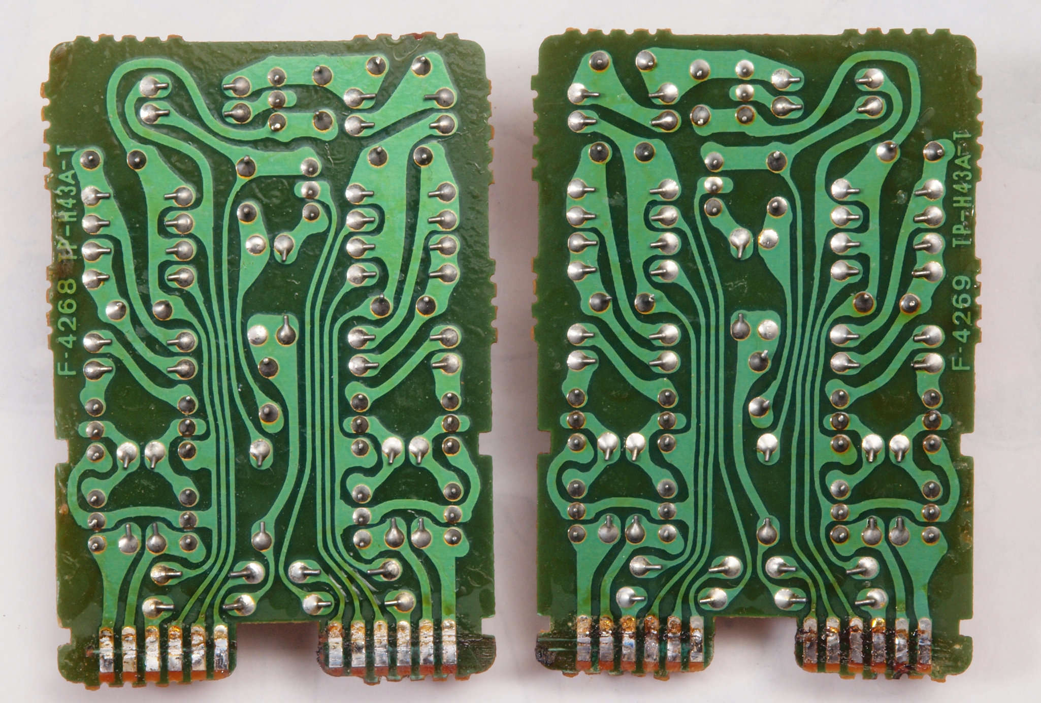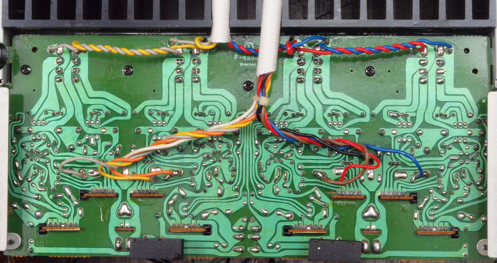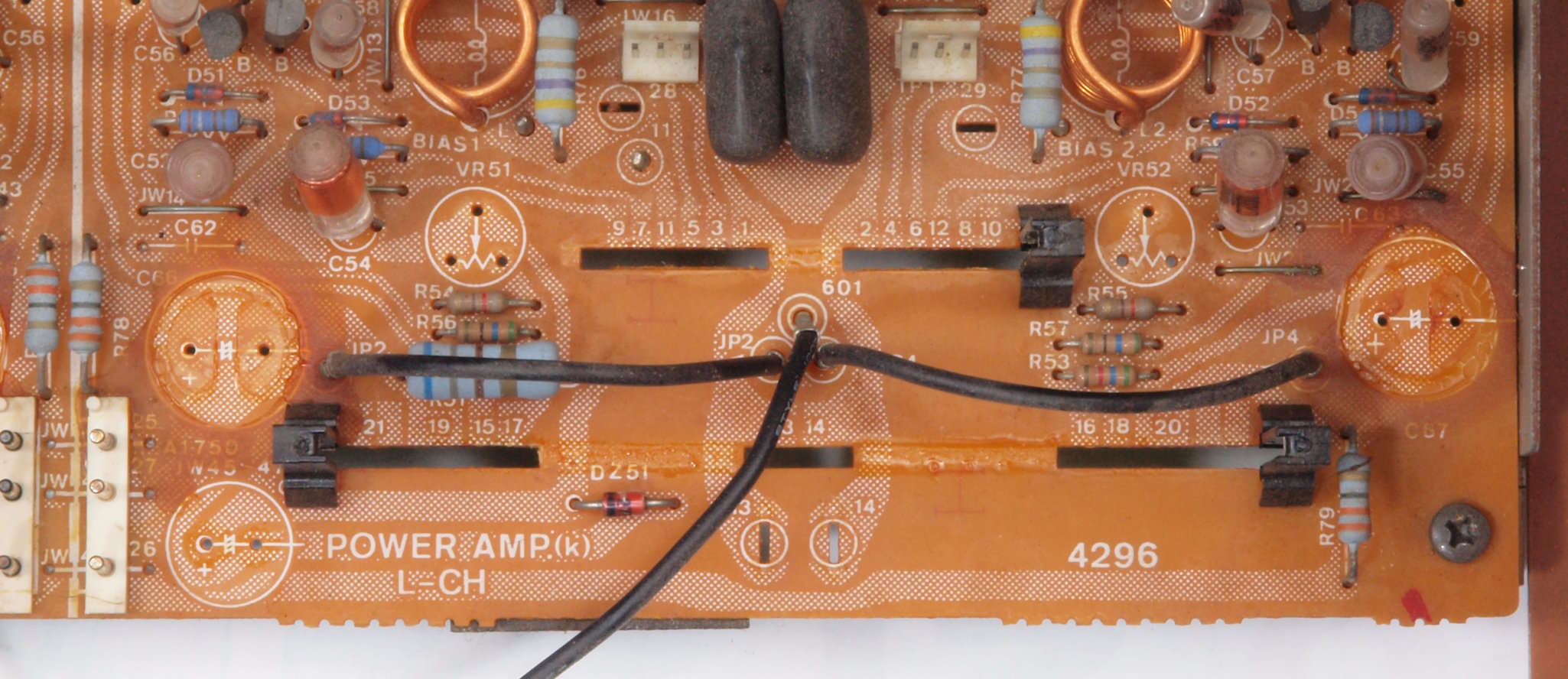 C46. 修理後 メイン・ドライブAMP基板裏。 差込基板の半田端子にストレスを掛けない様に隙間に厚紙挿入。