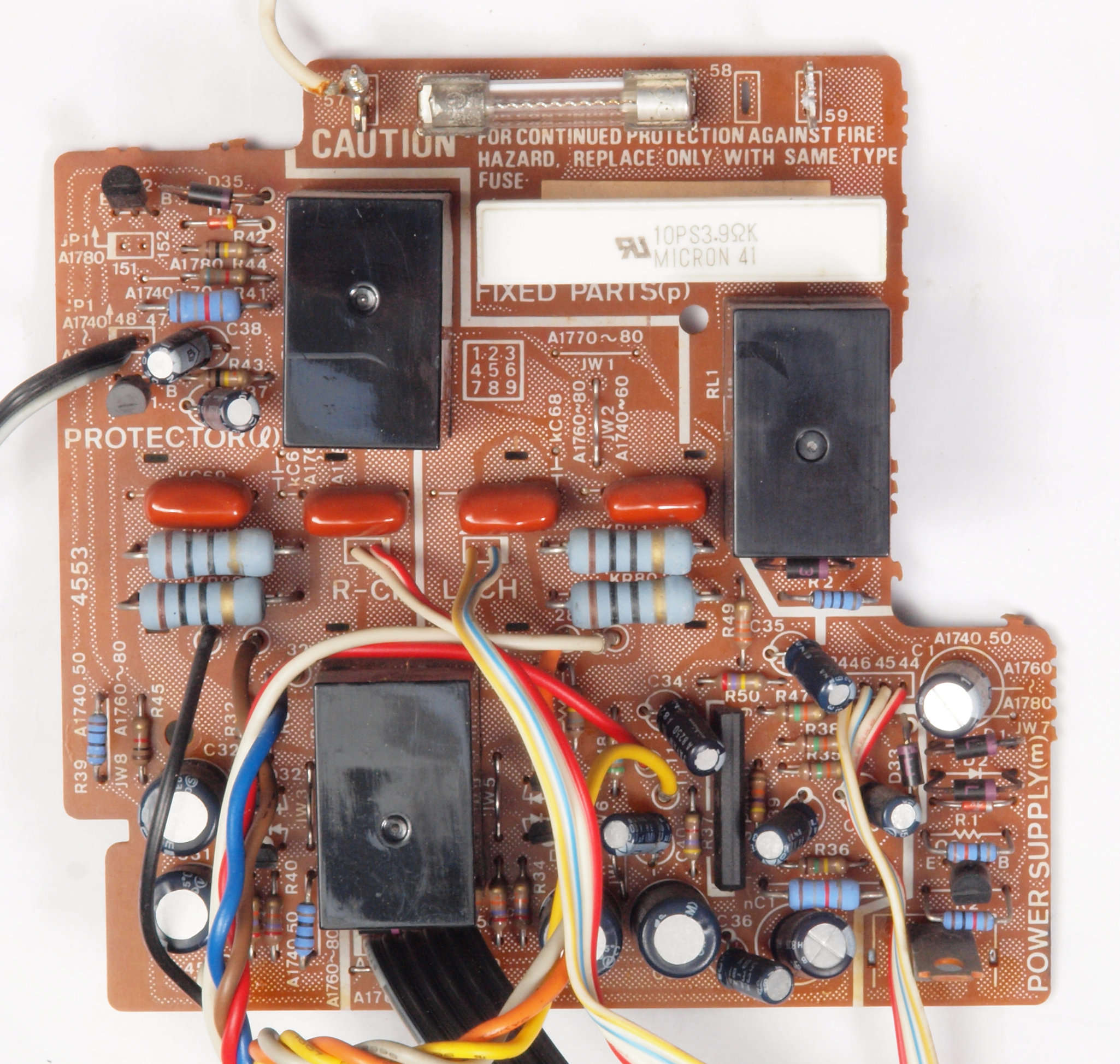 A1E. 点検中 電源ブロック電解コンデンサーの頭のビニール膨らみは無。