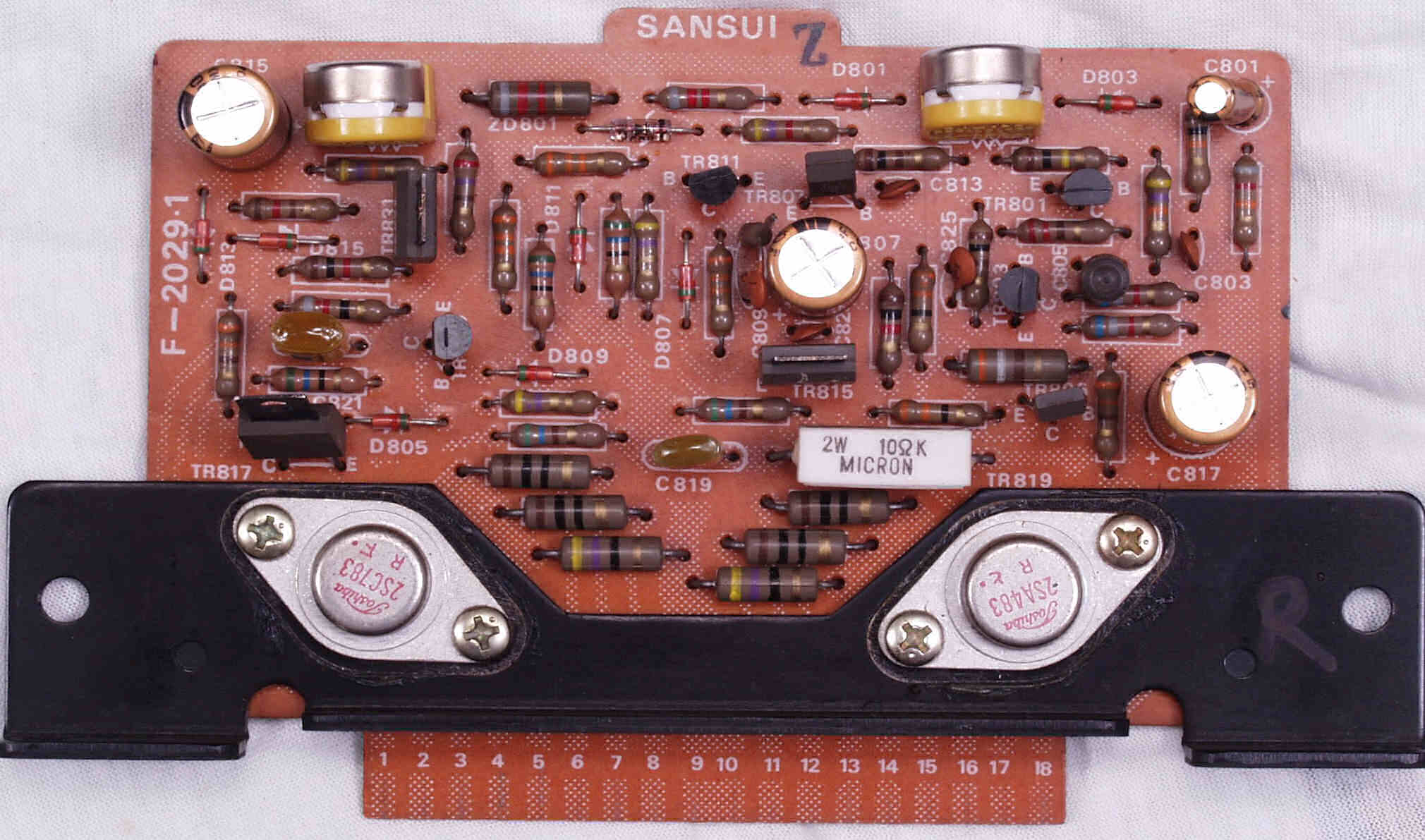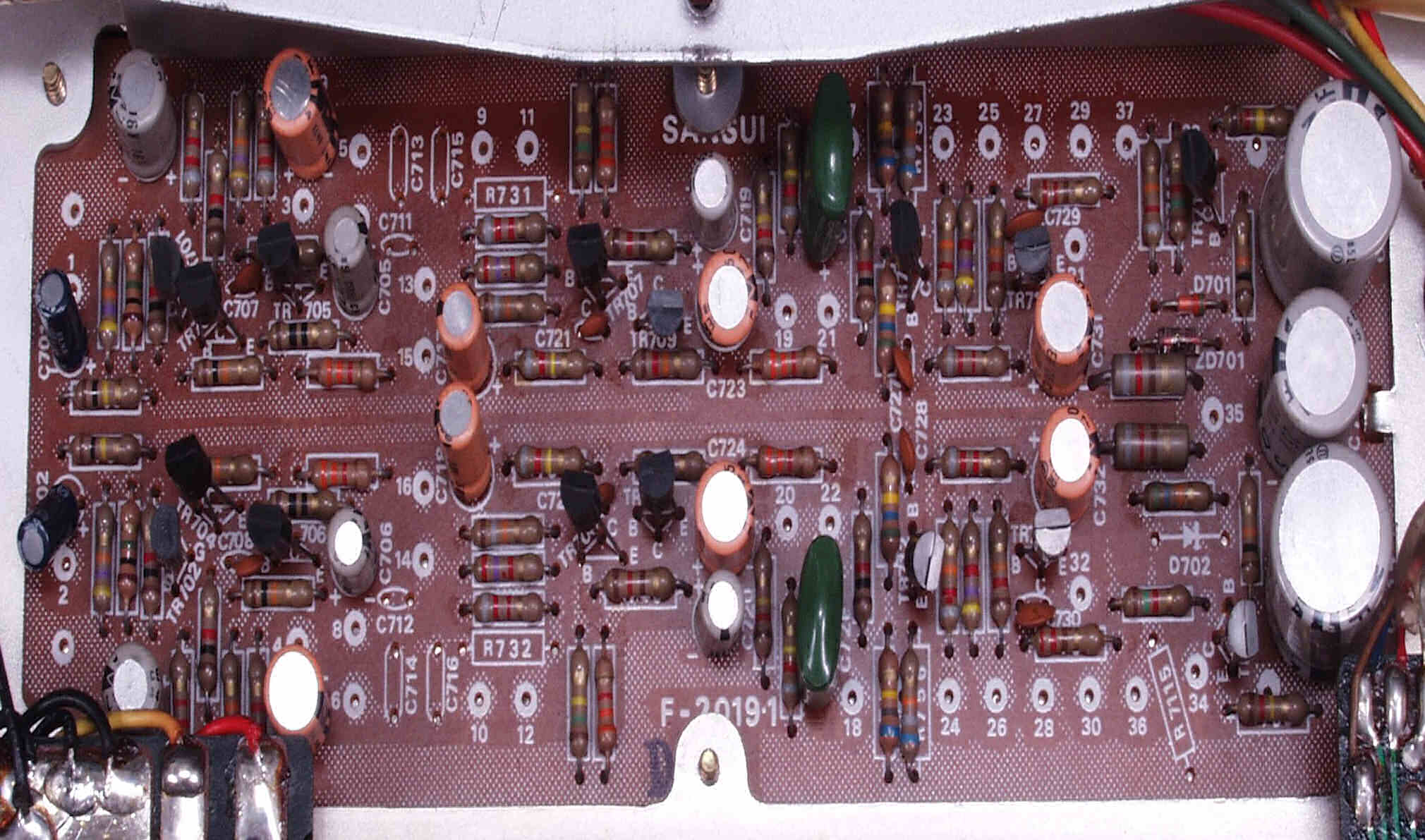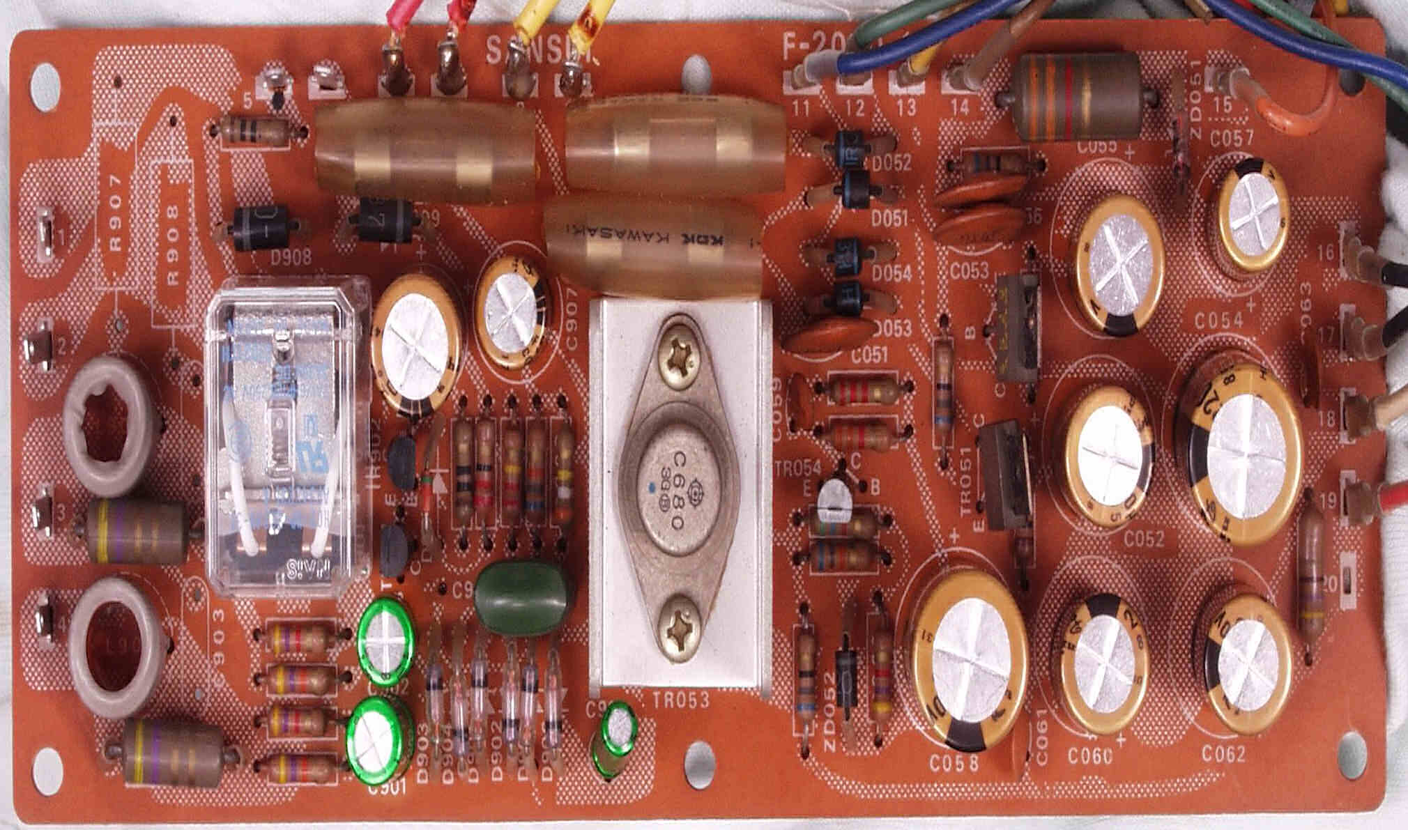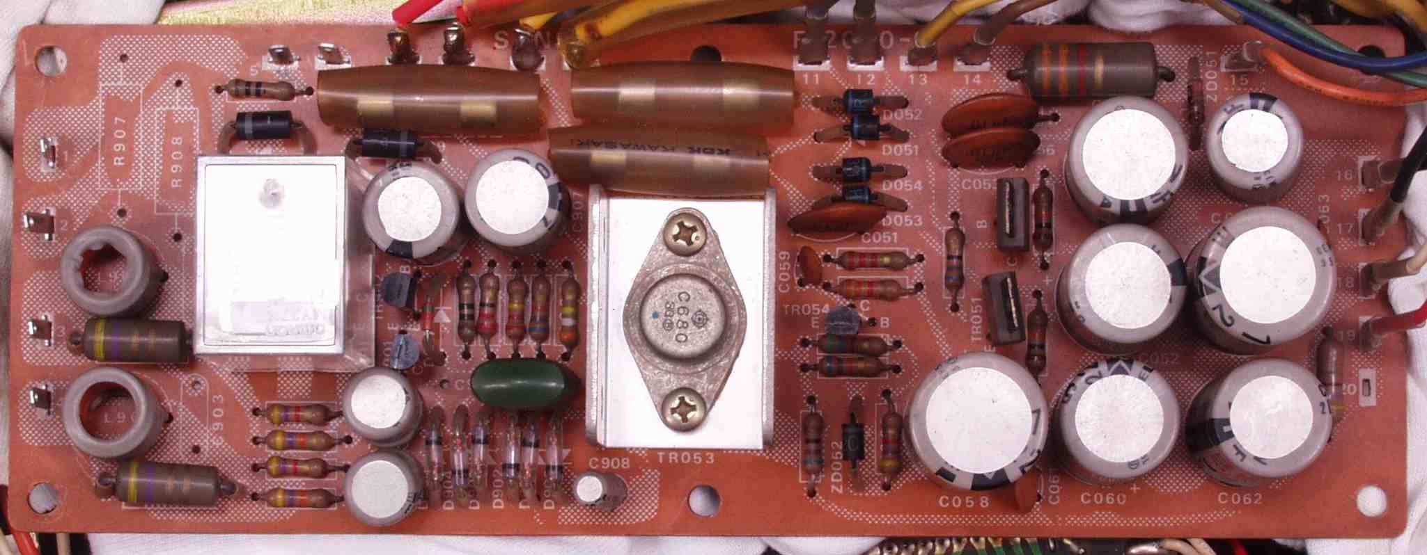C−2B. 修理後 R側終段基板 TR(トランジスター)2個 半固定VR2個 電解コンデンサー4個 フイルムコンデンサー2個交換
