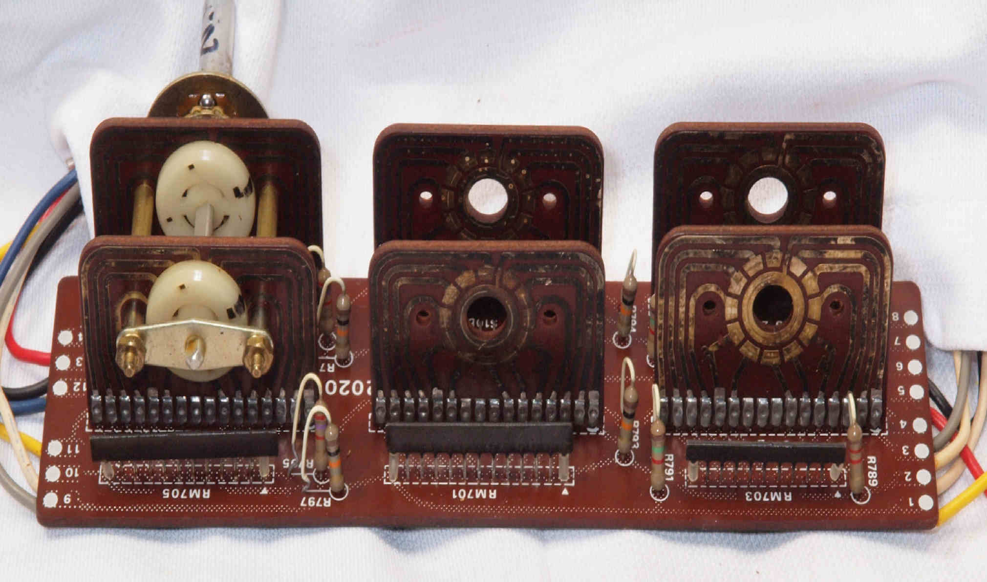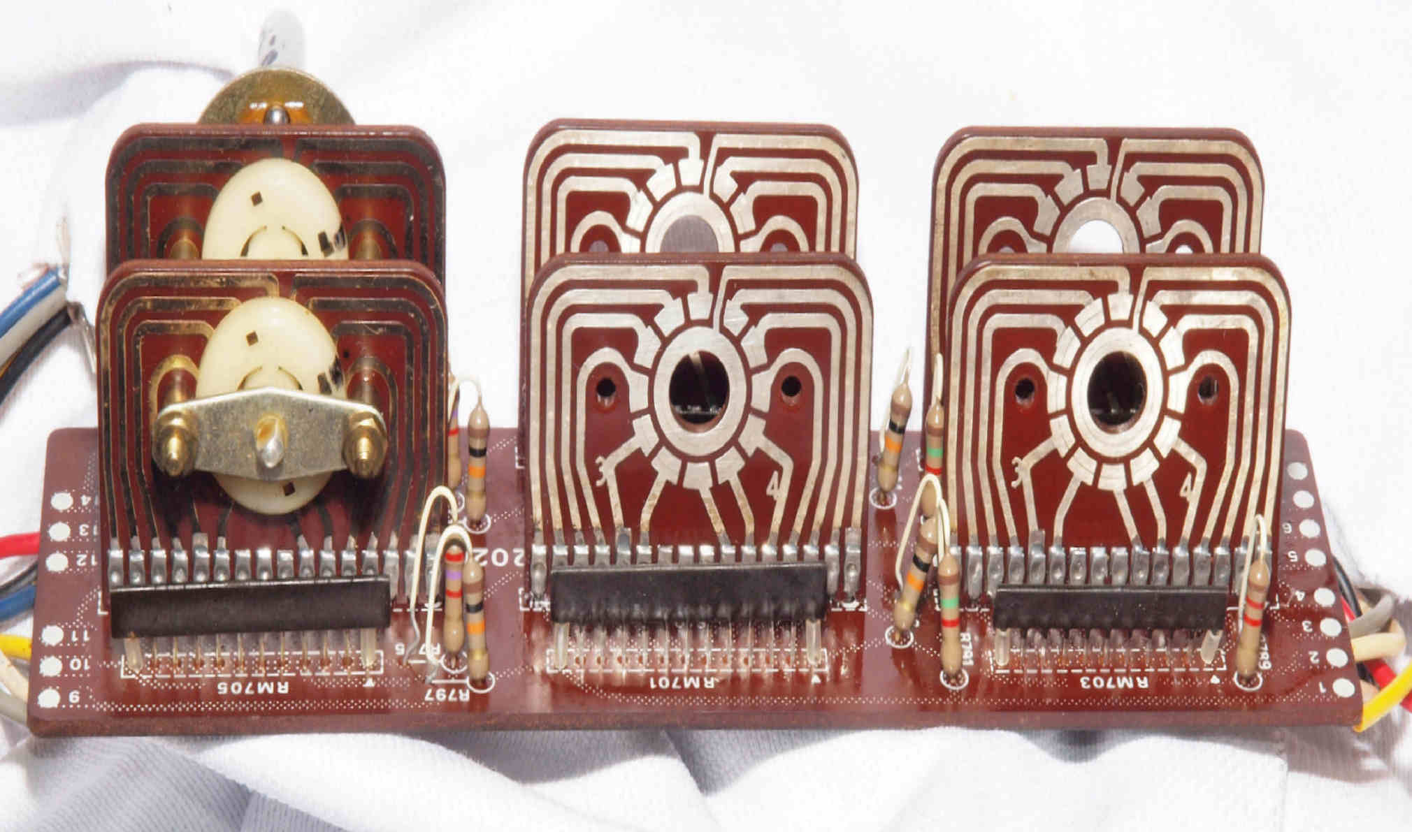 | C73. 修理中 TONE−VR基板、左=清掃前、右2個=清掃後。 | ||||||||||||||||||||||||||||||||||||||||||