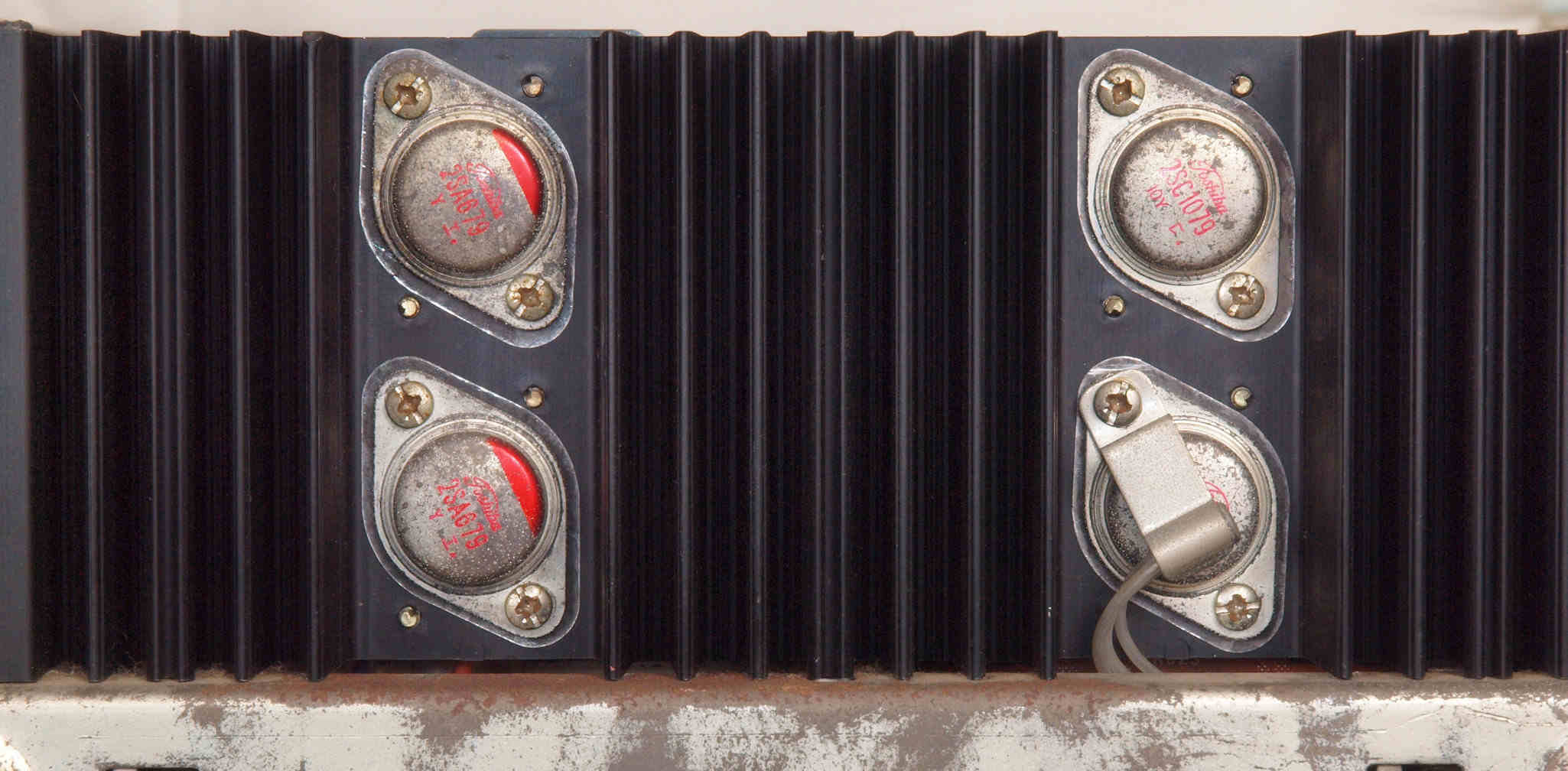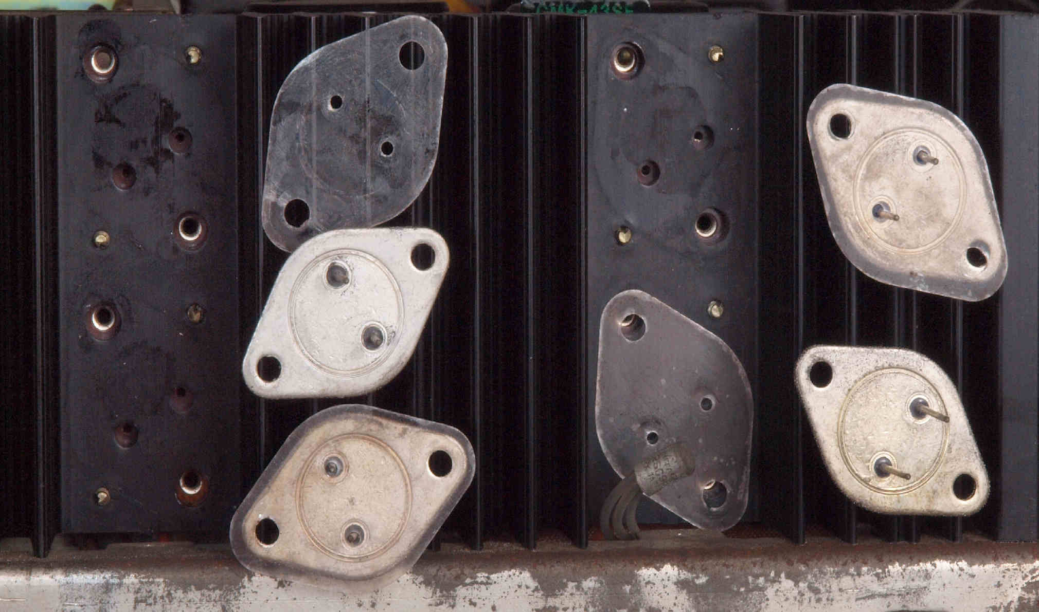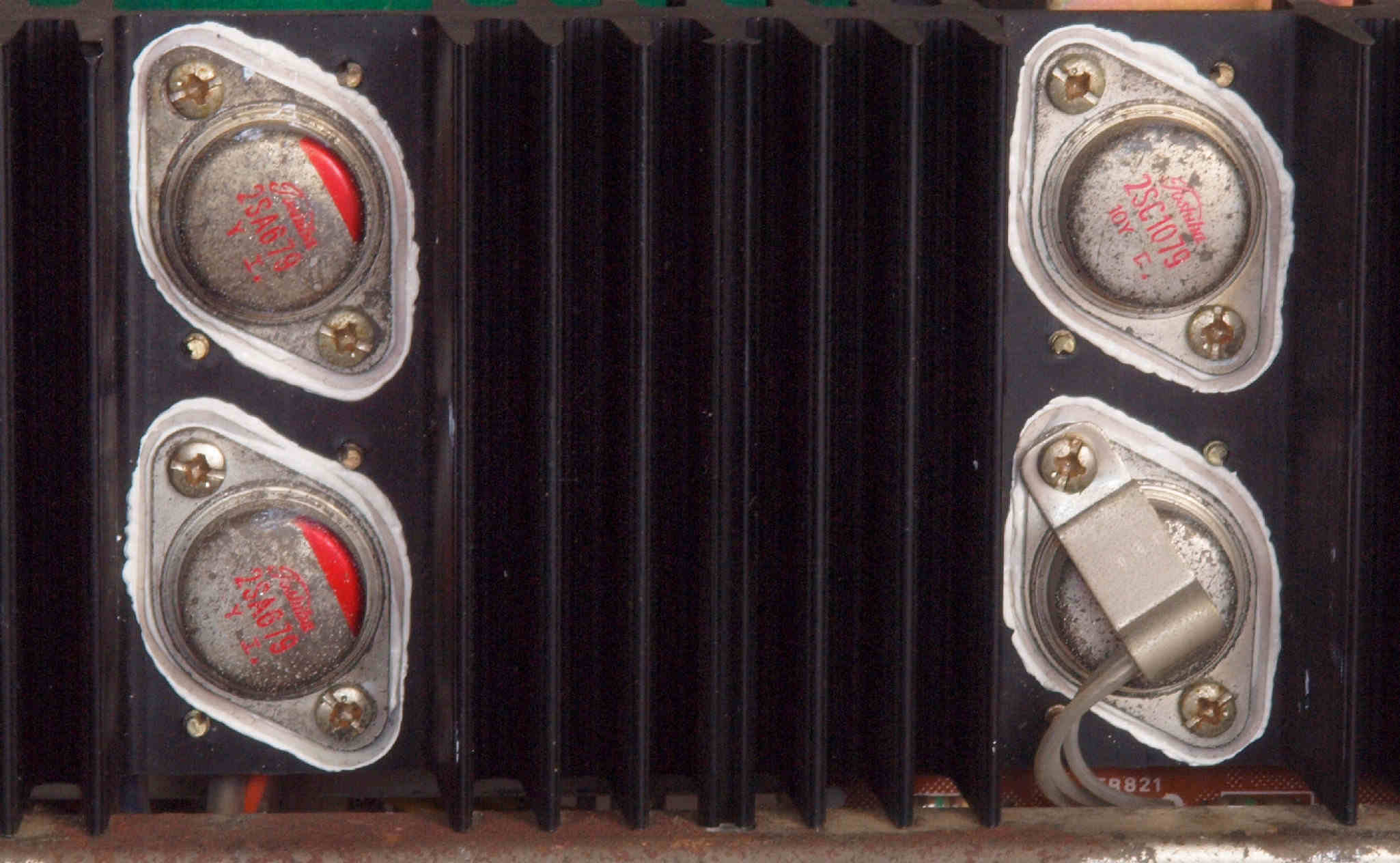 | C. 修理状況。 画像をクリックすると、大きく(横幅2050ドット)表示されます。 C11. 修理前 R側 終段トランジスター 熱でシリコングリスが流れ出し殆ど無い |