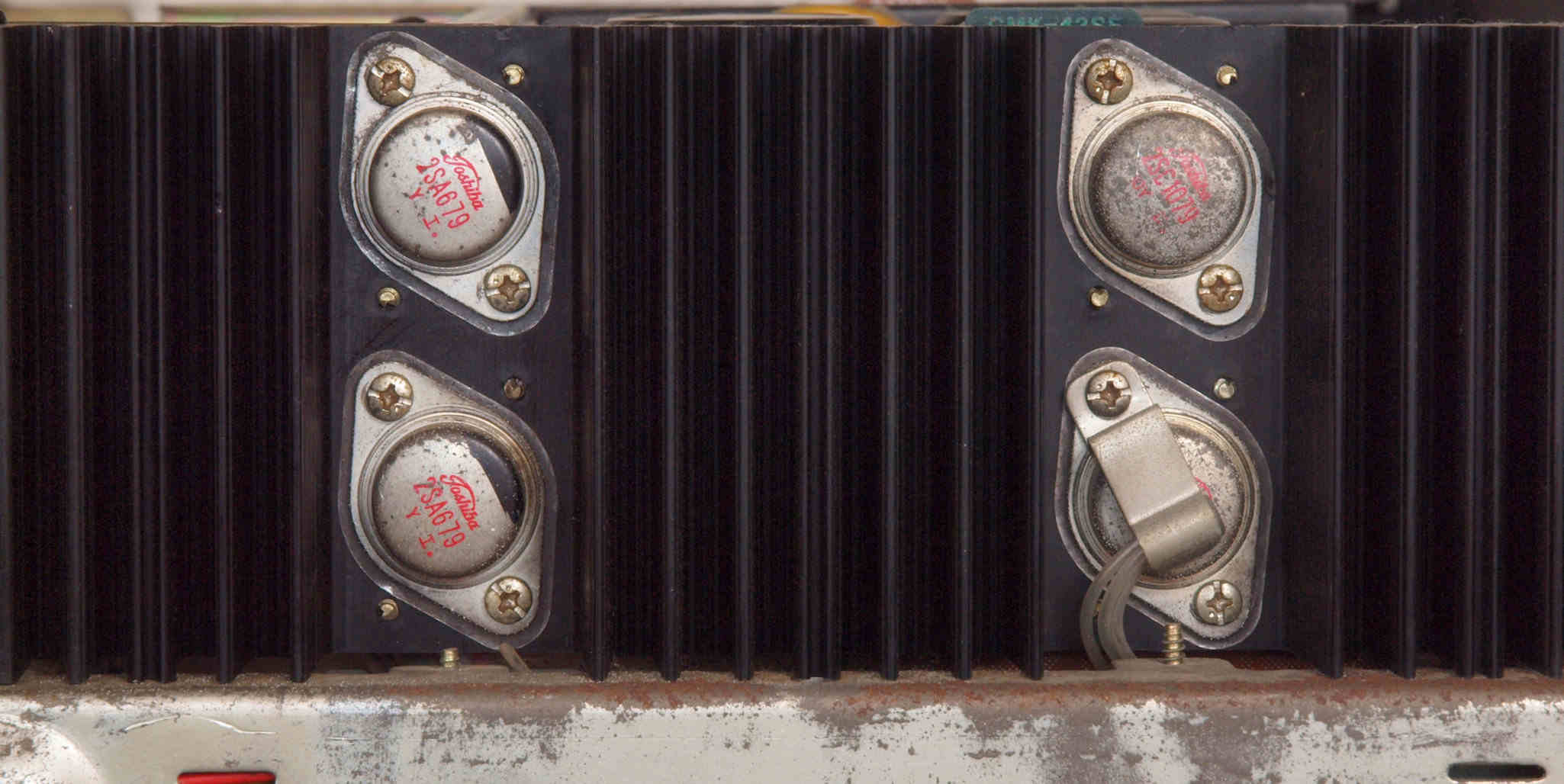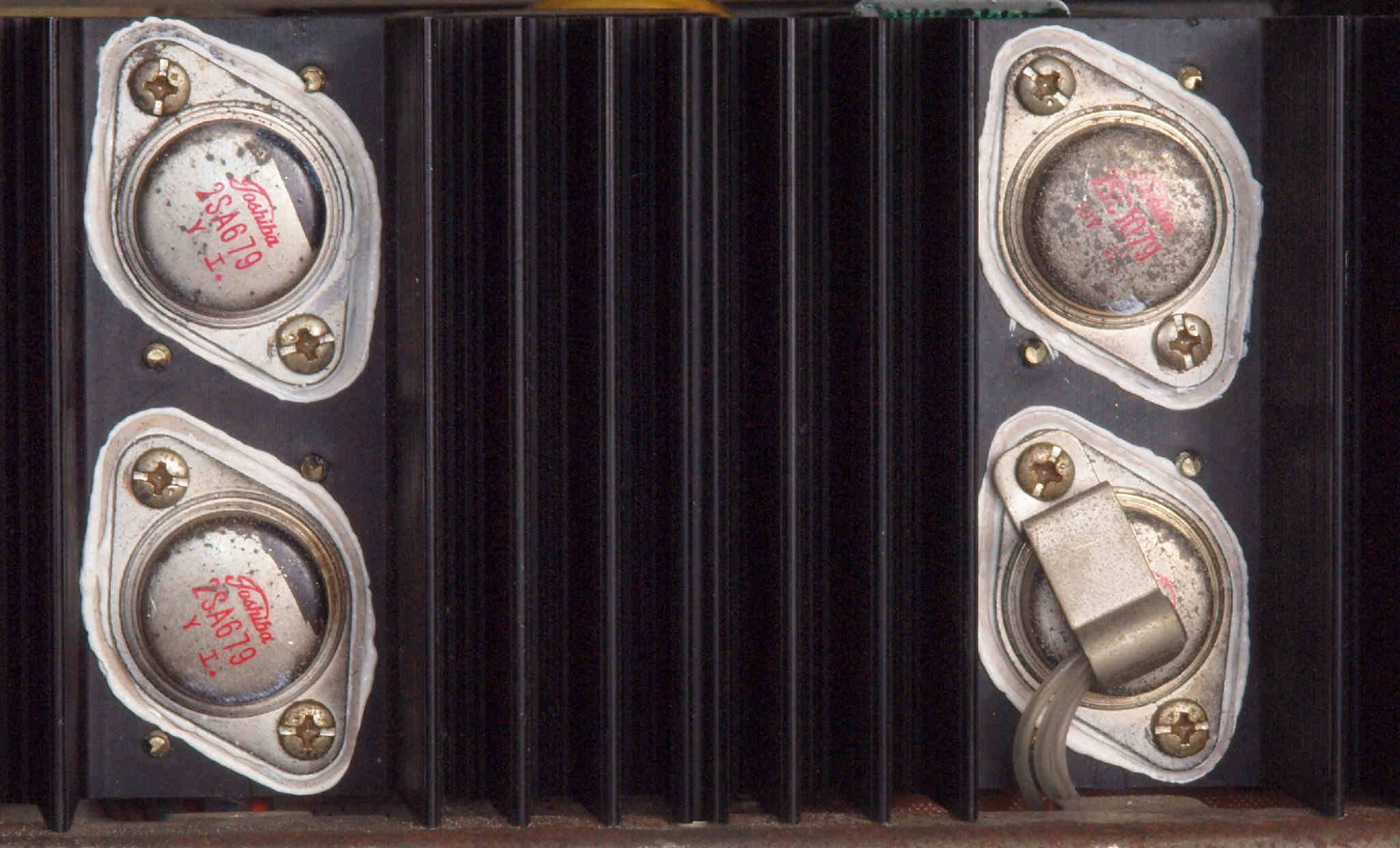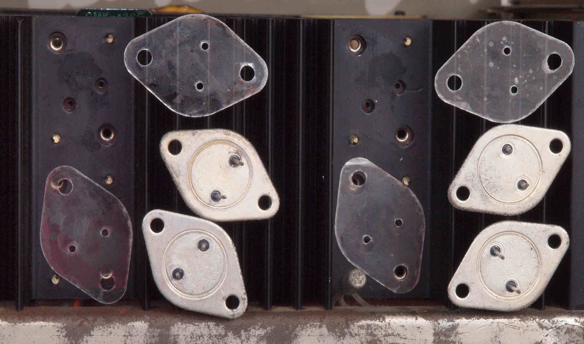 | C. 修理状況。 画像をクリックすると、大きく(横幅2050ドット)表示されます。 C11. 修理前 R側 終段トランジスター 熱でシリコングリスが流れ出し殆ど無い |