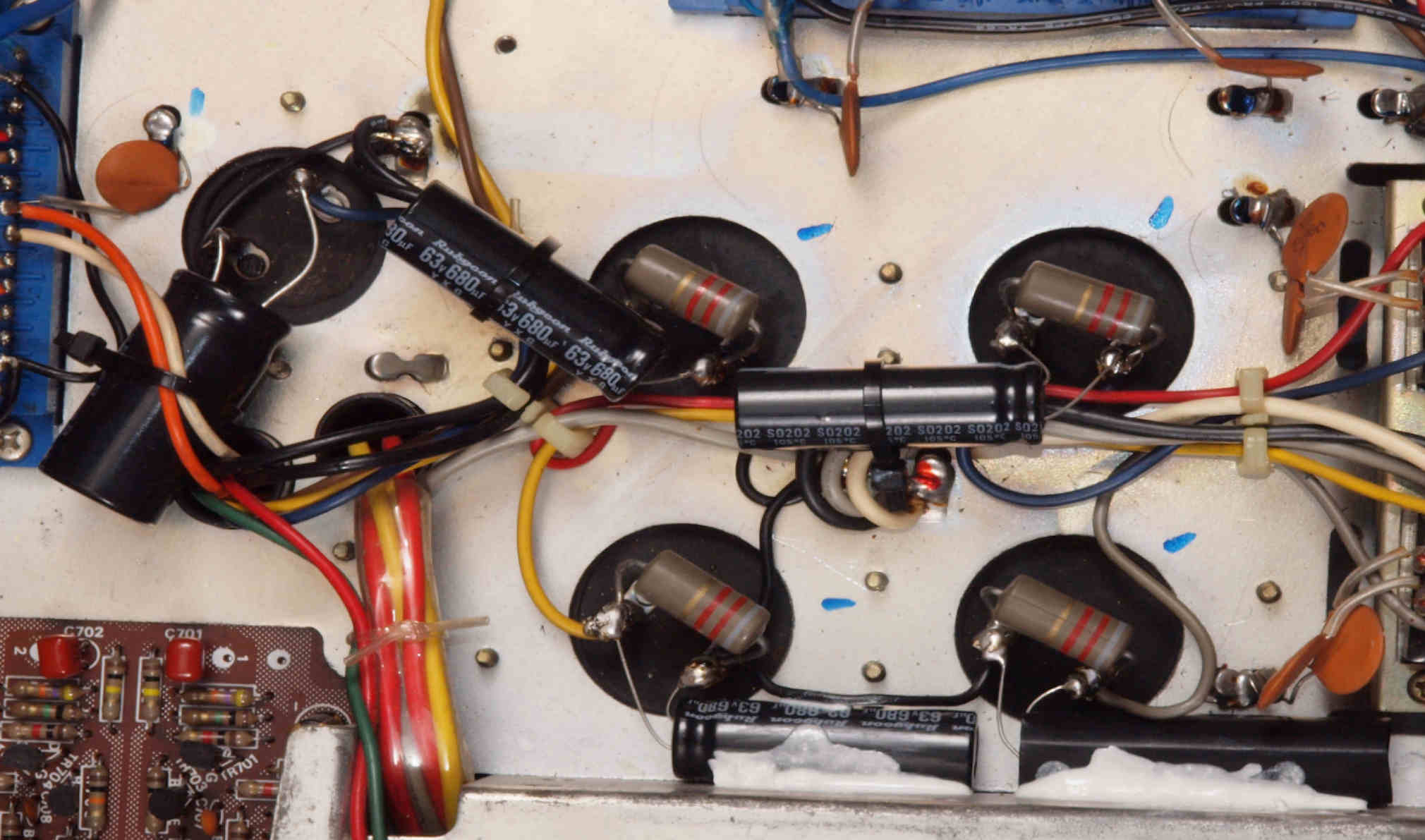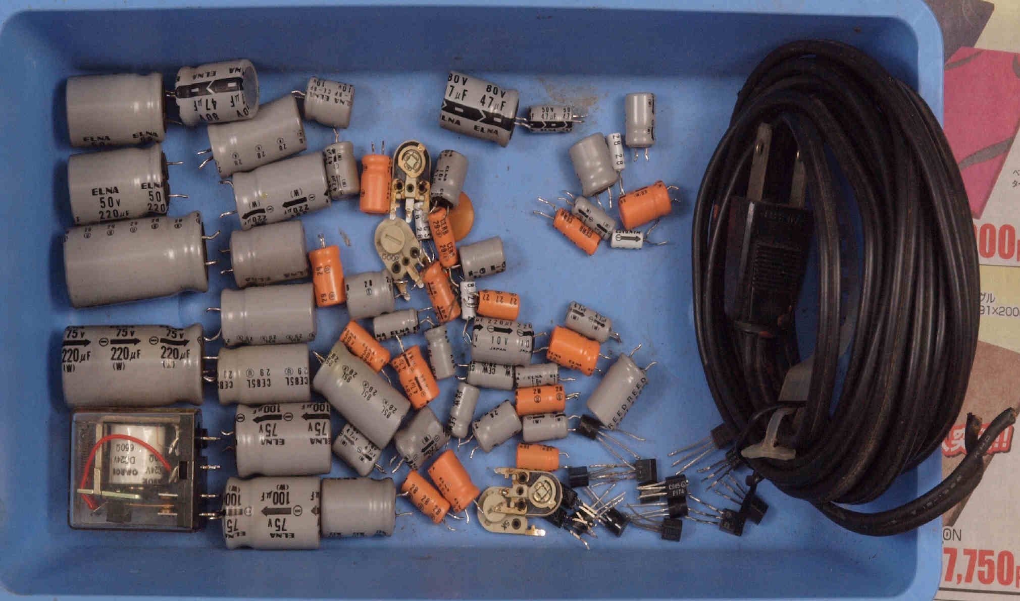 | CE2. 修理後 電源ブロック電解コンデンサー下周り。 電解コンデンサー5個、経年変化を考慮して増強する | ||||||||||||||||||||||||||||||||||||||||||