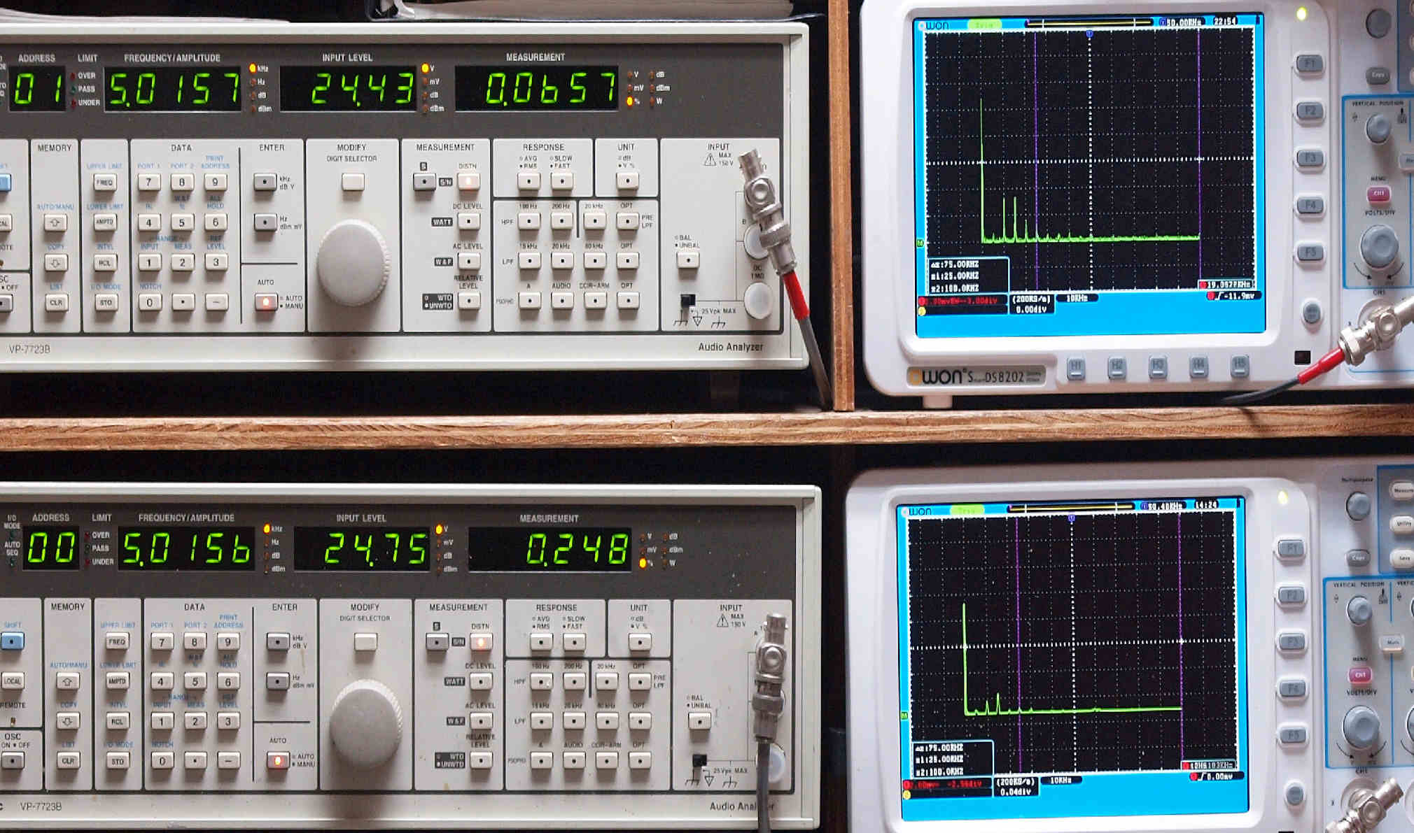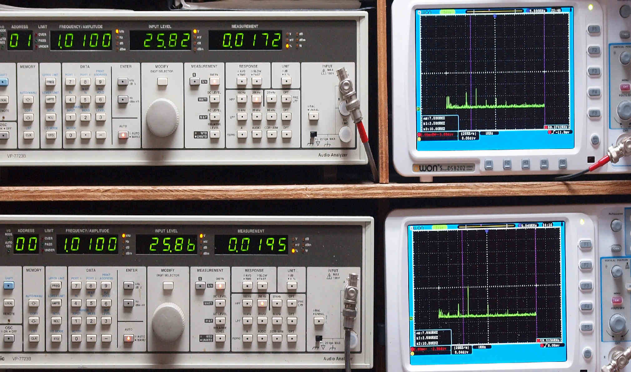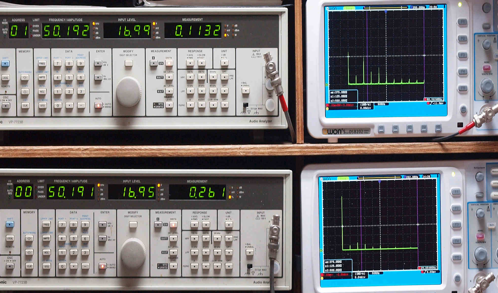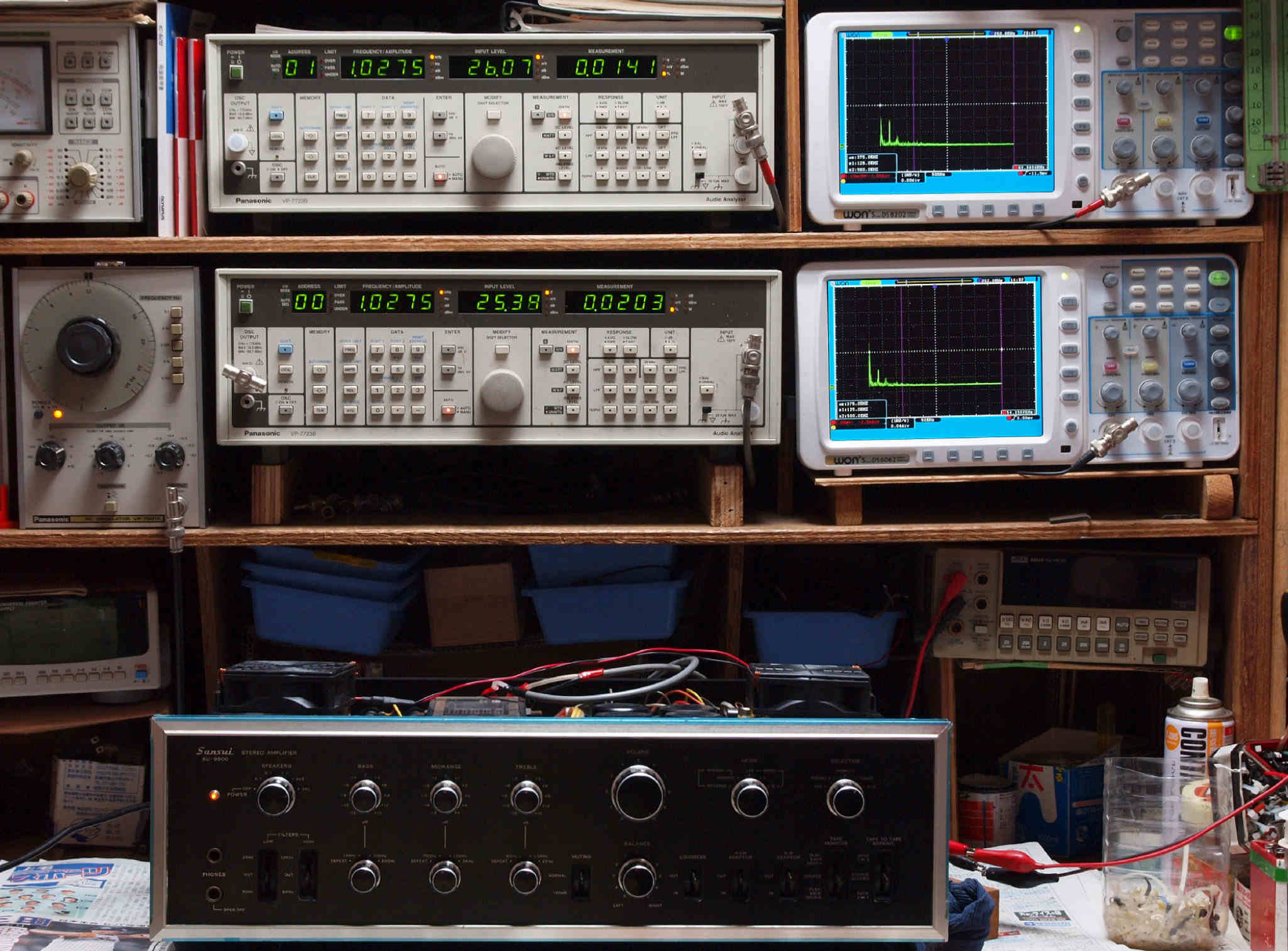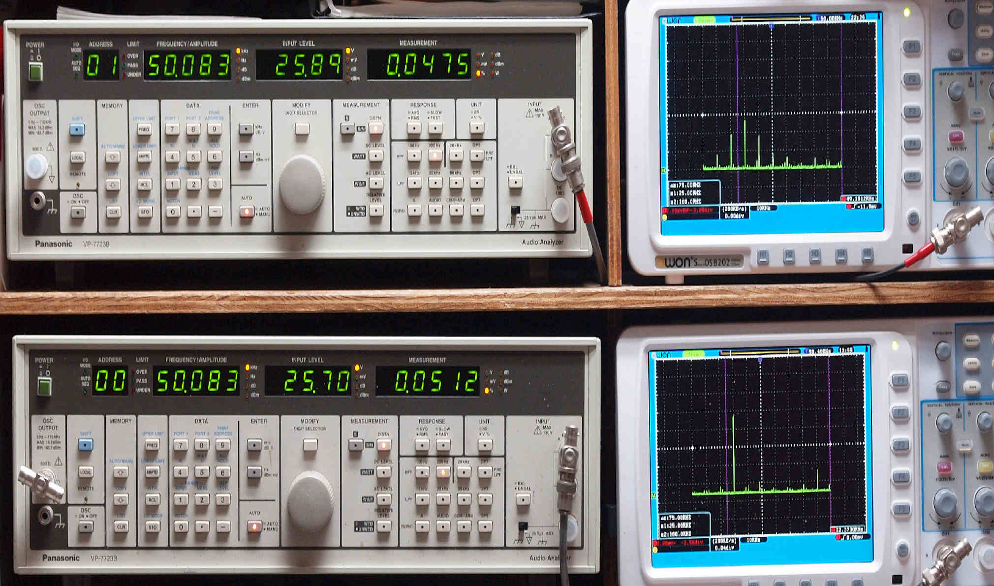 | E. 測定・調整。 画像をクリックすると、大きく(横幅2050ドット)表示されます。 E1. 出力・歪み率測定・調整 「見方」。 上段中 右側SP出力を「Audio Analyzer Panasonic VP−7723B」により測定。 表示LED、 左端=メモリーNo、 中左=周波数測定、 中右=出力電圧測定、 右端=歪み率測定。 上段右端 VP−7723Bの基本波除去出力を「owon SDS8202(200MHZ)」で「FFT分析」表示。 下段中 左側SP出力を「Audio Analyzer Panasonic VP−7723B」により測定。 表示LED、 左端=メモリーNo、 中左=周波数測定、 中右=出力電圧測定、 右端=歪み率測定。 下段右端 VP−7723Bの基本波除去出力を「owon SDS6062(200MHZ)」で「FFT分析」表示。 下段左端 オーディオ発振器 VP−7201A より50Hz〜100kHzの信号を出し(歪み率=約0.003%)、ATT+分配器を通し、AMPに入力。 よって、ダイアル設定出力レベルより低くなります。測定機器の仕様や整備の様子はこちら、「VP−7723B」「VP−7201A」。 FFT画面の見方はこちら。 |