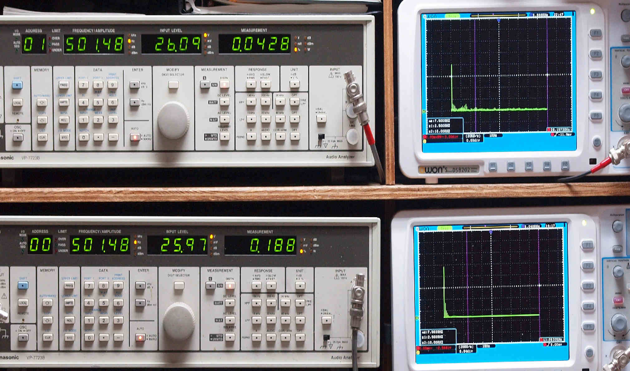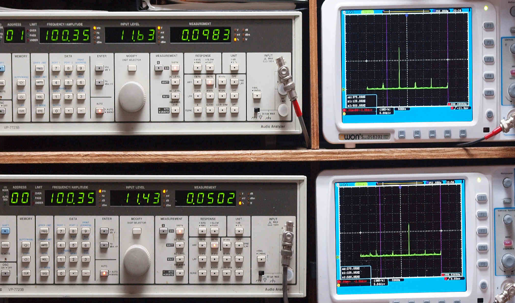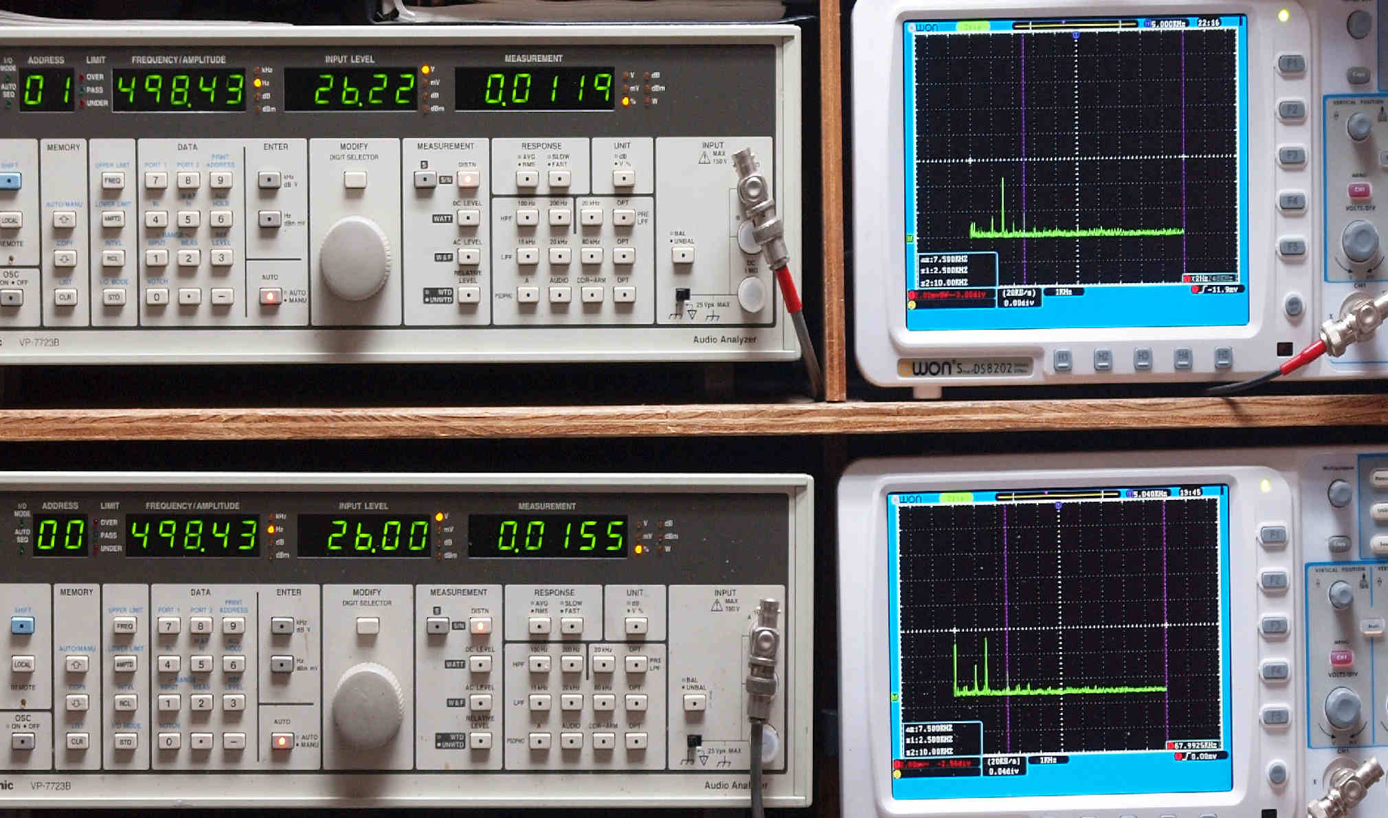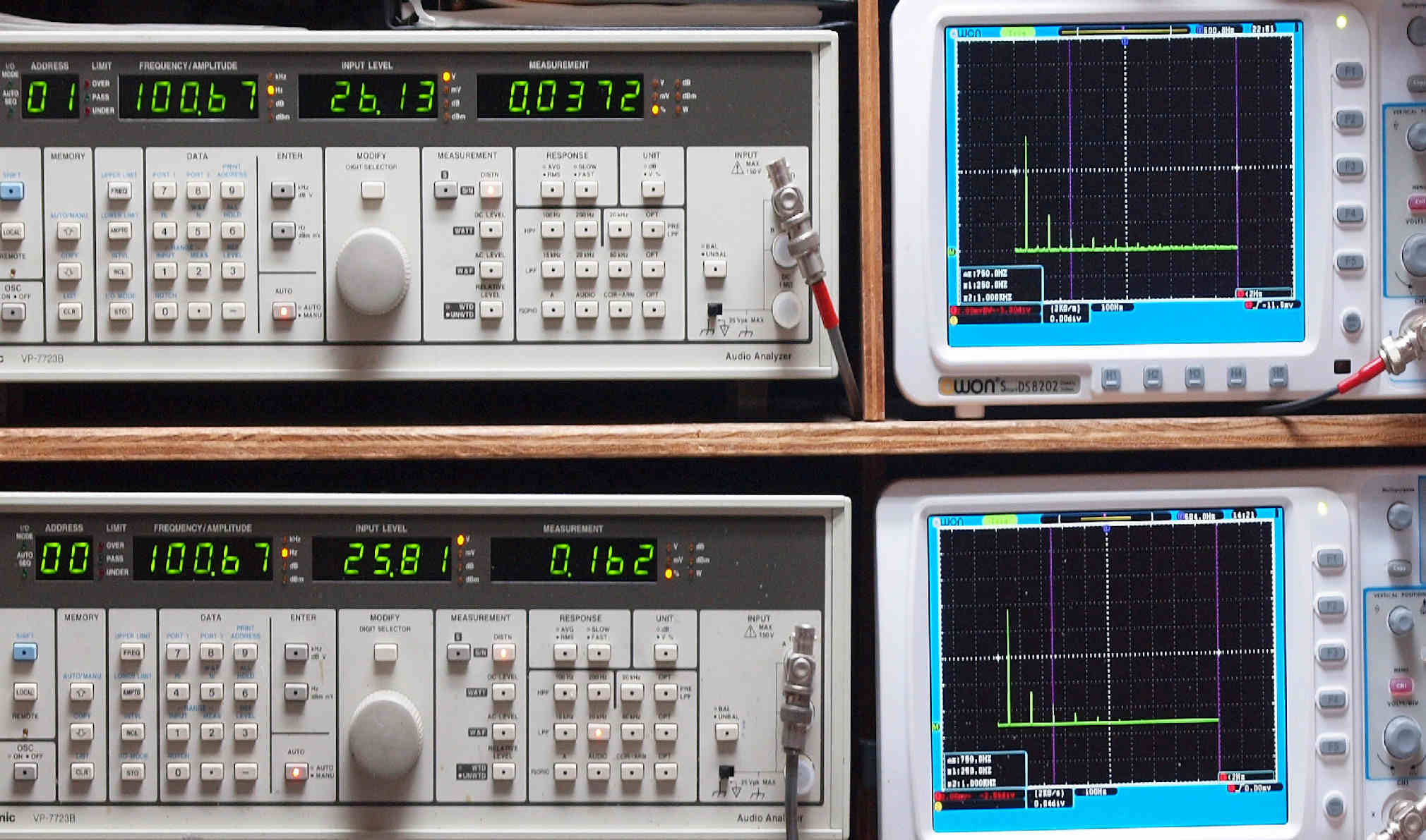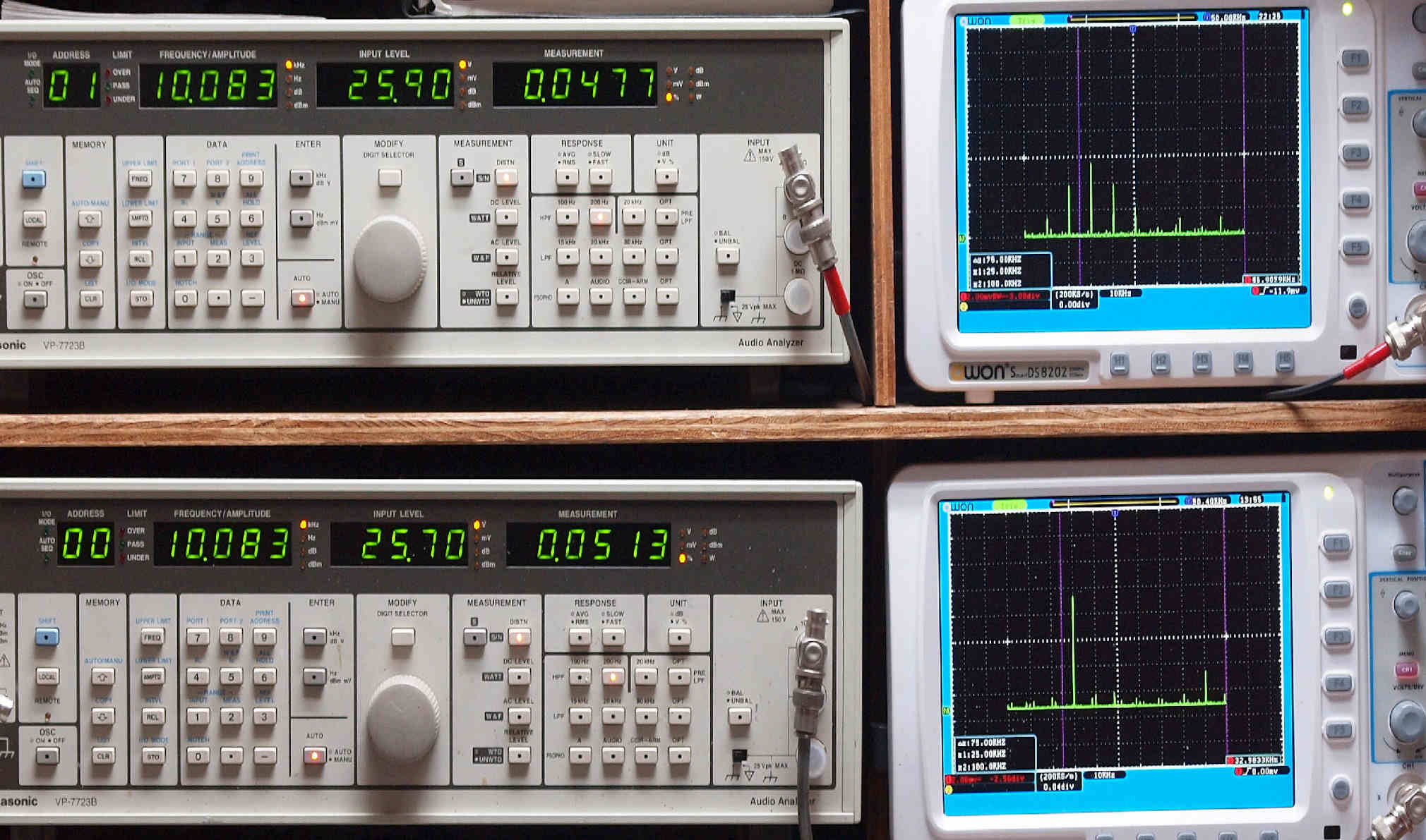 | E. 測定・調整。 画像をクリックすると、大きく(横幅2050ドット)表示されます。 E1. 出力・歪み率測定・調整 「見方」。 上段中 右側SP出力を「Audio Analyzer Panasonic VP−7723B」により測定。 表示LED、 左端=メモリーNo、 中左=周波数測定、 中右=出力電圧測定、 右端=歪み率測定。 上段右端 VP−7723Bの基本波除去出力を「owon SDS8202(200MHZ)」で「FFT分析」表示。 下段中 左側SP出力を「Audio Analyzer Panasonic VP−7723B」により測定。 表示LED、 左端=メモリーNo、 中左=周波数測定、 中右=出力電圧測定、 右端=歪み率測定。 下段右端 VP−7723Bの基本波除去出力を「owon SDS6062(200MHZ)」で「FFT分析」表示。 下段左端 オーディオ発振器 VP−7201A より50Hz〜100kHzの信号を出し(歪み率=約0.003%)、ATT+分配器を通し、AMPに入力。 よって、ダイアル設定出力レベルより低くなります。測定機器の仕様や整備の様子はこちら、「VP−7723B」「VP−7201A」。 FFT画面の見方はこちら。 |