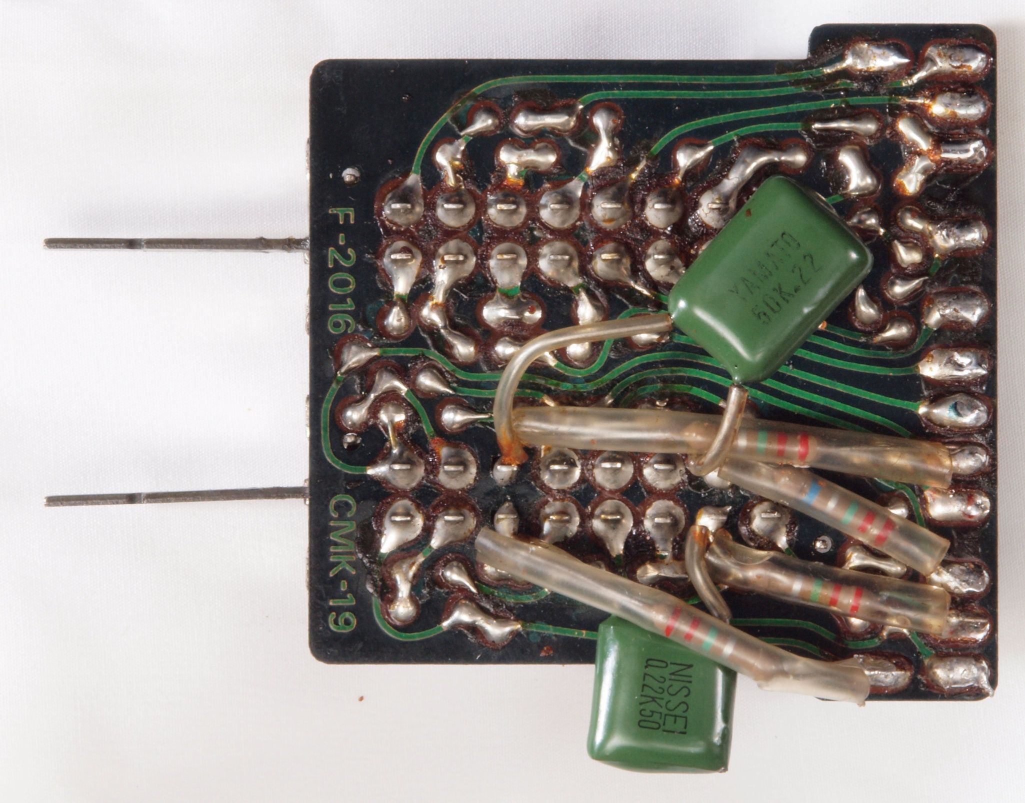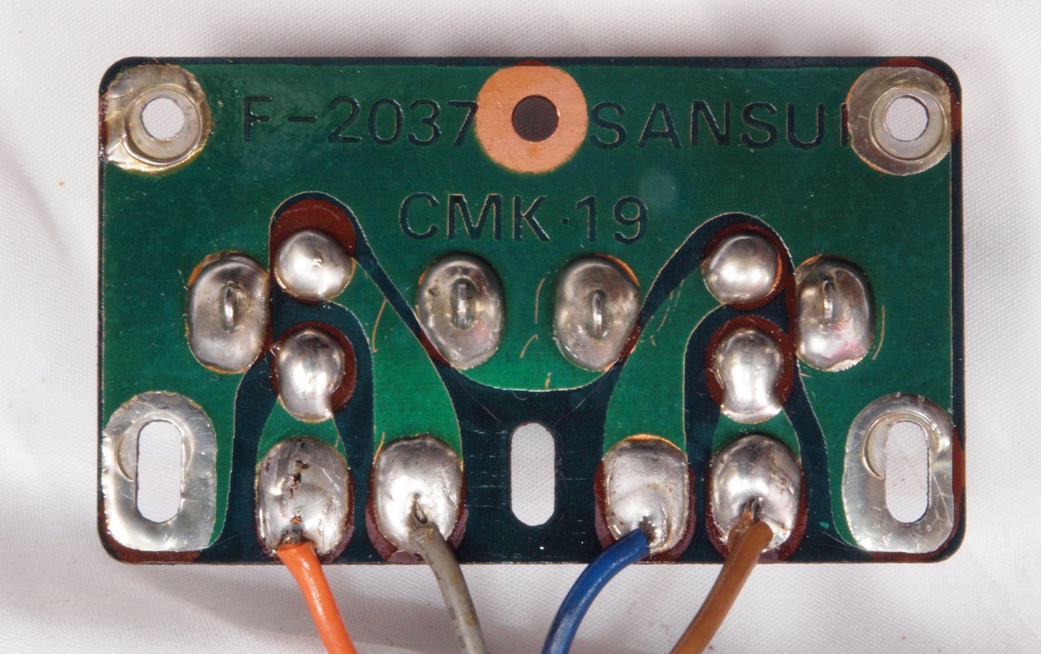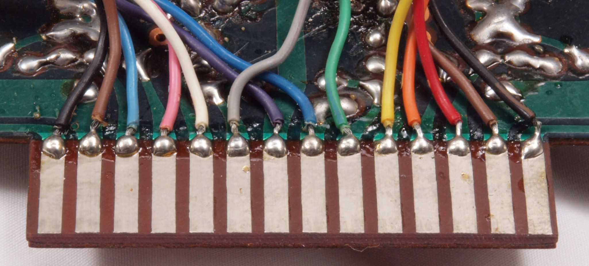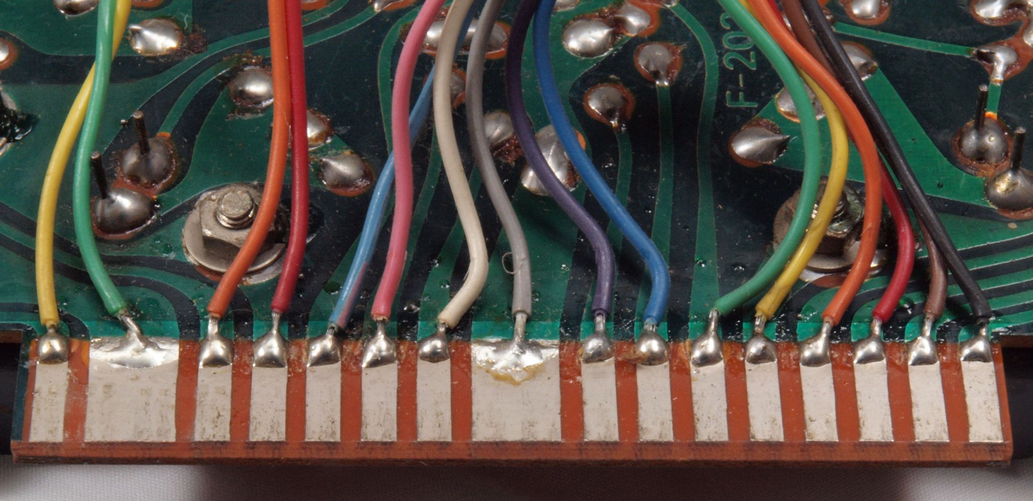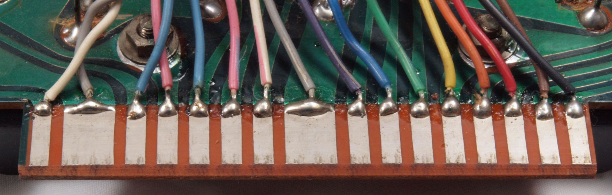 | C232. 修理中 R側終段基板裏 コネクターへのバイパス配線半田付け。銅箔が浮いている。当時は定温半田コテは無、腕が悪いと銅箔はく離が生じる。 | ||||||||||||||||||||||||||||||||||||||||||