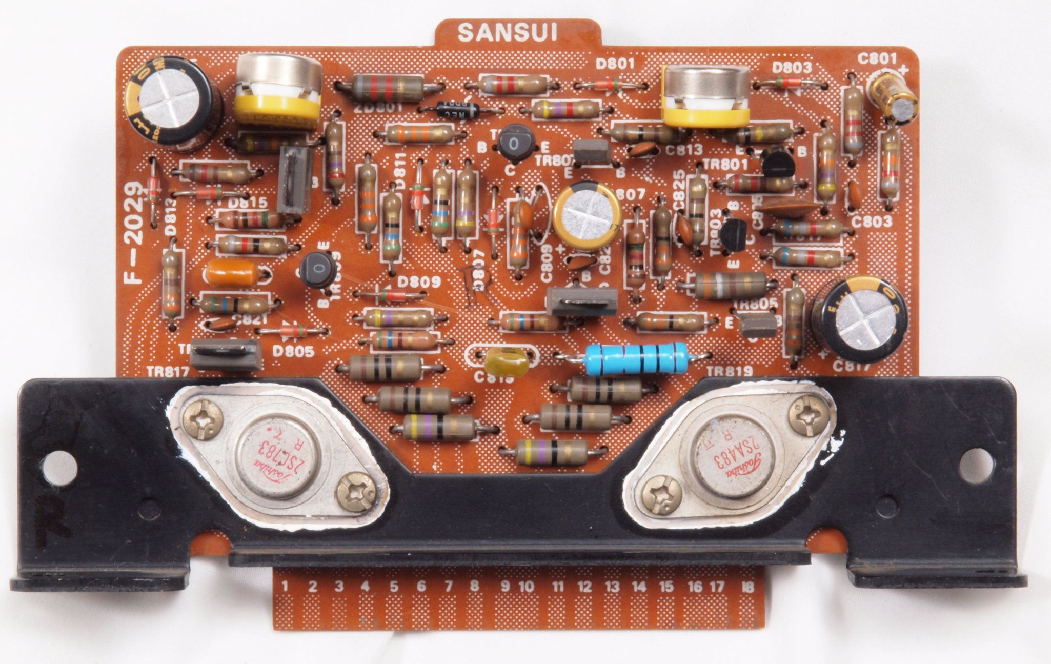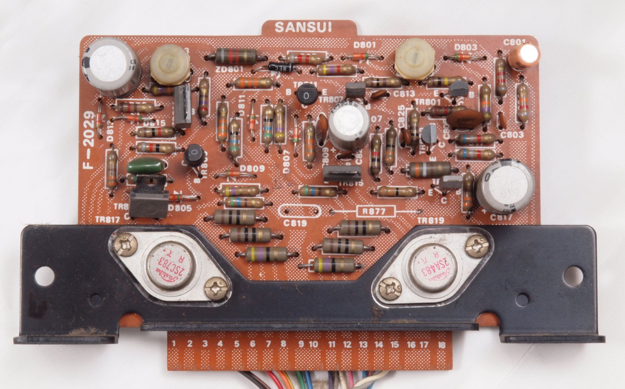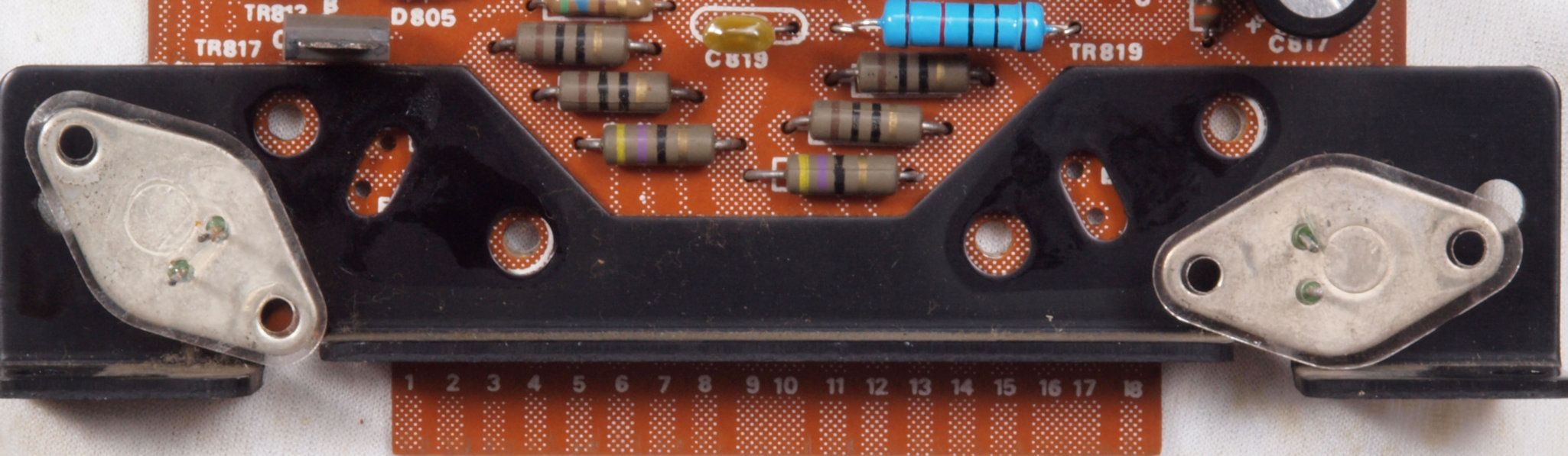 | C21. 修理前 R側終段基板。 半固定VR2個、TR(トランジスター)が2個交換されている。C819とR877が取り除かれている。 | ||||||||||||||||||||||||||||||||||||||||||