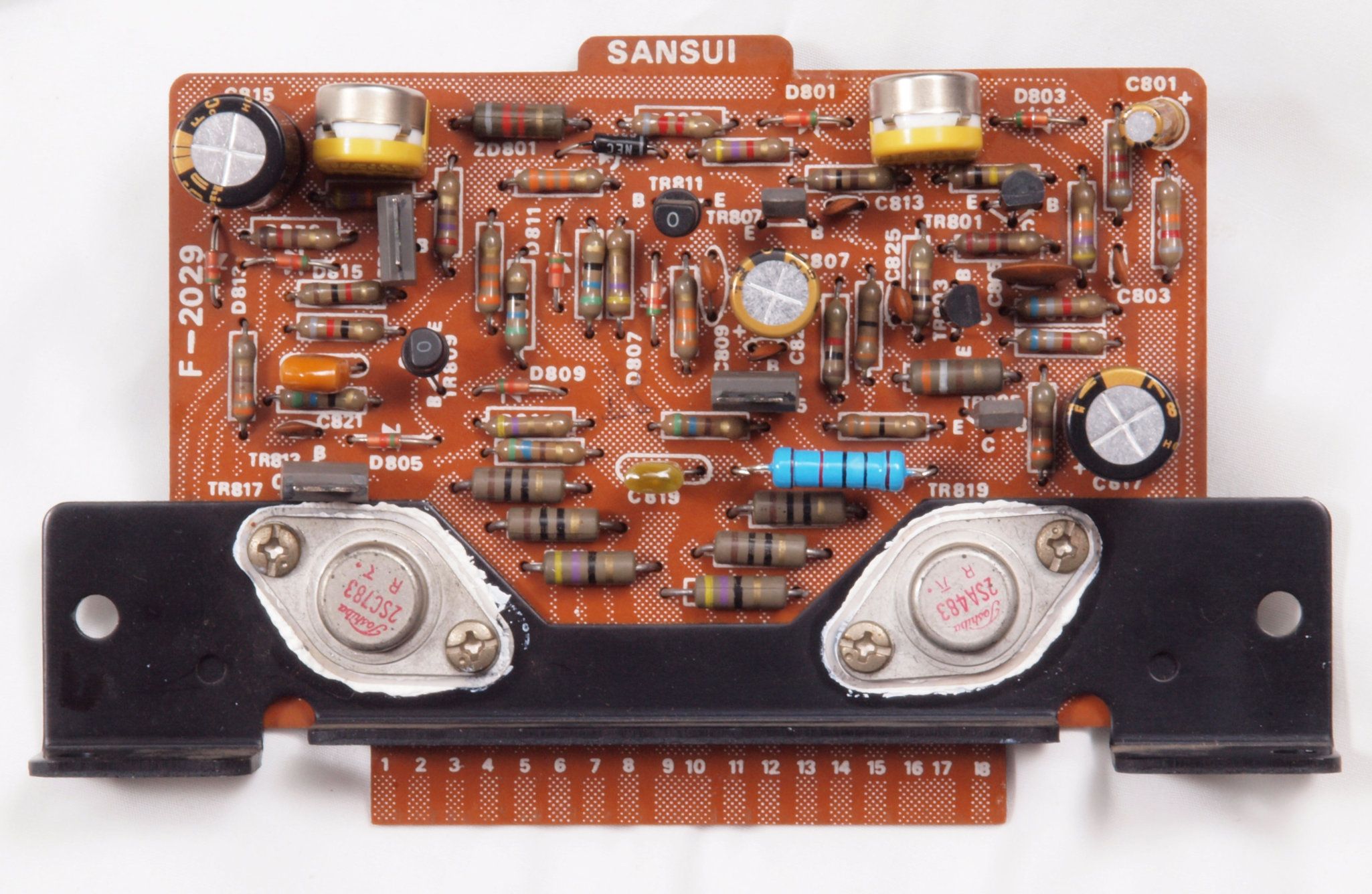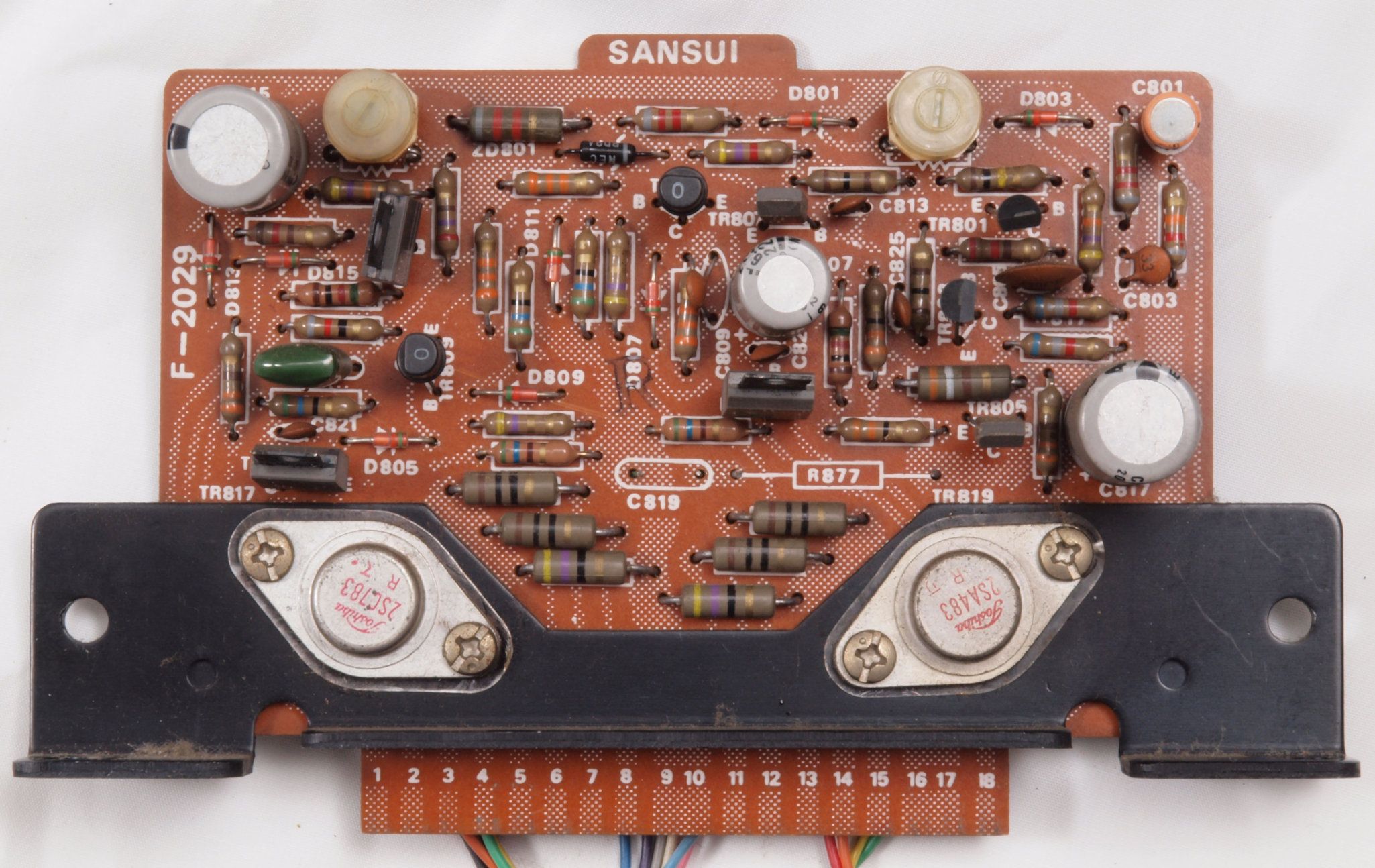 | C31. 修理前 L側終段基板。 半固定VR2個、TR(トランジスター)が2個交換されている。C819とR877が取り除かれている。 | ||||||||||||||||||||||||||||||||||||||||||
