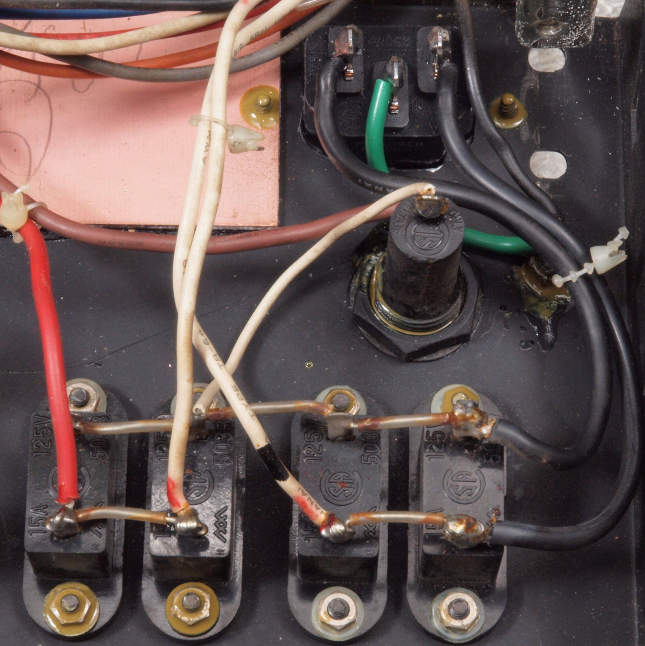 | CK5. 修理後 3Pインレット裏配線。 アースはしっかり取る。左側の基板は銘板の裏保護の為。 | ||||||||||||||||||||||||||||||||||||||||||