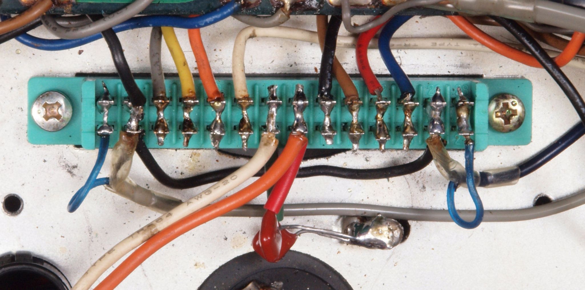 | A25. 点検中 左右AMP基板コネクターが腐蝕している、他2個も同様。下はYAMHA B1用の同型現行品。 | ||||||||||||||||||||||||||||||||||||||||||