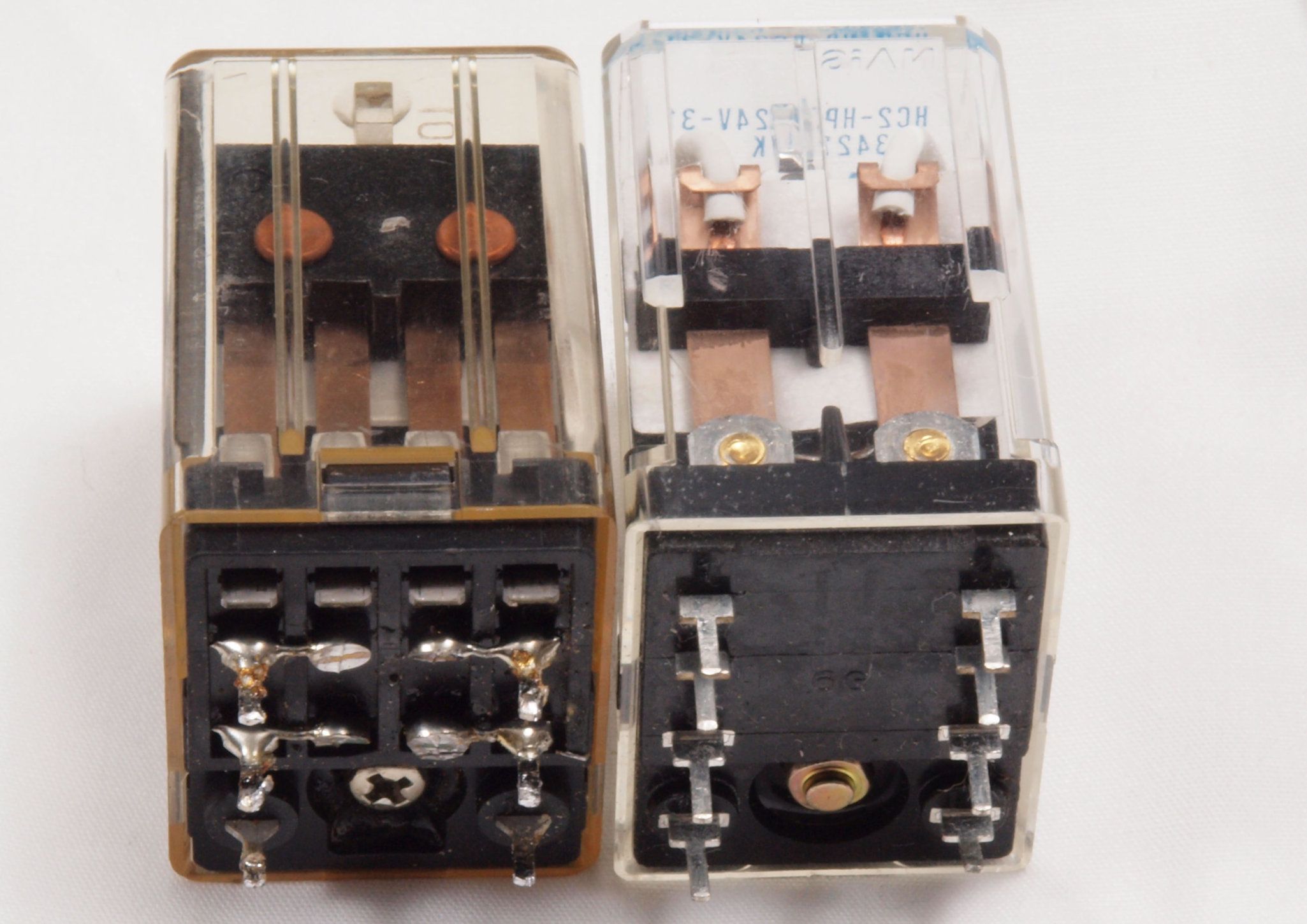| CP2. 交換部品、SP接続リレー。 左=付いていた接点5Aの物、右=交換した接点10Aの物。 リレー接点はパラレル接点にしても接点容量は倍にならない。 |