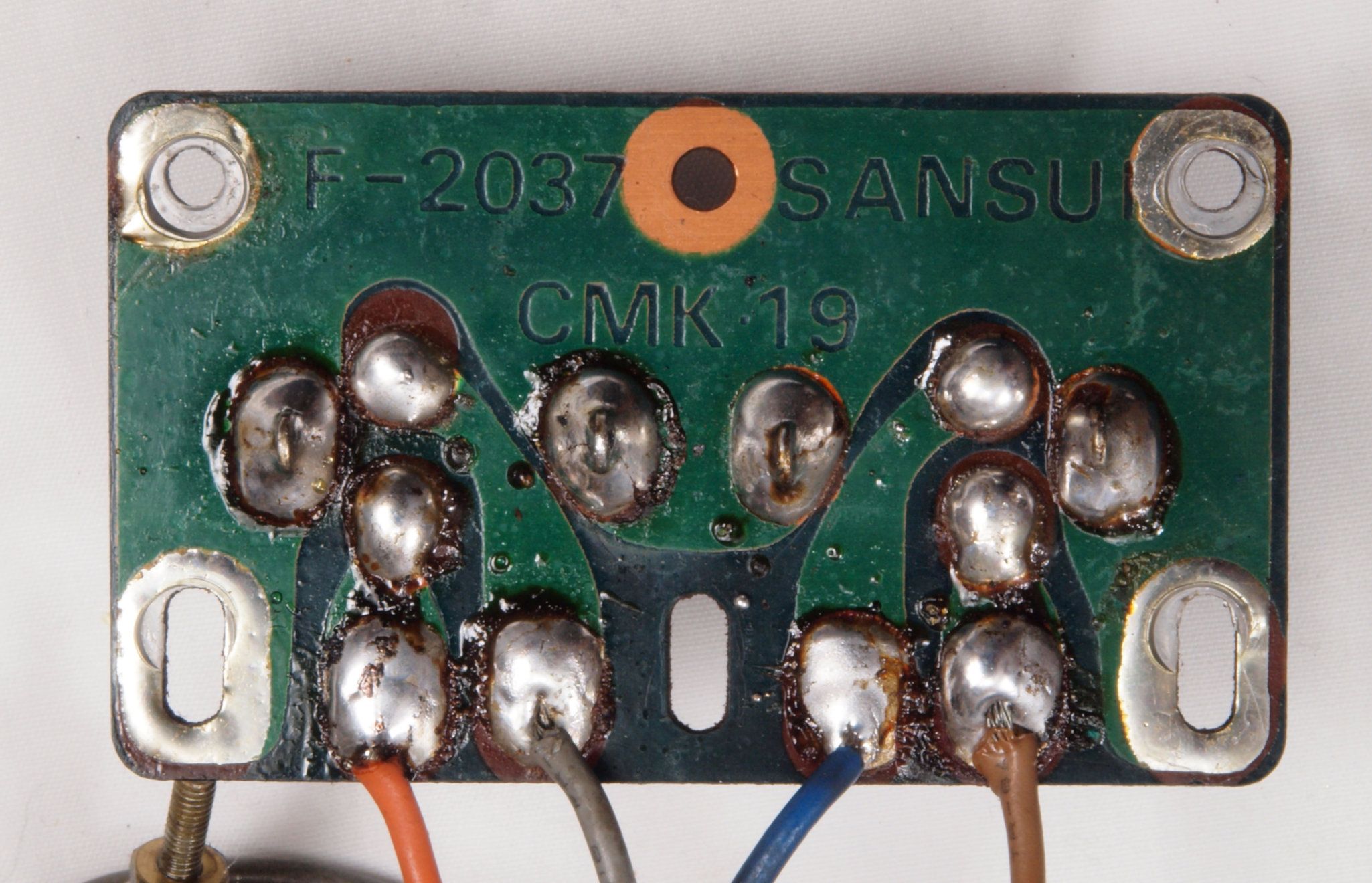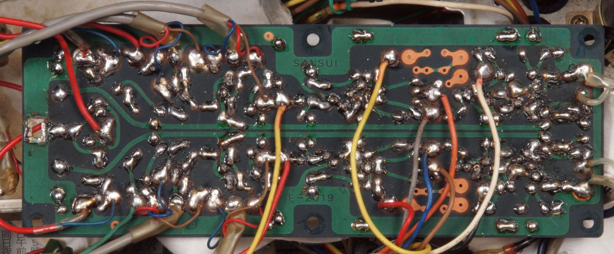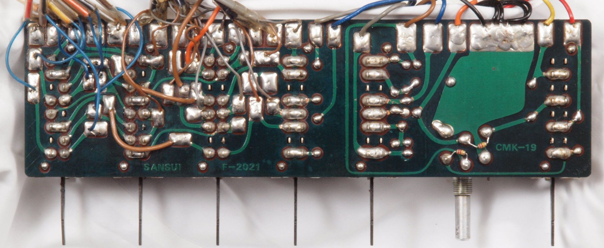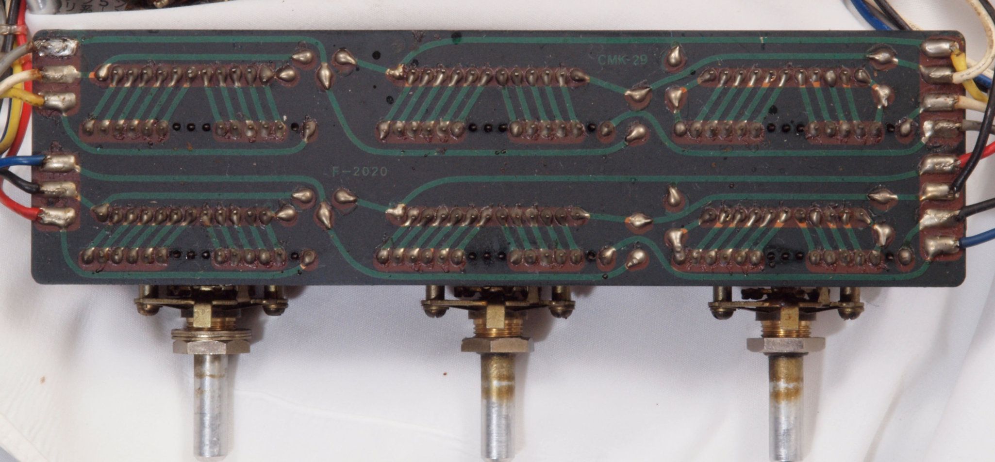 | C79. 修理前 TONE−VR基板裏。接点復活剤の多用で真っ黒。 | ||||||||||||||||||||||||||||||||||||||||||