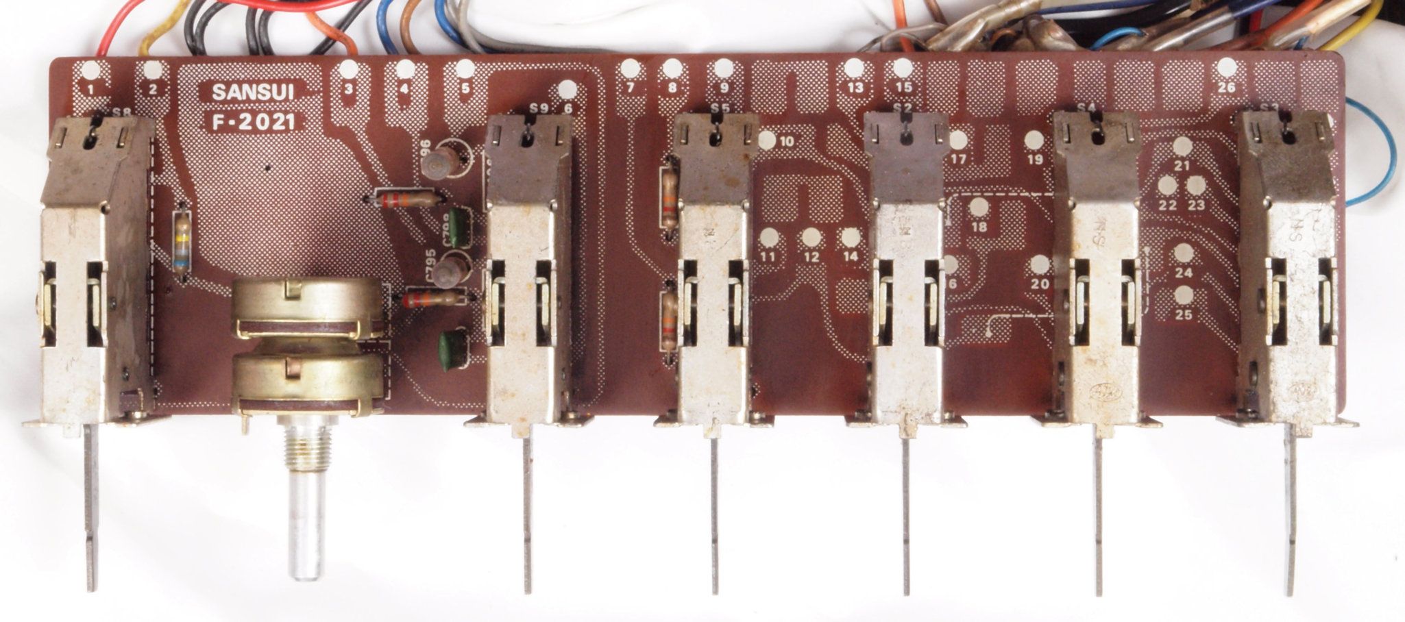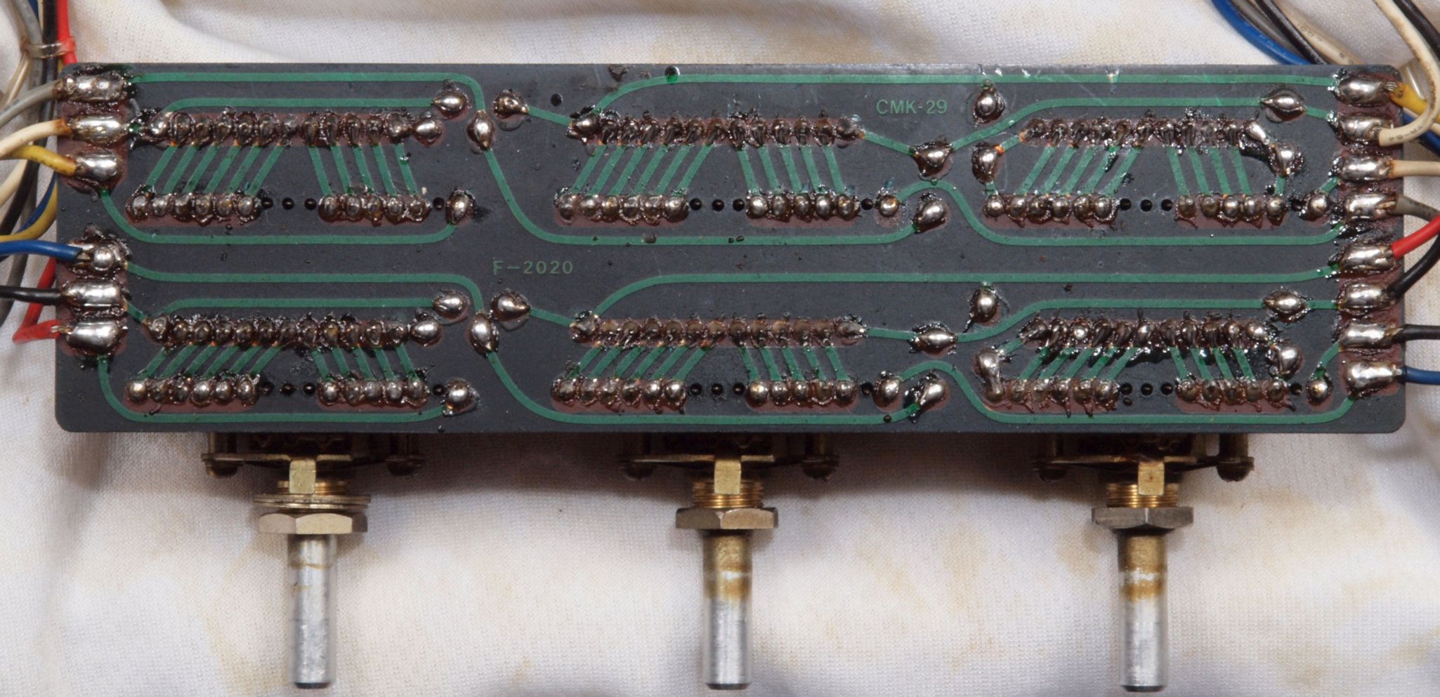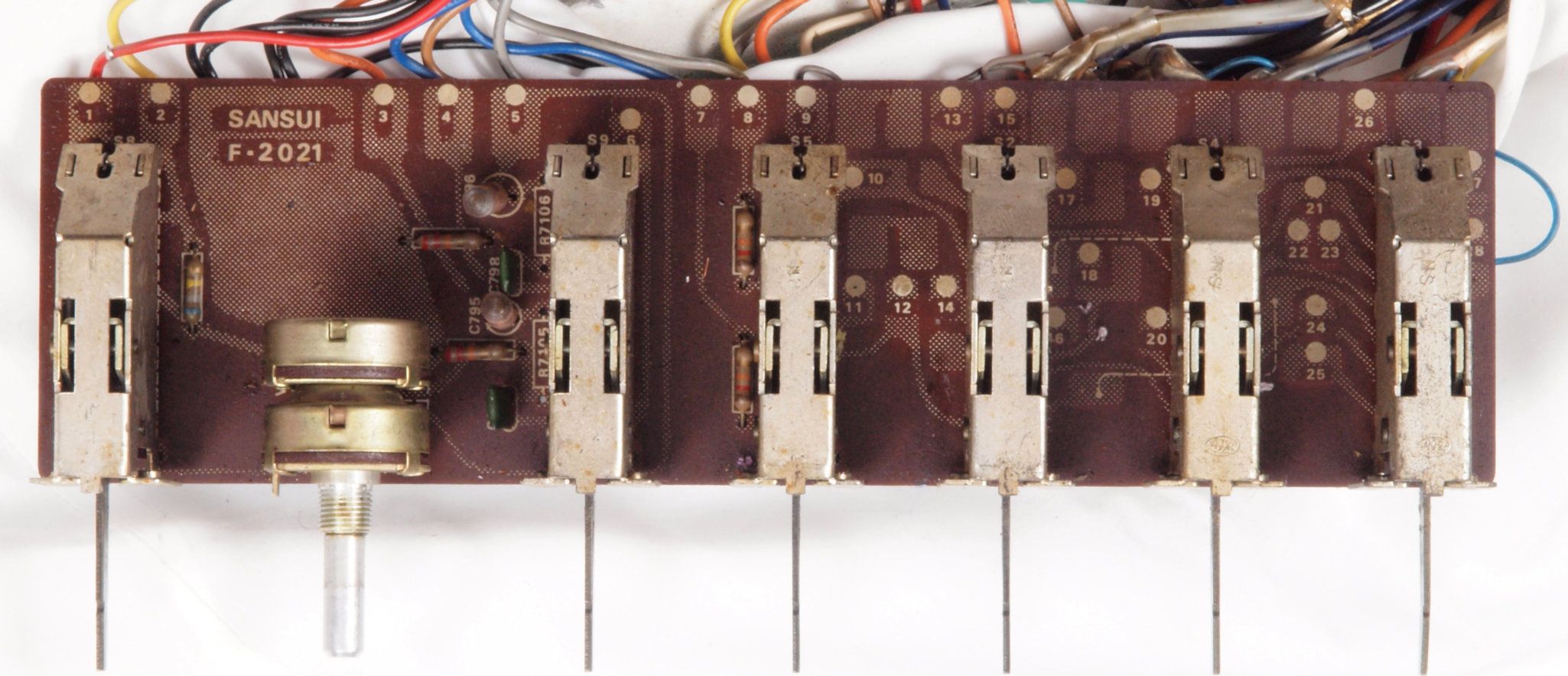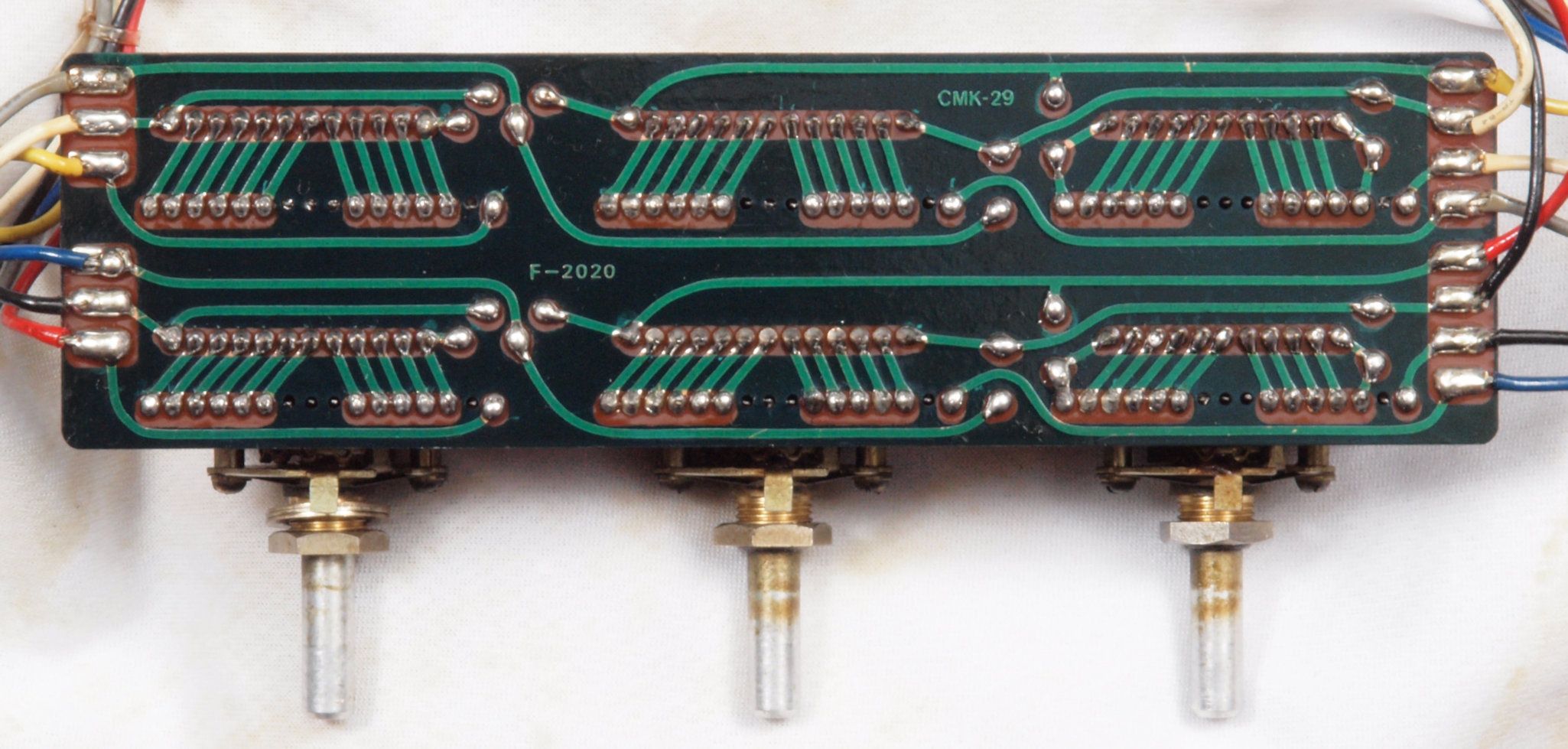 | C79. 修理前 TONE−VR基板裏。接点復活剤の多用で真っ黒。 | ||||||||||||||||||||||||||||||||||||||||||