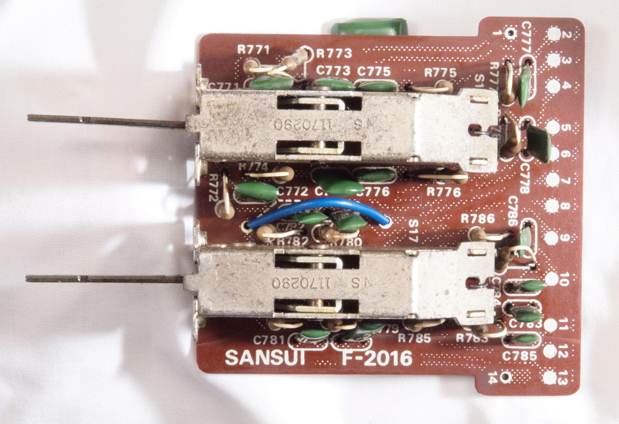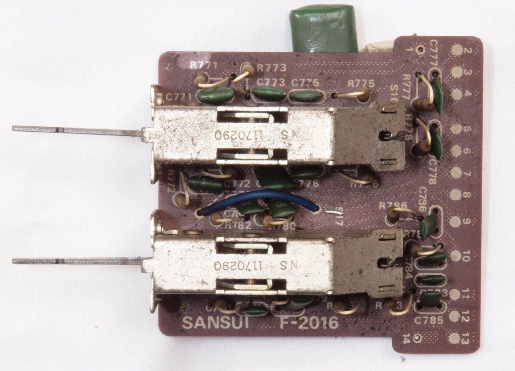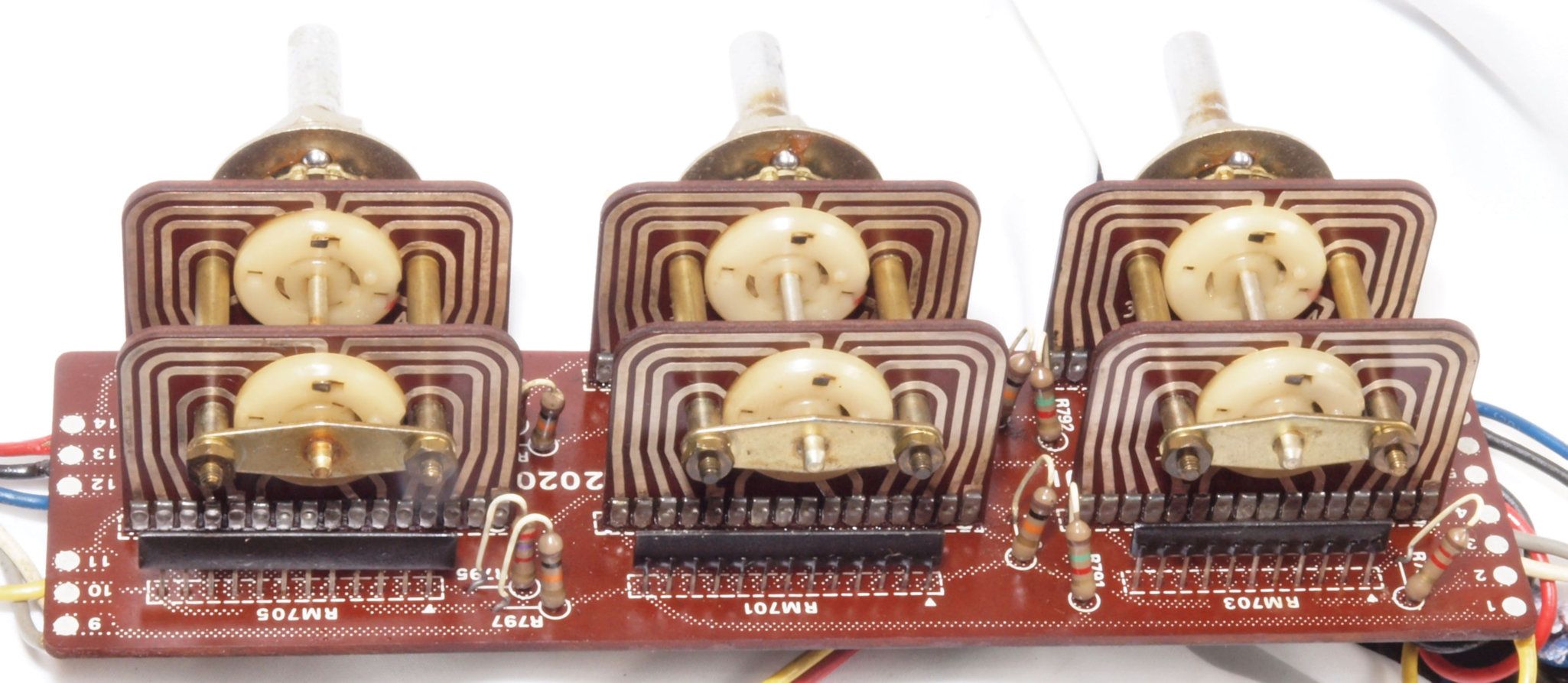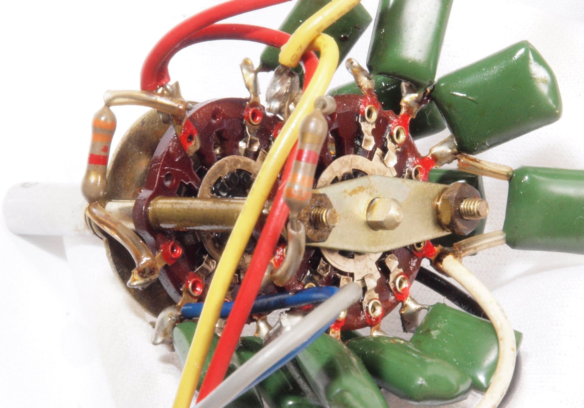 | CJ1. 修理中(洗浄)中 上=TAPE1入力VR、TEAP2入力VR,AUX入力VR基板裏。 下=PHONO−2入力抵抗選択SW。 共に軸を上に向けて洗浄する。 |