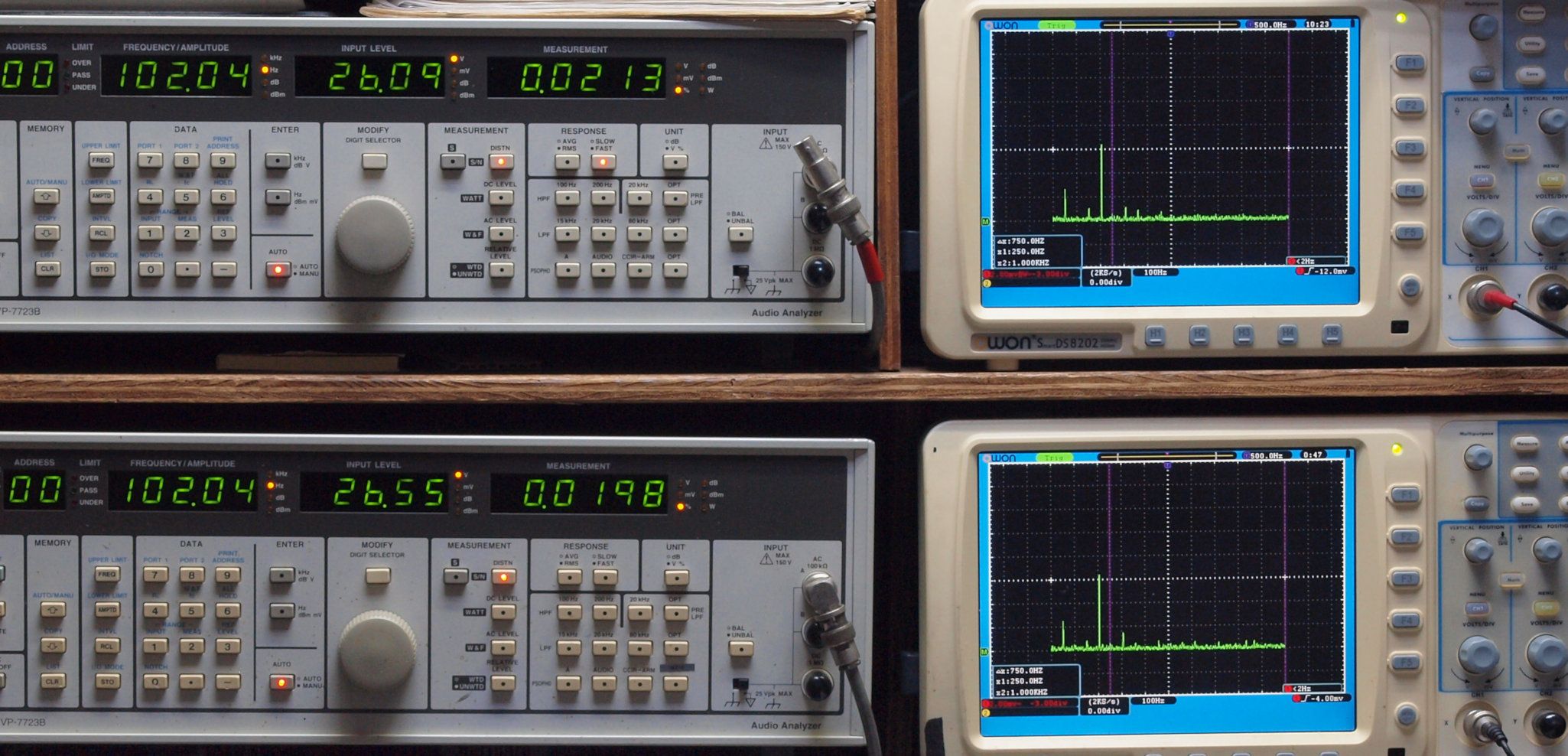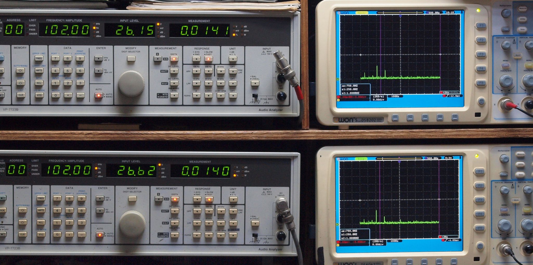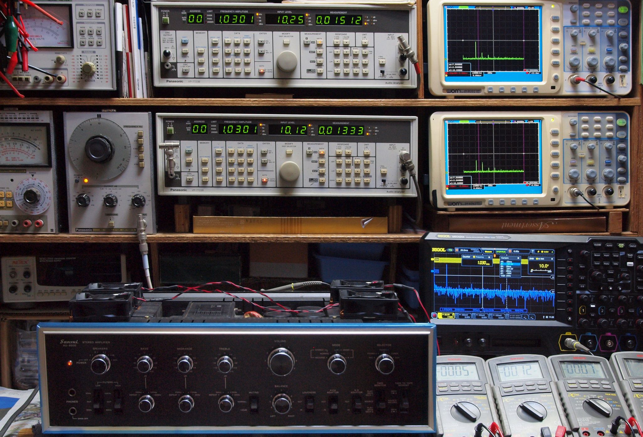| E. 測定・調整。 画像をクリックすると、大きく(横幅2050ドット)表示されます。 E0. 出力・歪み率測定・調整 「見方」。 上段中 右側SP出力を「Audio Analyzer Panasonic VP−7723B」により測定。 表示LED、 左端=メモリーNo、 中左=周波数測定、 中右=出力電圧測定、 右端=歪み率測定。 上段右端 VP−7723Bの基本波除去出力を「owon SDS8202(200MHZ)」で「FFT分析」表示。 下段中 左側SP出力を「Audio Analyzer Panasonic VP−7723B」により測定。 表示LED、 左端=メモリーNo、 中左=周波数測定、 中右=出力電圧測定、 右端=歪み率測定。 下段右端 VP−7723Bの基本波除去出力を「owon SDS6062(200MHZ)」で「FFT分析」表示。 下段左端 オーディオ発振器 VP−7201A より50Hz〜100kHzの信号を出し(歪み率=約0.003%)、ATT+分配器を通し、AMPに入力。 よって、ダイアル設定出力レベルより低くなります。測定機器の仕様や整備の様子はこちら、「VP−7723B」「VP−7201A」。 FFT画面の見方はこちら。 |