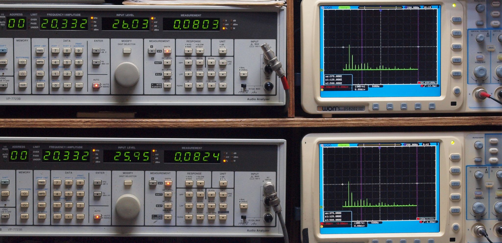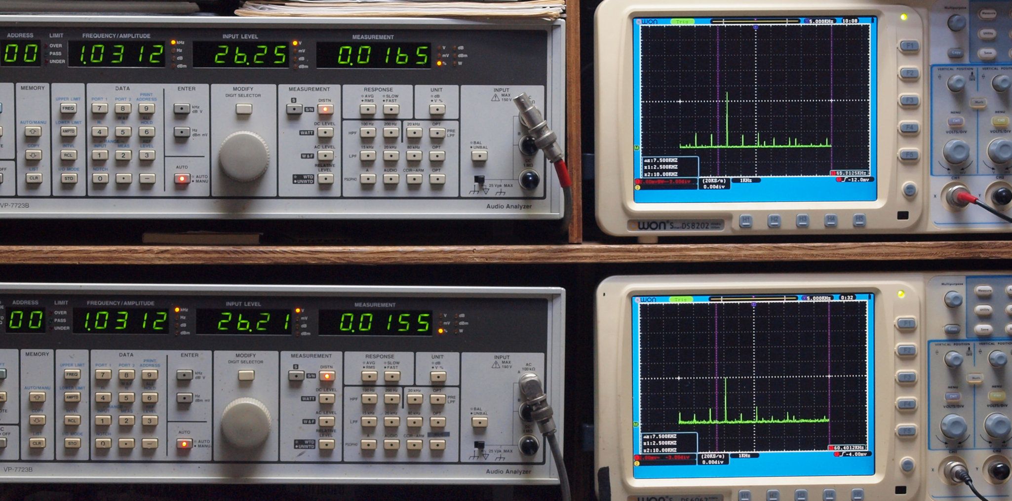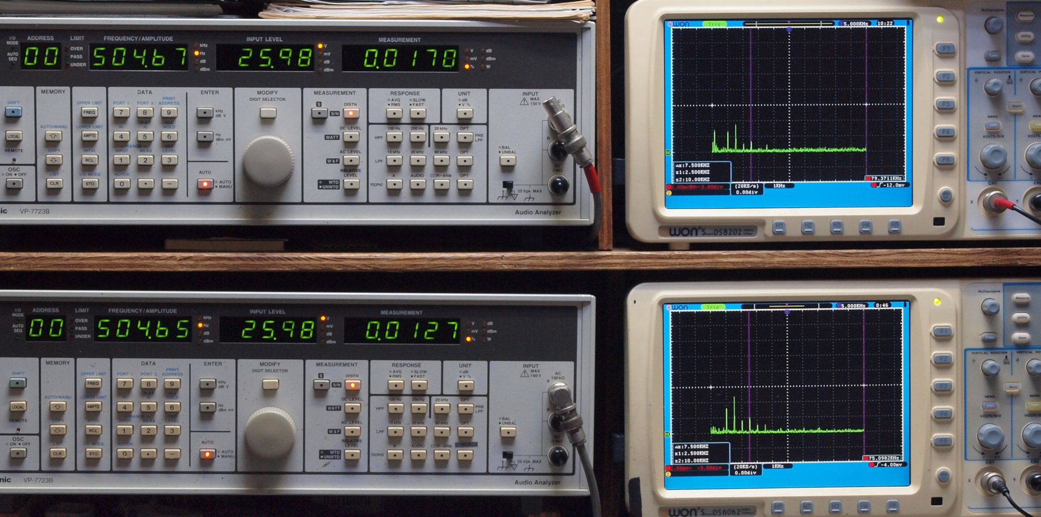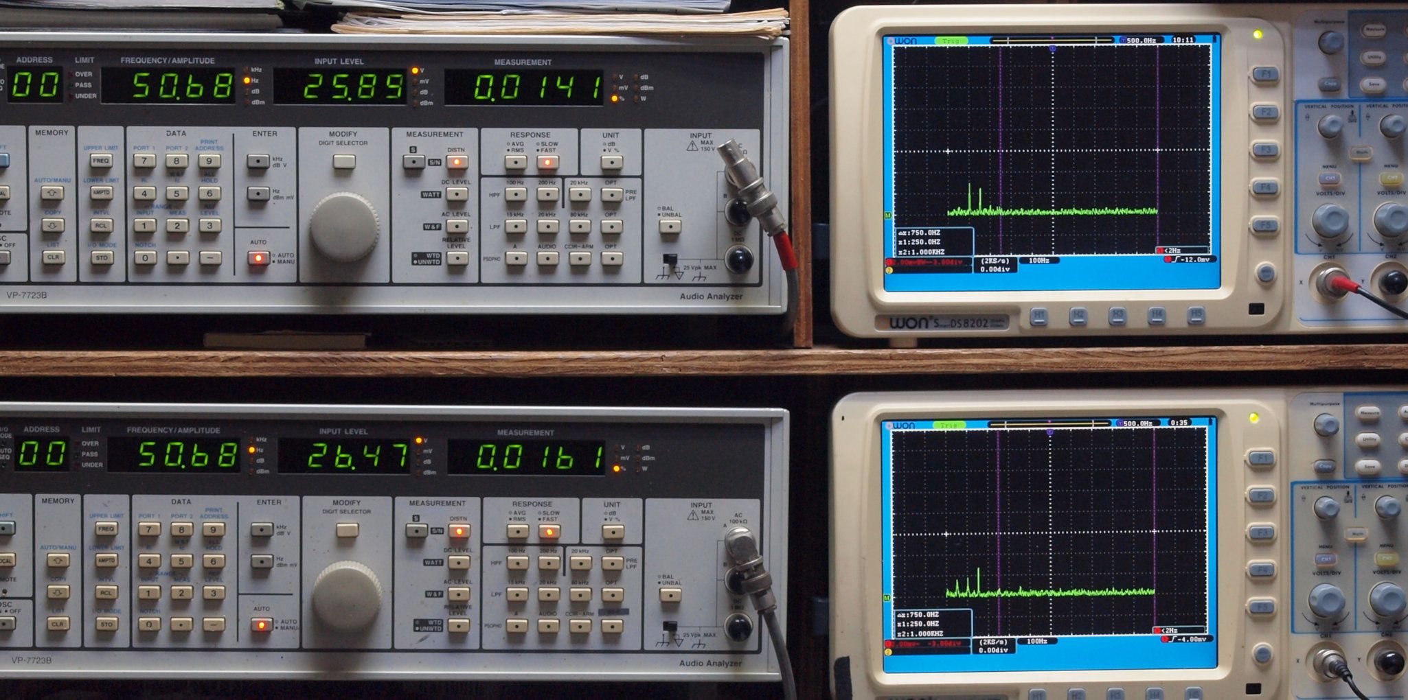 | E. 測定・調整。 画像をクリックすると、大きく(横幅2050ドット)表示されます。 E0. 出力・歪み率測定・調整 「見方」。 上段中 右側SP出力を「Audio Analyzer Panasonic VP−7723B」により測定。 表示LED、 左端=メモリーNo、 中左=周波数測定、 中右=出力電圧測定、 右端=歪み率測定。 上段右端 VP−7723Bの基本波除去出力を「owon SDS8202(200MHZ)」で「FFT分析」表示。 下段中 左側SP出力を「Audio Analyzer Panasonic VP−7723B」により測定。 表示LED、 左端=メモリーNo、 中左=周波数測定、 中右=出力電圧測定、 右端=歪み率測定。 下段右端 VP−7723Bの基本波除去出力を「owon SDS6062(200MHZ)」で「FFT分析」表示。 下段左端 オーディオ発振器 VP−7201A より50Hz〜100kHzの信号を出し(歪み率=約0.003%)、ATT+分配器を通し、AMPに入力。 よって、ダイアル設定出力レベルより低くなります。測定機器の仕様や整備の様子はこちら、「VP−7723B」「VP−7201A」。 FFT画面の見方はこちら。 |