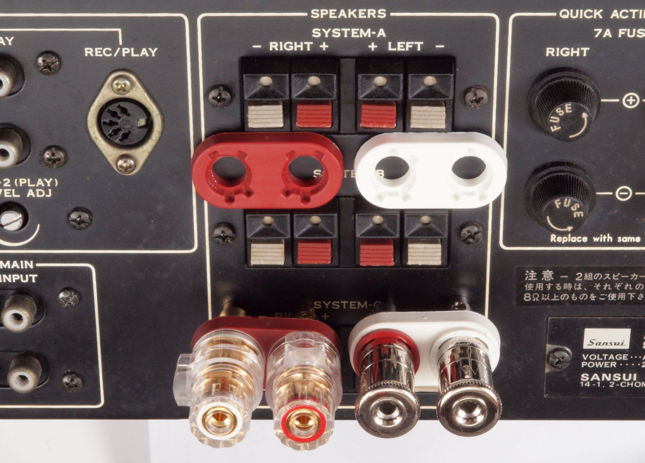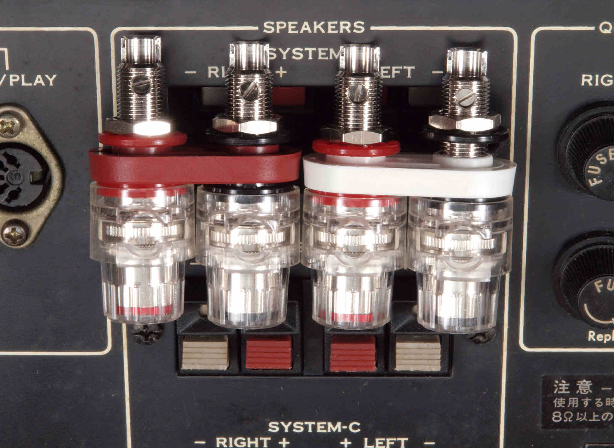 | CM4. 修理(交換)後 SP接続端子郡。軸は太く6mmは使用不可。 上=サンドイッチスペードWBT 0681Cuを挿す。下=WBT 0681Agを挿す。 |