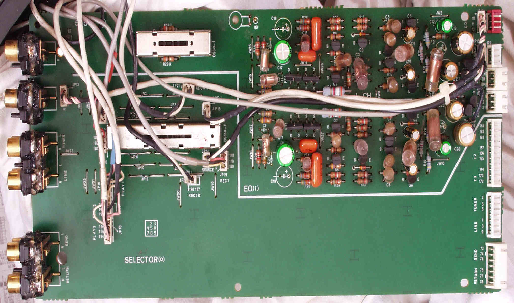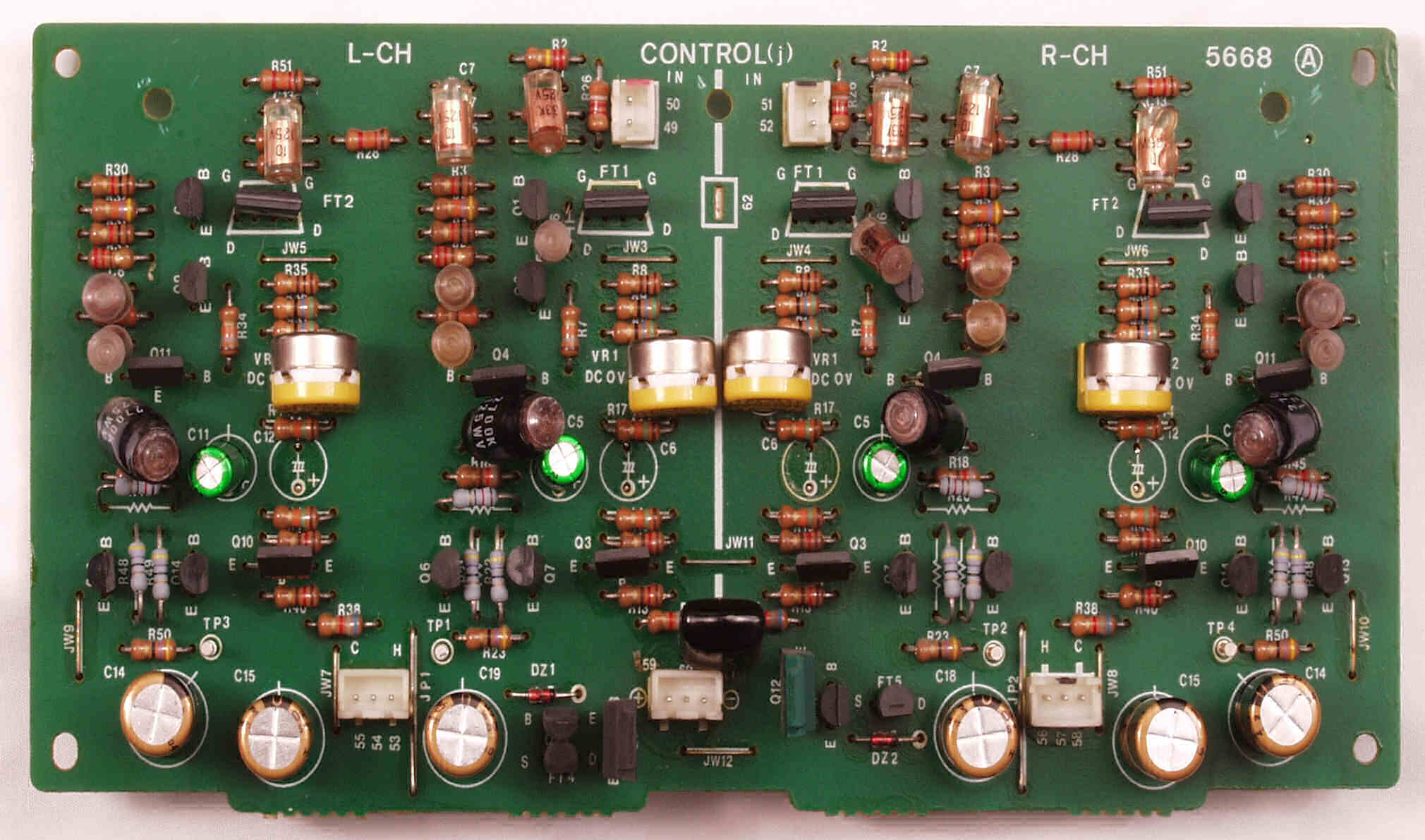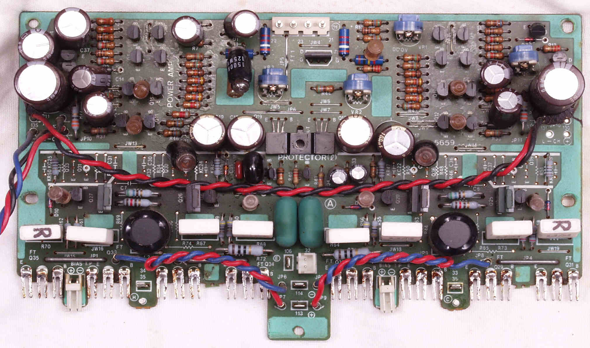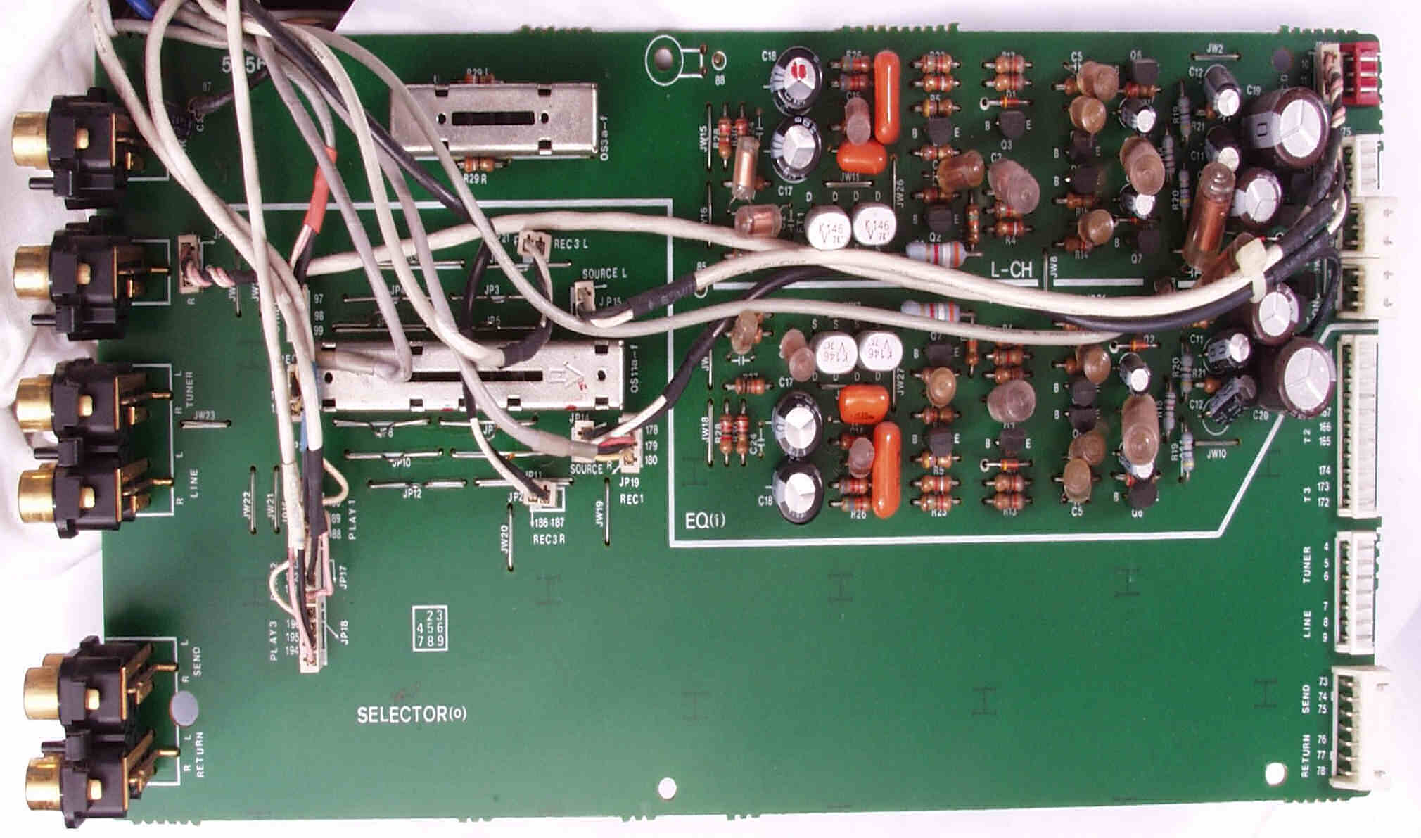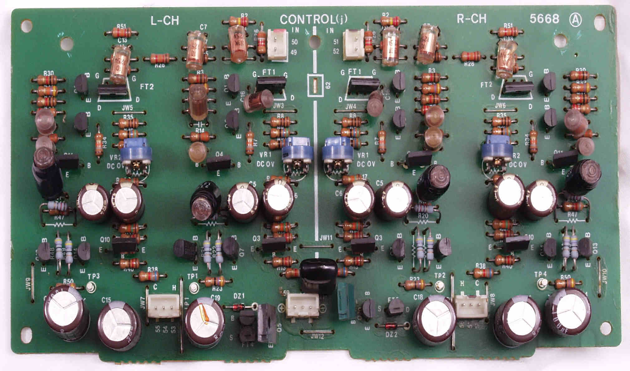 CF4. 修理後 L側終段基板 半固定VR4個、初段FET(電界効果トランジスター)、電解コンデンサ−16個交換