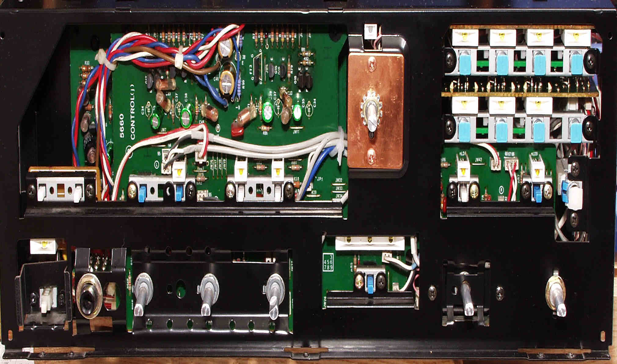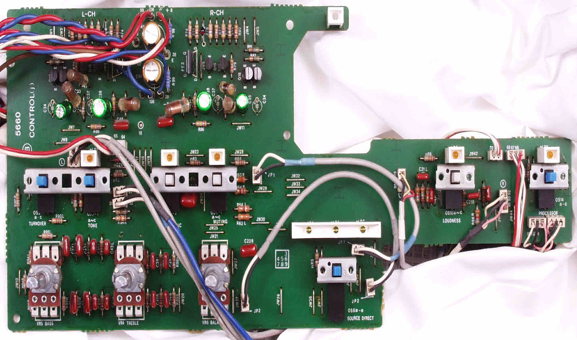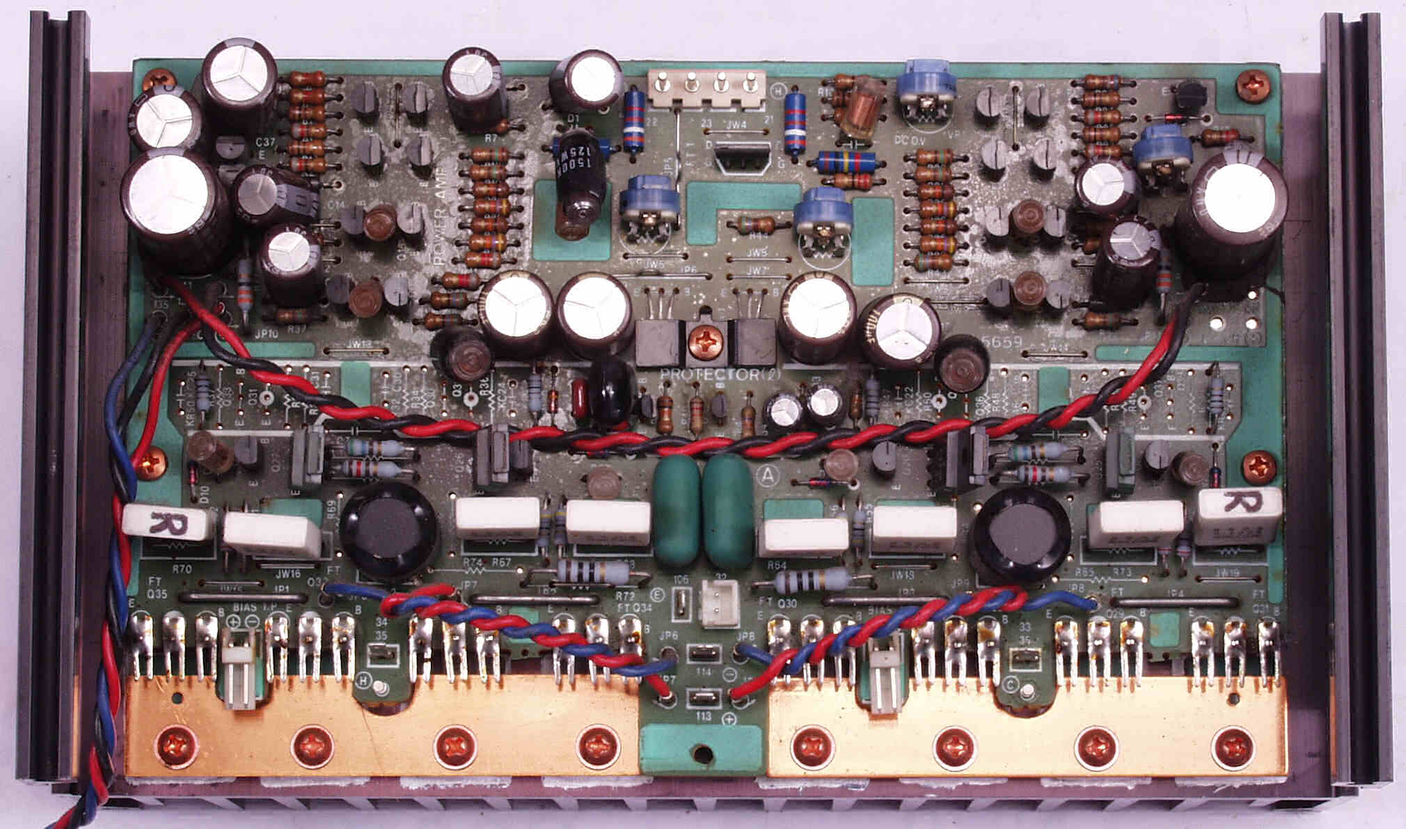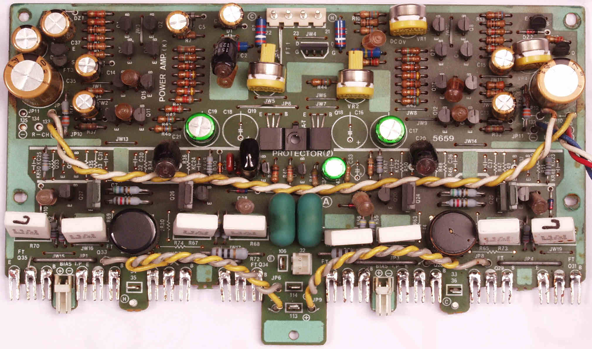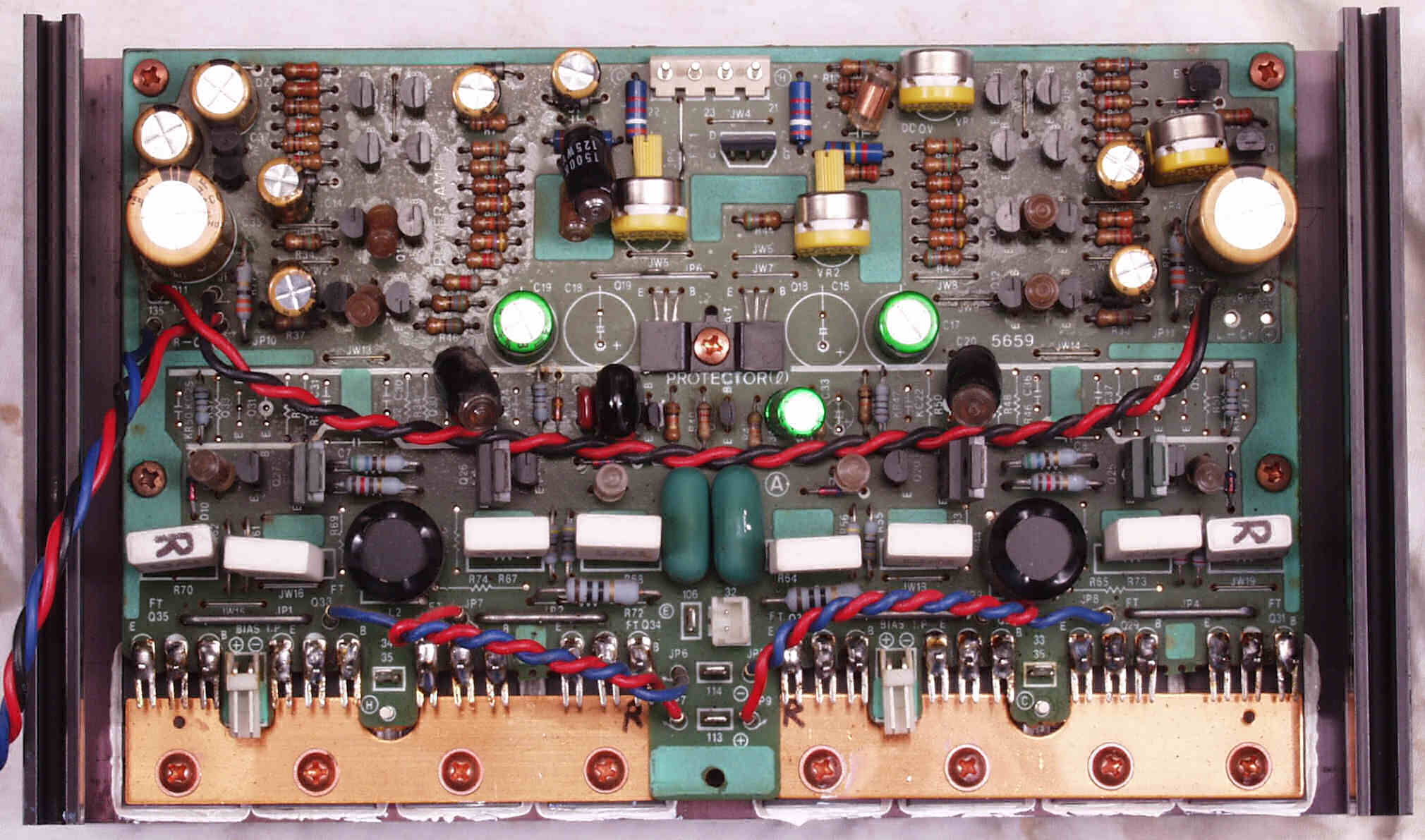 CF4. 修理後 L側終段基板 半固定VR4個、初段FET(電界効果トランジスター)、電解コンデンサ−16個交換