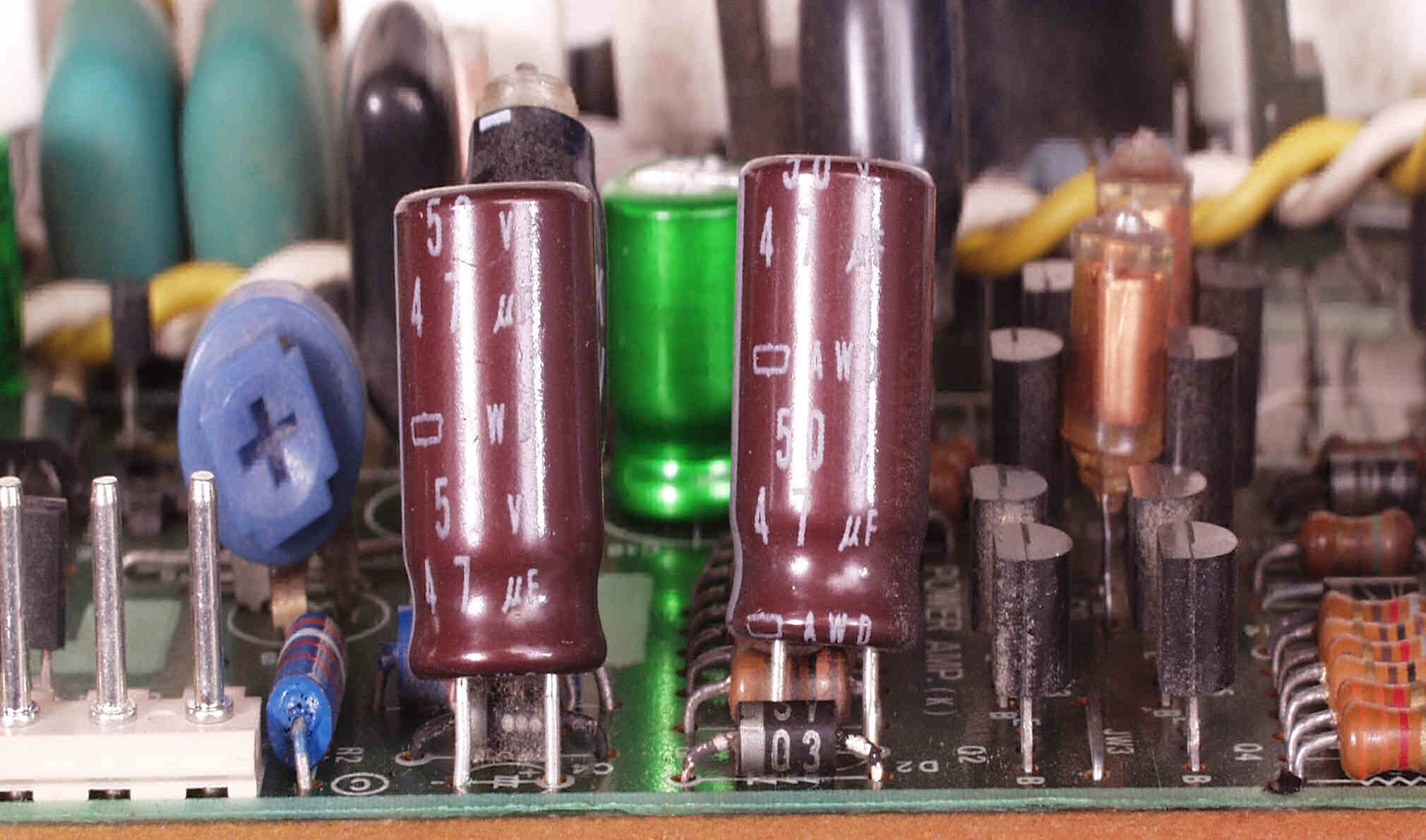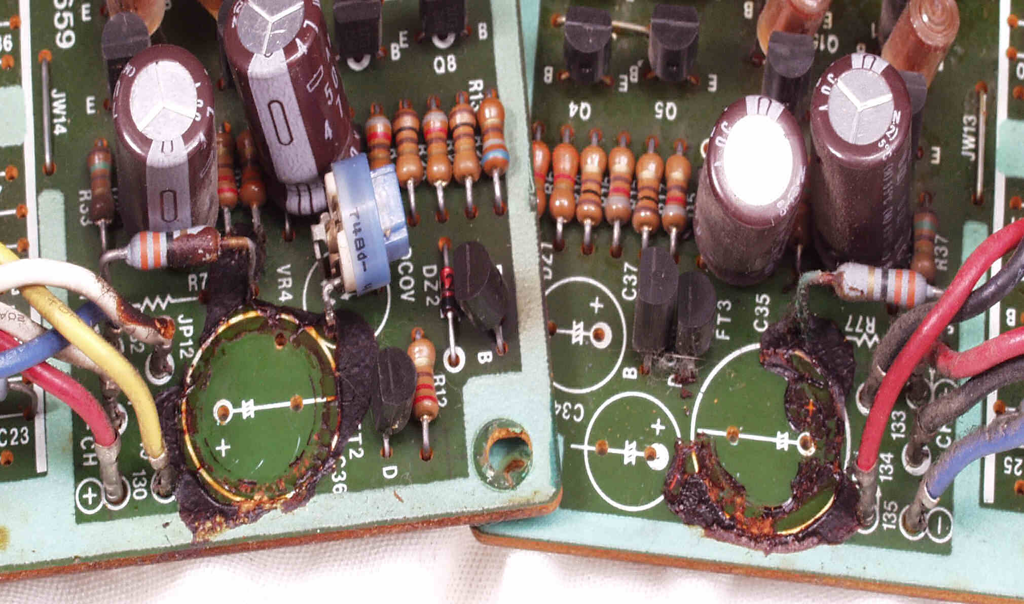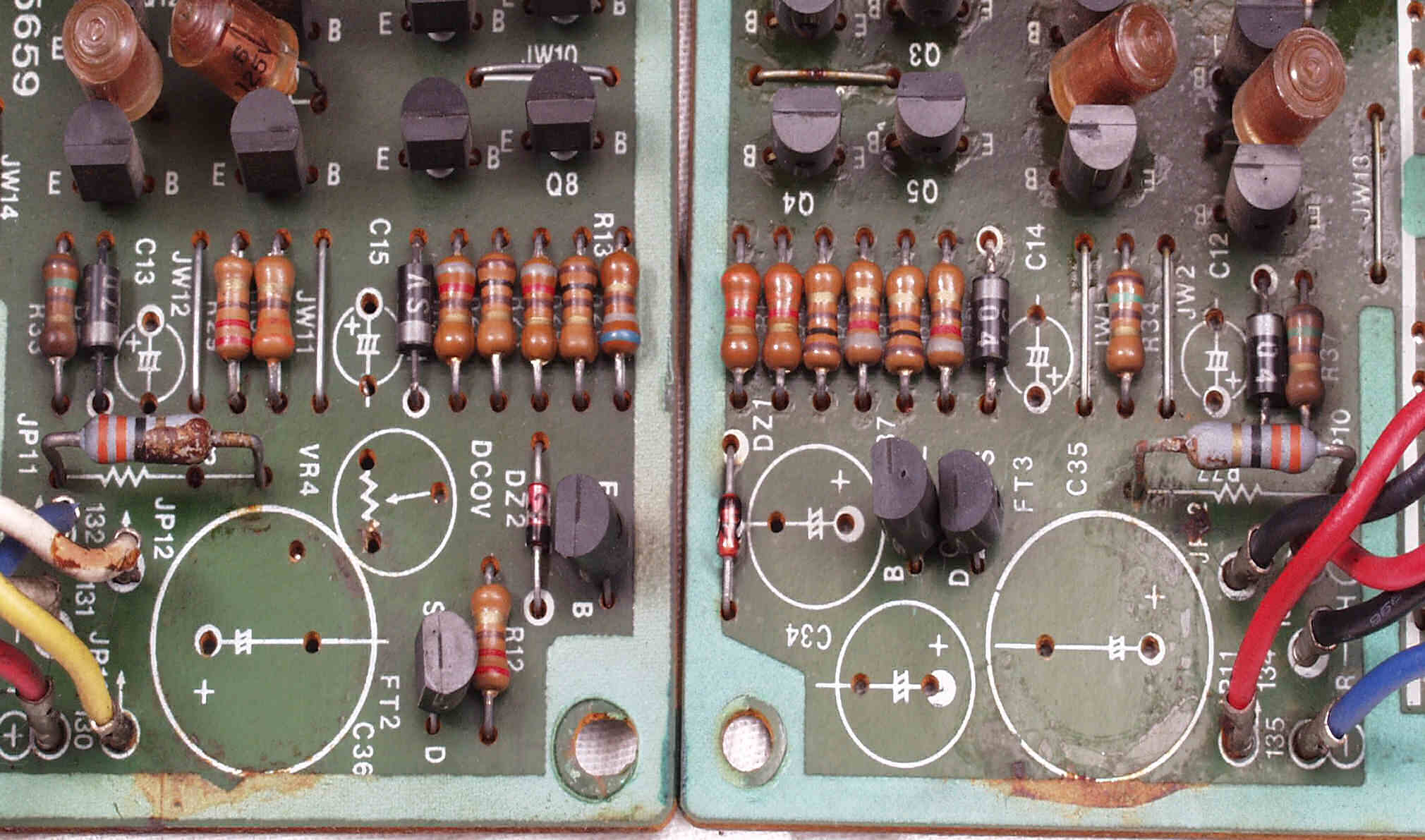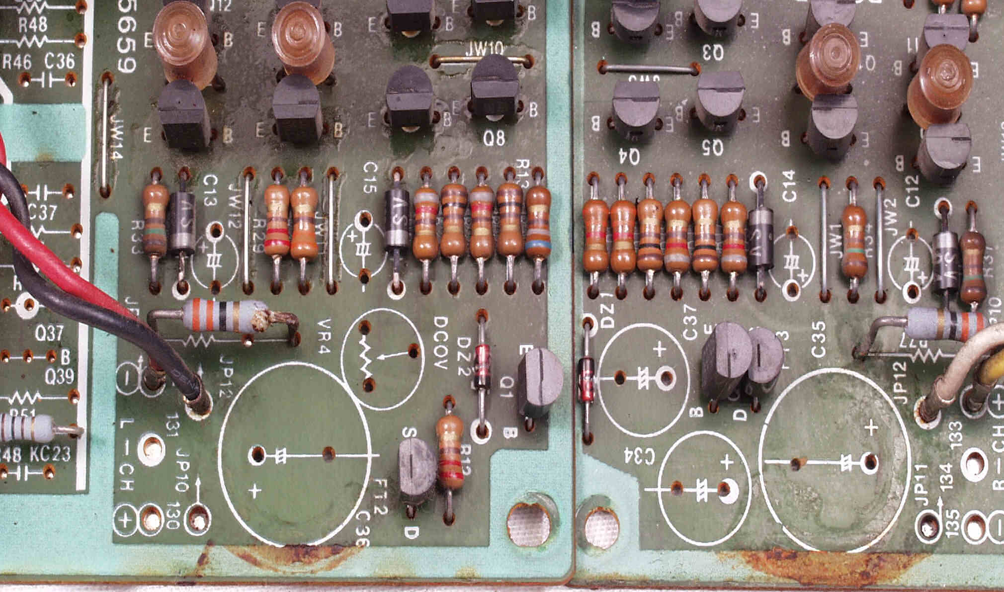 CE31. 修理前 R・L側終段基板 電解コンデンサーのブレ止めに使用した接着剤が抵抗やTR(トランジスター)の端子を腐食させている